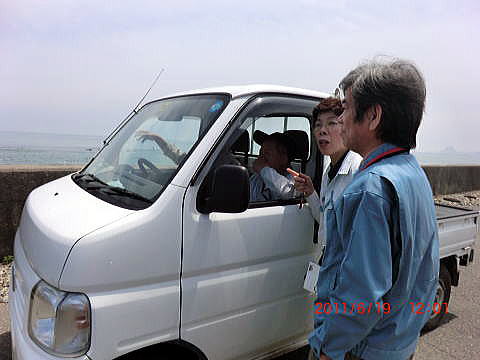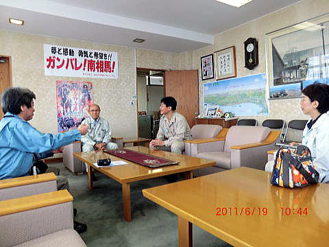2011年6月19日(日)、福島第一原発事故による放射線汚染の詳細調査と同時並行し、被災地の首長や住民との議論、インタビューなどを実施した。 詳細は別途とし、以下はスナップ写真と議論、インタビューの概要である。 1.被災地首長との徹底議論 2011年6月19日(日)、南相馬市役所を訪問し、櫻井市長と国、県との防災をめぐるやりとりとその課題、福島第一原発事故による放射線汚染問題、とくに20km警戒区域設定をめぐる問題、自衛隊による瓦礫撤去、さらにこれからのまちづくりなどについて徹底議論した。 ![]() 南相馬市櫻井市長(左)、青山貞一、池田こみち(右) 撮影:鷹取 敦 ![]() 南相馬市櫻井市長との議論 撮影:鷹取 敦 ![]() 櫻井勝延(南相馬市長) 撮影:鷹取 敦 ![]() 青山貞一(東京都市大学) 撮影:鷹取 敦 ![]() 青山貞一(左)、 櫻井勝延南相馬市長、 高邑勉衆議院議員、池田こみち(右) 撮影:鷹取 敦 2.太田神社訪問・宮司との議論 「相馬野馬追」で有名な南相馬市にある相馬太田神社を訪問し、今年の行事について伺う。 相馬野馬追(そうまのまおい)は、旧相馬藩領(福島県浜通り北部)で行われる神事および祭りで、神事に関しては国の重要無形民俗文化財に指定されている。東北地方の夏祭りのさきがけと見なされ、東北六大祭りの1つとして紹介される場合もある。 2010年(平成22年)までは、毎年7月23日・24日・25日の3日間の日程で神事と祭りが一体となって開催されていたが、2011年(平成23年)より祭りと神事は日程が分離され、祭りを7月最終週の土曜日開幕、神事を24日・25日に日にち固定で実施することが決まっていた。 しかし、東日本大震災により一旦行事が取りやめとされたが、その後、規模を小さくして実施することになったという。 ![]() 相馬太田神社にて宮司と ![]() 相馬太田神社にて 左から斉藤さん(南相馬住民)櫻井勝延市長、青山貞一、池田こみち 撮影:鷹取 敦 ![]() 相馬太田神社にて 左から青山貞一、櫻井勝延市長、池田こみち 撮影:鷹取 敦 3.南相馬市鹿島区南海老地区の被害状況・被災者インタビュー 南相馬市の海岸線を県道74号線で北上し、相馬市との市境まで進んでみた。県道74号線の両側には水田が広がり、農家が点在していたが、すべて津波で流され、荒地と化していた。 しかし、2000人規模の自衛隊がガレキの処理を既に済ませており、きれいに片付いていた。南相馬市では41kuが津波で浸水しており、その大部分が農地であったことが見て取れる。そこは南相馬市鹿島区南海老地区である。 市境の北端部はやや高台となっており、海岸線に出てみると、テトラポットは激しく破損され、堤防も道路もずたずたの状態だった。頻繁にパトカーが巡回し、見回りをしている様子だった。 ![]() 撮影:鷹取 敦 梅雨のさなかにも拘わらず太陽が顔を出し夏の陽射しに海が美しい。そんな中、南海老地区の海岸には数名の釣り人が集まっていた。車を降りて道路や家屋の被害の状況を見ていると、軽トラックに乗った二人の男性が海や被災地を眺めていたので声を掛けてみると、堰を切ったように被災の状況を話し出した。 ここは南海老という地区で、北端の高台には70世帯が暮らしていたが、すべて流されてしまった。亡くなったのは高齢者というより、若い人が多かった。地震直後に車で自宅の様子を見に戻った直後、津波に襲われ、車ごと流された人が多い。 この地区では20名以上が亡くなっており、まだ3名近く行方不明だ。津波直後に集落の高台にある墓地に逃げた人によると、引き波で、一旦海の底が見えるほど沖のテトラポットの防波堤まで水が引き、その後、高台の松の木のてっぺんを越える大津波が襲った。車で地区の運動場(かなり高台)に逃げた人はそこで津波をもろに受け、車ごと裏のため池に流されそこで大勢が亡くなった。 ![]() 撮影:鷹取 敦 海に面して建っていた家は友達の家だが、土台も残らないほど流されてしまった。今は、地区の人たちはバラバラになってそれぞれ避難している。これほどの被害にあうとは、悲しいを通り越してもう笑う以外にないほどだ。 幸い、この地区は海に面しており、一年を通じて東風が強く、原発からの放射能は低い。震災後、立派な椎茸ができたので、みんなで食べてしまい、放射能が高かったらと心配したが、保健所に聞いたら60歳以上は問題ないと言われ、一安心した。年寄りはまだしも子供たちが心配だ。 堤防から数十メートル先に作られたテトラポットの防波堤の上には船に合図を送る小さな灯台が3カ所取り付けられているが、そのうちの一つは津波前にはひっくり返っていたのに、津波でまっすぐに起きあがってしまった。 相馬市との境の農地だったところは、今では湾のように水がまだ引かない。 4.大甕地区にある産廃処分場建設現場視察 南相馬市大甕地区では10年以上前から産廃処分場、焼却場建設問題で地域住民と業者が対峙している。櫻井市長も市長、議員になる前からこの問題に住民運動のリーダーとして尽力されている。その現場に住民