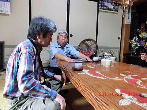 ![]() 南相馬市大甕の産廃処分場建設現場視察 左から池田こみち、青山貞一、地域住民(斉藤さん) 撮影:鷹取 敦 5.二本松の被災地住民との徹底議論 中通りの二本松市で地震、原発事故による放射線汚染で被災している渡辺さん宅におじゃまし、被災状況、現在の状況などについて具体的にお話を伺った。 ![]() 二本松市で被災した住民(渡辺さん)インタビュー 左は青山貞一 撮影:鷹取 敦 原発事故以来、住民の間でも個人的にガイガーカウンターをネットで購入する人が増えている。渡辺さんもその一人だ。ネット通販で購入した中国製のガイガーカウンターで敷地内や家、経営する工場の中などあちこち測定してみたが、測定器の不具合があって、返品してしまい、今は、交換品の到着待ちということだった。 ![]() 二本松市で被災した住民(渡辺さんの奥様)インタビュー 右は池田こみち 撮影:鷹取 敦 自宅は息子夫婦と小学生の孫二人の六人暮らし。代々受け継いだ土地、三世代同居でのふるさとでの暮らし自慢でもある。裏山には和牛6頭も飼っている。それに、番犬の柴犬といつの間にか住みついてしまった野良猫が玄関番をしている。敷地内の農地では自家用の野菜を栽培し、井戸水も利用している。 そこに突然の震災と原発事故。地震では屋根瓦の落下、土蔵の土壁の落下、浄化槽の破損などの被害があったが、原発からは直線距離にして60km近くも離れていることから、まさかここまで放射能が来るとは思わなかったと嘆く。 ![]() 二本松市で被災した住民(渡辺さん)インタビュー 撮影:鷹取 敦 原発爆発から一ヶ月後にはさっそく知人から借りてきた測定器で自宅周辺や室内を測ったところ、玄関前で約25μSv/hなど、非常に高い値が検出され、衝撃を受けたという。その頃、原発立地地域からは多くの被災者が二本松にも避難していた。二本松はほんとうに大丈夫なのか、孫たちの健康も気がかりだった。飯舘村、川俣町を経て二本松に至る国道114と県道62号の分岐点に位置する川俣町山木屋地区はホットスポットであることが判明し、すでに住民が避難していた。 渡辺さんは、小さい頃に弟さんを白血病で亡くされたとのことで、原発からの放射能汚染はことのほか気がかりだと言う。 ![]() 二本松市で被災した住民(左、渡辺さん)インタビュー 撮影:鷹取 敦 そろそろ息子さんに仕事をゆずって牛を飼ったり、やりたいことをやるのが夢だったと語る渡辺さん。自宅のすぐ近くで建設が予定されている産業廃棄物処分場に反対する市民運動では地区のリーダー役として活躍してきたが、県や裁判所のこれまでの対応には大いに憤慨している一人である。そして、今後、原発で人が居なくなり、土地も安くなって福島県が産廃業者の格好の立地場所として狙われるのではないかと危惧している。 ふるさと福島がふたたび地域の絆で結ばれ、美しい山河、四季の自然に恵まれた農村の風景を次世代にも守り伝えていけるように、なんとか頑張っていきたいと話していた。 ![]() 二本松市で被災した住民(右、渡辺さん)インタビュー 撮影:鷹取 敦 |