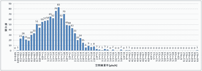 福島市の一斉調査結果はほぼ正規分布しているが、私たちが中心市街地で測定した結果(1.34〜2.25、いずれも地上1m)もほぼ平均値(1.5〜1.6)を挟み両側30%の範囲にあることが分かった。 小中学校が多い福島市中心市街地の放射線量は、原発事故から3ヶ月以上を経過し、60km以上離れているにもかかわらず、総じて非常に高いことが分かった。 つづく |