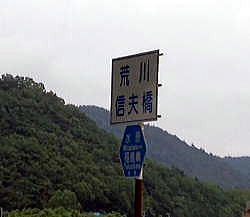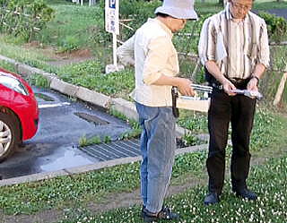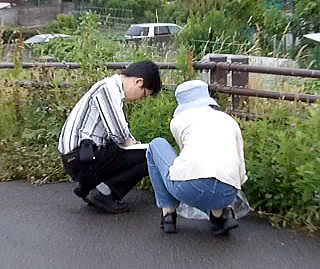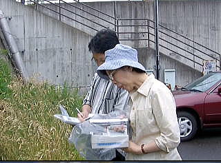 次は県道148号が荒川を渡る信夫橋の北側土手2カ所で測定する。 ![]() 荒川信夫橋の標識 ![]() 荒川にかかる信夫橋土手で測定する鷹取、池田 撮影:青山貞一 荒川にかかる信夫橋土手で測定する鷹取、池田 撮影:青山貞一 結果は以下のように、2カ所とも非常に高い。とくに側溝では6.8μSv/hと今回調査の現時点での最高値を記録する。 表 福島市街地の固定測定放射線量(2011.6.19) 単位:μSv/h