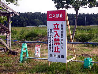 ●南相馬市の警戒区域で測定 その後、相馬太田神社を最後に櫻井市長と別れ、車で県道169号線を東へ向かい、南相馬市と浪江町の境界近くまで行く。 途中、 県道169号線を離れ、南相馬市内の20km圏の警戒区域の線上を視察する。20km境界線は、原町区と小高区の境界線から3kmほど北に行ったところにある。 ところで、下の地図にあるように南相馬市は鹿島、原町、小高の3つの基礎自治体が合併してできた自治体である。 ![]() 南相馬市全図。 下は多珂神社近くの警戒区域の線上にある牛舎。この牛舎はギリギリ警戒区域外となっていた。 ![]() 多珂神社近くの警戒区域の線上にある牛舎 撮影:鷹取敦 ![]() 多珂神社近くの警戒区域の線上にある牛舎 撮影:鷹取敦 このあたりは、市道をどこに行っても、下の写真にある立入禁止の看板があり、それ以上入れなかった。 ![]() 常磐線近くの北川原にある警戒区域の立入禁止看板 撮影:鷹取敦 この辺の放射線量は、警戒区域のすぐそばだが、0.46μシーベルト/hと低い。 ![]() 多珂神社近くの警戒区域の立入禁止看板近くの放射線量 撮影:鷹取敦 さらに浪江町に向かって国道6号線を南下する。そしてついに20km圏「警戒区域」の線上に到着する。 機動隊に車を止められ、許可書の提示を求められる。 ![]() 国道6号線の南相馬市小高地区から北に3kmほどの位置にある警戒区域バリケード 撮影:鷹取敦 ![]() 国道6号線の南相馬市小高地区から北に3kmほどの位置にある警戒区域バリケード(ビデオより切り出し) 撮影:青山貞一 ![]() 国道6号線の南相馬市小高地区から北に3kmほどの位置にある警戒区域バリケード 撮影:青山貞一 今回、許可書は持っていないこともあり、ここで南下を諦め、警戒区域線上で放射線の測定を行う。 ![]() 国道6号線の南相馬市小高地区から北に3kmほどの位置にある警戒区域バリケードを背景に 撮影:鷹取敦 南相馬市南端20km圏の境界線上 動画撮影:青山貞一 南相馬市南端20km圏の境界線上で測定 動画撮影:青山貞一 ここは、警戒区域でありながら案の定、放射線量は平均値で0.38マイクロシーベルト/時であり、飯舘村の1/10以下、福島市、二本松市、郡山市よりも1/4〜1/6も低いのには驚いた。 福島放射線現地調査結果(2011.6.19夕方) 単位:μシーベルト/時