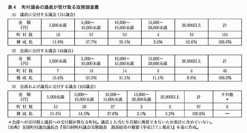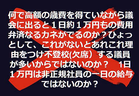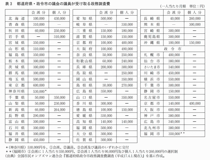 | 3つめは政務調査費です。 この政務調査費に至っては、本当に調査、報告し、議員立法補佐費などに使っている議員がいるのか極めて分かりにくく、実際、多くの議員が歳費(報酬)の一部と思っている場合が多いはずです。 , いずれにせよ、68万人の米国サンフランシスコ市は議員数11人で、年間一人当たりの歳費が約250万円と、人口規模で言えば日本の政令指定都市に近いわけですが、日本の場合は、議員数でざっと4〜6倍、歳費でざっと3〜5倍多いと言えます。またサンフランシスコ市には費用弁済、政務調査費などはないはずで、日本の地方議員がいかに多くの税金を歳費、費用弁済、政務調査費としてもらっているかがよくわかります。 , 日本の地方議会の場合、自民党や自民系政党が圧倒的に多い自治体が多く、それらの議員が野党議員や女性議員をヤジで罵倒したり、さまざまなハラスメントをしていることが多く報告されています。 また歳費については、兵庫県議が東京への出張旅費として偽装し累積で膨大な政務調査費を使っており、詐欺罪で有罪となったり、ある地方議員が沖縄出身の女性参議院議員の「秘書」になり、女性国会議員の国会活動などのカラー印刷費に自治体の政務調査費を使ったりと、とかく問題が指摘されています。 |