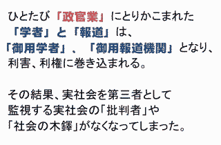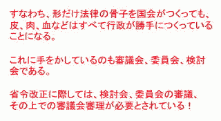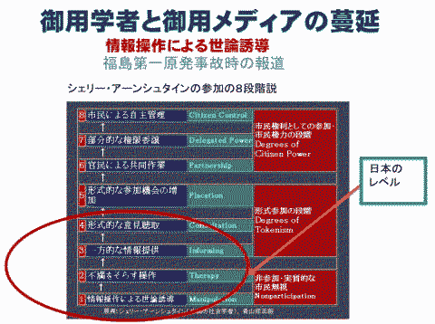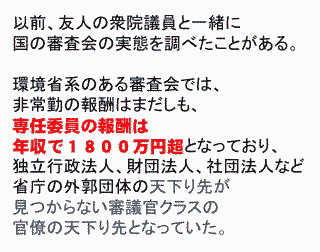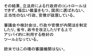 2012年1月30日、夜6:30〜東京都千代田区神田にある岩波セミナールームにてNPJ主催により、日隅一雄弁護士と青山貞一が「審議会が本来の機能を取り戻すために」をテーマに対談を行った。NPJはNews for the People in Japanの略で、弁護士らによる情報発信とコミュニケーションのプラットホームである。 以下の写真にあるように会場は、満員御礼となった。 ![]() 写真撮影:鷹取敦 (独立系メディアE-wave Tokyo) ※日隅一雄弁護士は海渡、只野、村上弁護士の同僚で東京共同 法律事務所に所属している。この日が誕生日とのことで終了後、 バースデーケーキがふるまわれた。 私は以前、立教大学の大階段教室で、日隅さんが企画された、 やはり審議会改革に関するシンポジウムに立教大学の服部先生、 東大大学院の醍醐先生らと共にパネリストとして参加したことがある。 当日は、日隅弁護士がこの間の経緯、今回の企画(連続対談企画〜無制限10本勝負)の趣旨について10分ほど説明された。連続対談企画〜無制限10本勝負 その後、青山貞一が40分弱、123枚のパワーポイントと8本の動画を使ってプレゼンを行った。 青山貞一のレジメ(12P,PDF) 以下は使った123枚のパワーポイントの一部である。 ![]() ![]() ![]() ![]() ![]() ![]() ◆青山貞一: 原発と民主主義(一問一答) ![]() ![]() ![]() ![]() ![]() ![]() ![]() ![]() ![]() ![]() ![]() ![]() ![]() ![]() ![]() ![]() ![]() 出典:東京新聞 ![]() ![]() ![]() ![]() ![]() ![]() ![]() ![]() 出典:朝日新聞 日本の審議会の在り方が徹底議論された環境アセスメント学会のシンポジウム(青山が司会、場所は東京工業大学大学院)。この学会シンポジウムは一般公開、実に3時間弱議論した。 ◆エネルギー政策選択と戦略的環境アセスメント・シンポジウム@ ◆エネルギー政策選択と戦略的環境アセスメント・シンポジウムA ◆エネルギー政策選択と戦略的環境アセスメント・シンポジウムB ◆エネルギー政策選択と戦略的環境アセスメント・シンポジウムC ◆エネルギー政策選択と戦略的環境アセスメント・シンポジウムD 15年前の原子力政策円卓会議のトップバッターでプレゼンする池田こみち(環境総合研究所副所長) ◆池田こみち:第一回原子力政策円卓会議での問題提起 ![]() ![]() ![]() ![]() ◆青山貞一:日本の大マスコミが抱える深刻な問題 ![]() ![]() ![]() ![]() ![]() ![]() ![]() 参議院予算委員会で公述し議員と質疑に対応する青山貞一 ![]() ![]() ![]() ![]() ![]() ![]() ![]() ![]() ![]() ![]() ![]() 青山のプレゼンを受ける形で日隅弁護士が日本の審議会改革のひとつの切り札となりうる「英国の公職コミッショナー制度」について15分ほど講演された。 「英国の公職コミッショナー制度」については、すでに日隅さんと青山で以下の著作を一昨年に現代書館から発行している。