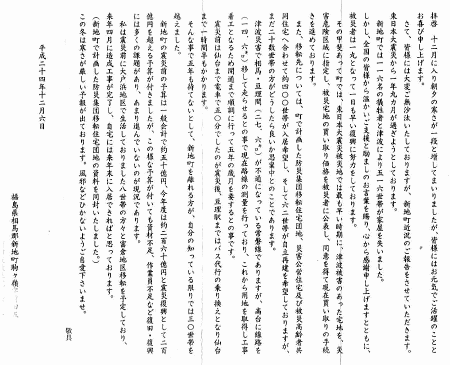 青山貞一は、この夏(2012年8月〜9月)、3回、福島県南相馬市で開催された再生可能エネルギー推進ビジョン有識者会議に出席するため東京から仙台経由で南相馬市にでかけました。 手紙にもあるように南相馬市に行く南ルートは常磐線が破壊、寸断され、同時に原発事故により警戒区域に指定されているため近づけず、東京から片道6時間以上かかりました。 東北新幹線のはやてで仙台到着後は、常磐線で宮城県亘理まで行き、その後、福島県相馬までは常磐線が不通のため、JRの代行バスを使います。 その途中に新地町があります。南相馬に行くたびに新地町の復旧、復興はどうなったかなと思案していました。青山は会議に参加するたびに、同僚の池田こみちさん、鷹取敦さんに、現在、代行バスで新地町のバス停にいることをメールしていました。 私達の被災者インタビュー調査から早1年3ヶ月、福島県新地町は、手紙にあるように、町民が一丸となって復旧、復興に尽力され、3.11被災地にあって最も早い時期に津波地域の具体的復興に着手することができたとあります。 福島県新地町がいち早く復旧、復興され、新鮮な魚類を各地に配送してくれることを祈念します。 | |||||||||||||||||||||||||||||||