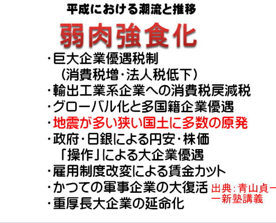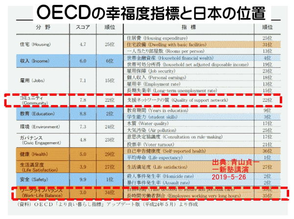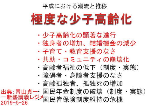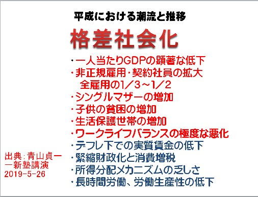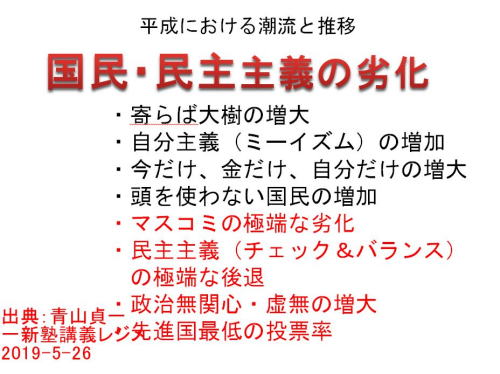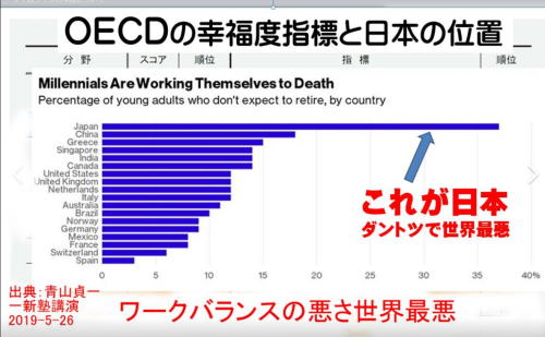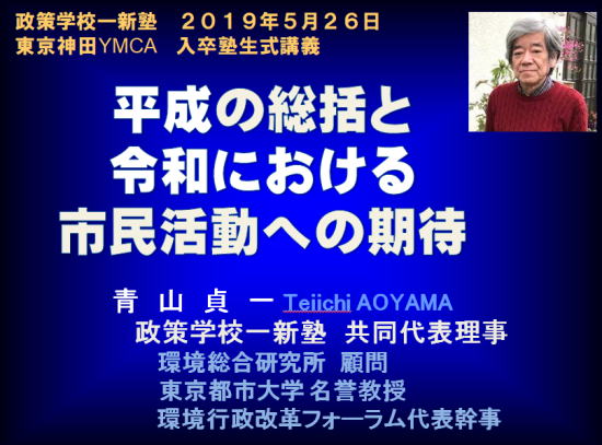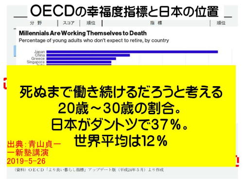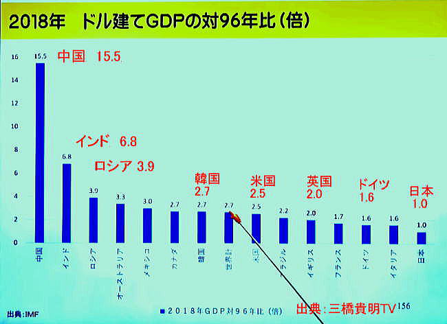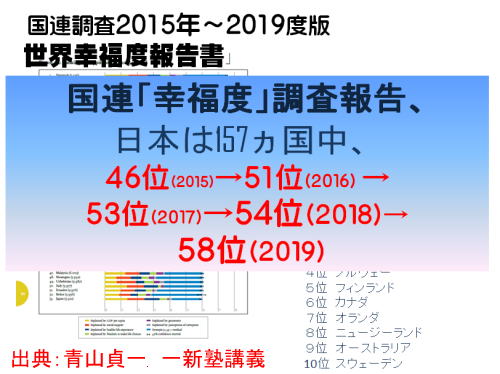 ◆青山貞一プロフ(フェイスブックより) 一新塾代表理事、環境総合研究所顧問、環境行政改革フォーラム代表、ゴミ弁連顧問、東京都市大学名誉教授、早稲田大学理工学部、同教育学部、東京工業大学大学院総合理工学研究科、東京農工大学農学部、中央大学理工学部、法政大学工学部、福島大学行政社会学部、宇都宮大学教育学部など日本各地の多くの大学で環境政策を担当(本務以外の講義の場合は、半期で13−14回講義担当)。行政関係では長野県知事顧問、長野県環境保全研究所所長などを兼務。専門は文系では環境政策、公共政策、行政訴訟、理系では応用物理、3次元流体力学(大気、潮流)、有害化学物質汚染解析など。環境影響評価解析など。その他、2003年より独立メディア E-wave Tokyo、また2010年からFacebookを池田こみち氏と共同、連携して開設、現在に至っている。 <関連スレッド:一新塾 国 経済> 以下は2019年5月26日、東京都千代田区神田のYMCA9階大ホールで行われたの政策学校一新塾入卒塾における青山貞一の冒頭講義の要旨です。 , それぞれのテーマにつき、15〜20枚のパワーポイント(全体で106枚)を使ってお話ししました。なお、今回で塾生は累積5400名となっています。 以下は平成年間(30年間)における日本の課題の総括編(約25分)です。 ![]() ![]() ![]() ![]() ![]() ![]() ![]() ![]() 以下は2018年のドル建て対GDP1996年比(倍率)です。原データはIMF、作成は三橋貴明TVです。ご覧になればわかるように、この22年間、日本は1.0すなわちGDPが一切増えていないことを示しています。ちなみに中国は15.5倍、インド6.8倍、ロシア3.9倍、韓国2.7倍、米国2.5倍、ドイツ1.6倍です。衝撃的なデータですが、日本はその間、国民の実質賃金はおしなべて増えていないことになります。 ![]() 出典:三橋貴明TV 2000年から2014年、日本はリーマンショック後、デフレが継続、一人当たりGDPも増えるどころか減少し、世界300都市圏のうち、大東京圏(人口約3800マン人)でさえ、以下のように一人当たGDP(ppp)と雇用の伸び率は、212位となっていた。平成年間における日本における実質賃金は、一人当たりGDP同様、あがるどころか下がっている実態がある。 <参考> ◆一人当たりGDPと雇用で見た世界300都市ランキング ブルッキングス研究所編 青山貞一訳 ![]() 出典米国ブルッキングス研究所 ![]() ◆国民年金機構(GPIF)による株下落による大損失 少子高齢化はことの初めから日本政府自身が120%わかっていことであるにもかかわらず、関連する政策をさぼってきたいわばツケである。GPIFの破綻も当然分かっていたにもかかわらず、まともな対応をせず、こともあろうかGPIFが株式運用に入れ込み2018年12月末に15兆円規模の損失となっている。 年金積立金管理運用独立行政法人(GPIF)によると、2018年12月末の運用資産額は150兆6630億円と、3・四半期ぶりの減少となった。年末にかけ世界的な株安に見舞われ、四半期ベースで14兆8039億円と過去最大のマイナス運用となったことが響いた。運用資産のうち外国債券は1兆9100億円買い越した。10─12月の収益率はマイナス9.06%。四半期ベースの損失額としては自主運用を始めた01年度以降で最大だった。資産別では、国内債券の収益率が1.01%(4242億円)のプラスだったのに対し、国内株式が17.57%(7兆6556億円)、外国債券が2.74%(7182億円)、外国株式15.71%(6兆8582億円)と、いずれもマイナスだった。 出典:[東京 1日 ロイター] ![]() <参考> ◆論文 青山貞一・池田こみち:人口ピラミッドから見える世界各地、国家の現状と将来 ![]() 出典:論文 青山貞一・池田こみち:人口ピラミッドから見える世界各地、国家の現状と将来