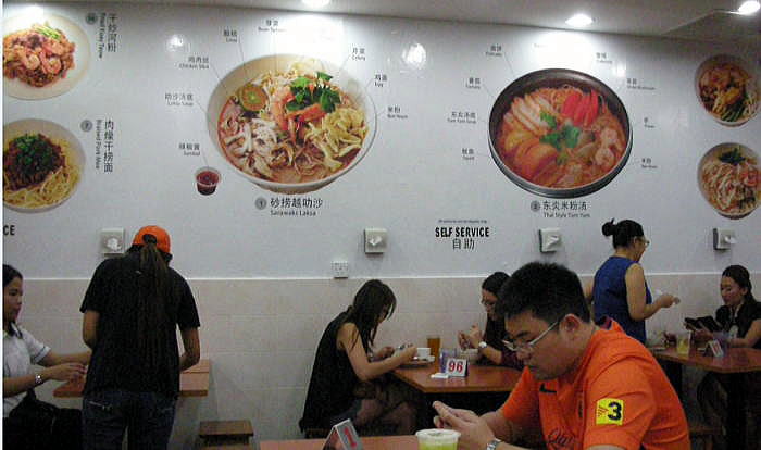 下はモールの1階で見つけたローカルフーズの店の店内です。やはり若者はみな、スマホを見ています(笑い)。