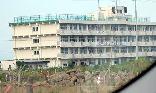 下は10号線上を走る車から撮影した遺構となっている仙台市立荒浜小学校の校舎である。