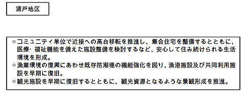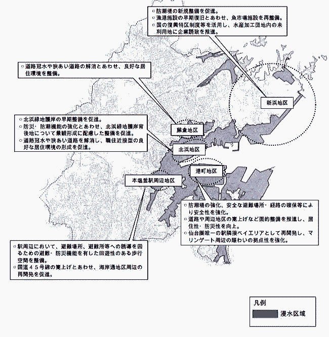 以下は浦戸野々島の沿岸部の一部である。撮影は2013年から2014年である。 ![]() 出典:グーグルストリートビュー 2014年5月 ![]() 出典:グーグルストリートビュー 2014年5月 一方、以下は塩釜市の内陸沿岸部の東北水産研究所近くの漁港である。 ![]() 出典:グーグルストリートビュー 2013年4月 以下は塩釜市の港湾地区(臨港)の現状である。 ![]() 出典:グーグルストリートビュー 2013年4月 さらに以下は湾奥の塩釜港である。 ![]() 出典:グーグルストリートビュー 2016年7月 ◆塩釜市の被災状況 東北地方太平洋沖地震によって本市では震度6強の強い揺れを観測するとともに、太平洋沿岸を中心に発生した高い津波が沿岸部に襲来し、津波の高さは本土側では概ね1.5m~4.0m、浦戸地区では8m(標高)を超え、浸水範囲が本土地区では市域面積の約22%、浦戸地区では全島において居住区域に達するなど甚大な被害をもたらした。 震災による人的被害、住宅などの被害は以下の通りである。 ◆人的被害(平成23年10月11日現在) 死者 47名(市内で亡くなられた市民の方 17名、市外で亡くなられた市民の方 30名) 災害関連死 10名 (市が設置する専門家の委員会によって震災と因果関係があると認定されたもの) ![]() ◆塩釜市復興計画における沿岸地区の復興イメージ 以下は塩釜市復興計画における沿岸地区の復興イメージ図である。3.11では数の灰色部分が浸水被害を受けている。 ![]() 出典:塩釜市復興計画 塩釜市の沿岸部では、下の写真にあるように国道45号線沿いに利府町まで低い堤防と歩行者道路が整備されている。 ![]() 出典:グーグルストリートビュー 2013年5月 浦戸地区 ![]() ![]() 出典:塩釜市復興計画 判例は全体地図と同じ(浸水区域) ◆塩釜市復興計画の推進 (1)推進体制 計画を推進するためには、国や県、他市町村など関係機関との連携を強化するとともに、これらの機関からの人的・物的支援が非常に重要となってきます。また、市民や町内会、企業、団体などとの連携も必要不可欠となっています。本市は復興の中心的な役割の責務を果たしながら、様々な主体との連携強化や調整を図り計画を早急に推進します。 ◇推進体制イメージ図 ![]() 出典:塩釜市復興計画 (2)復興特区制度などの活用 復興には多額の費用が必要となるため、その財源確保が課題となっています。また、既存の制度の枠組みにとらわれない柔軟な発想が求められています。国による規制・手続きの特例や財源措置を盛り込んだ復興特区制度などを最大限に活用し、財源確保を図るとともに、柔軟な発想によって生活再建や産業振興などに取り組みます。 (3)進行管理 事業の実施にあたっては、被害の状況を踏まえた目標や実施期間などを明確にするとともに事後評価を行い、それらについて公表するなど進行管理に努め、計画を着実に実施します。 利府町につづく |