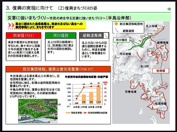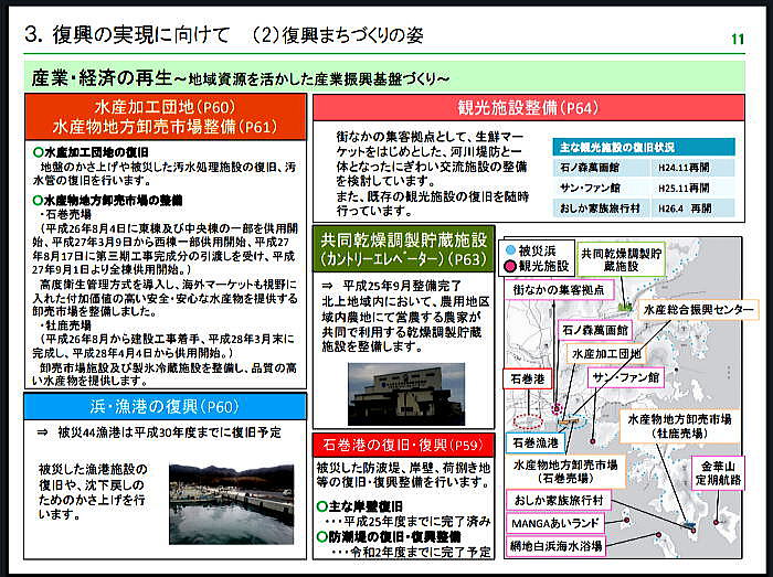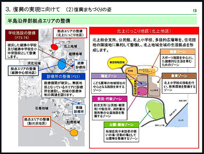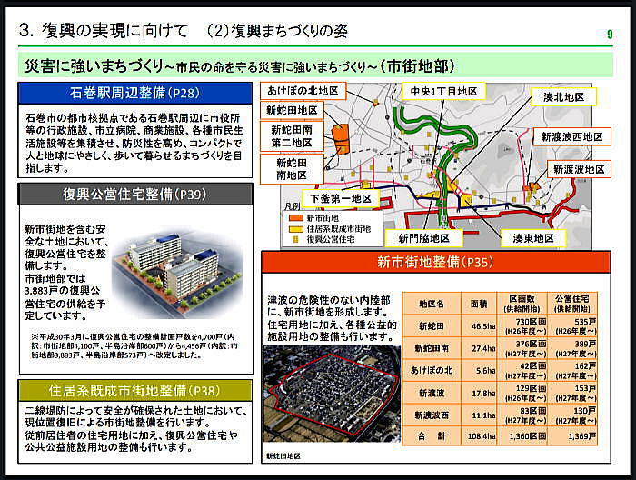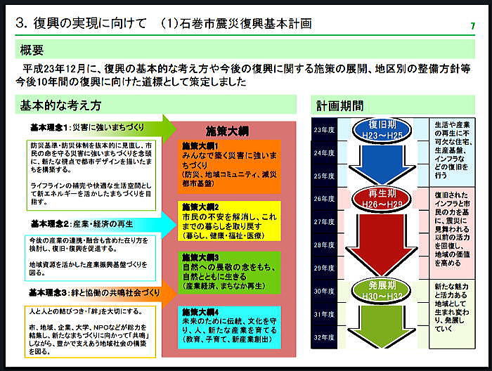 | <総合メニューへ> 石巻市1 石巻市2 石巻市3 石巻市4大川小1 石巻市5大川小2 石巻市6大川小3 石巻市7大川小4訴訟 石巻市8長面1 石巻市9長面2 石巻市10雄勝1 石巻市11雄勝2 女川町1 女川町2 女川町3原発 女川町4原発 ◆石巻市沿岸2 ![]() 出典:東北地方太平洋沖地震を教訓とした地震・津波対策に関する専門調査会配付資料 以下は石巻市の復興計画の概要である。今回の石巻市復興調査は、以下の図では発展期に入っている。しかし、石巻市街、大川、長面、雄勝などの各地を視察した限りでは、発展期はごく一部であり、大部分は再生期にあるように見えた。 ![]() 出典:石巻市東日本大震災からの復興 「最大の被災都市から世界の復興モデル都市を目指して」 復興の実現に向けて ![]() 出典:石巻市東日本大震災からの復興 「最大の被災都市から世界の復興モデル都市を目指して」 復興の実現に向けて ![]() 出典:石巻市東日本大震災からの復興 「最大の被災都市から世界の復興モデル都市を目指して」 復興の実現に向けて ![]() 出典:石巻市東日本大震災からの復興 「最大の被災都市から世界の復興モデル都市を目指して」 復興の実現に向けて ![]() 出典:石巻市東日本大震災からの復興 「最大の被災都市から世界の復興モデル都市を目指して」 復興の実現に向けて ![]() 出典:石巻市東日本大震災からの復興 「最大の被災都市から世界の復興モデル都市を目指して」 復興の実現に向けて ![]() 出典:石巻市東日本大震災からの復興 「最大の被災都市から世界の復興モデル都市を目指して」 復興の実現に向けて ![]() 出典:石巻市東日本大震災からの復興 「最大の被災都市から世界の復興モデル都市を目指して」被災状況 石巻市3につづく |