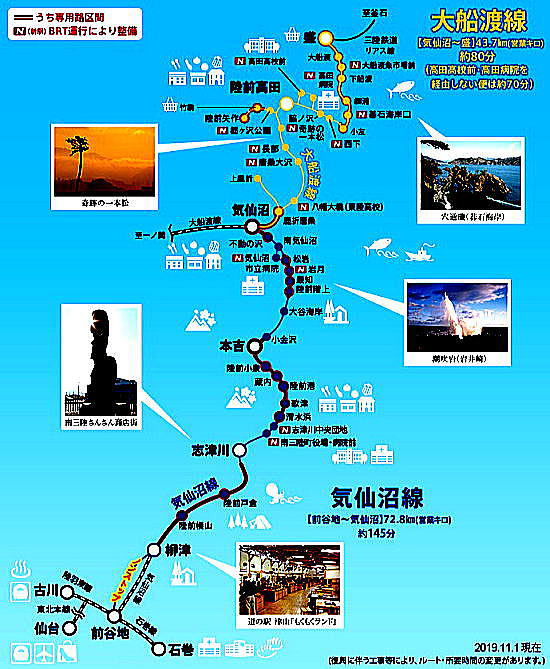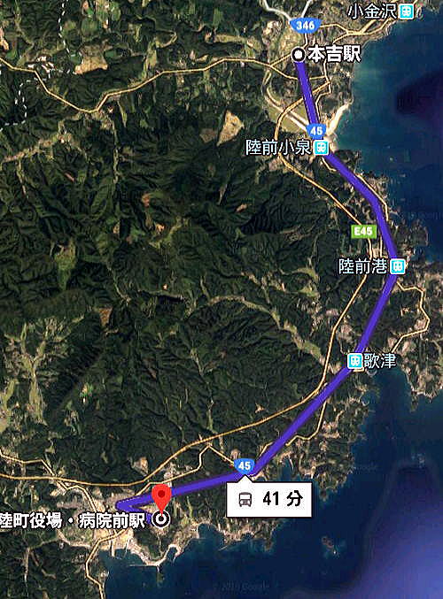 ◆気仙沼線復旧工事 その後、すぐに三陸自動車道から海岸線に近い従来の国道45号線に移る。すると、国道45号線の沿道では下の写真のような多くの橋梁、堤防などの公共工事が進められていた。この工事はおそらく鉄道の鉄橋である。 後日調べると、これは気仙沼線の復興工事の一部であった。 ![]() 撮影:青山貞一 Nikon Coolpix S9900 ![]() 撮影:青山貞一 Nikon Coolpix S9900 この大工事は、後日調べたら以下のグーグルマップにあるように、南三陸町と気仙沼市を結ぶBRTの工事であった。このBRTは3.11の津波で軌道が破壊されたため、高架バス路線として再建されていた。 この区間はJR東日本が運営していますが、鉄道ではなくBRTという高速バスによるサー ビスとなっています。 ![]() 紫色の線が南三陸町と気仙沼市を結ぶBRT用の高架橋 出典:グーグルマップ ![]() BRTの路線と停車駅地図 ◆BRTの概要 (出典:気仙沼線・大船渡線BRT(バス高速輸送システム)JR東日本) 「BRT」とは、バス・ラピッド・トランジット(Bus Rapid Transit)の略で、連節バス、PTPS(公共車両優先システム)、バス専用道、バスレーン等を組み合わせることで、速達性・定時性の確保や輸送能力の増大が可能となる高次の機能を備えたバスシステムです。 気仙沼線・大船渡線BRT(バス高速輸送システム) 当社の「BRT」の概要 気仙沼市沿岸2気仙沼線復興工事2 気仙沼2につづく |