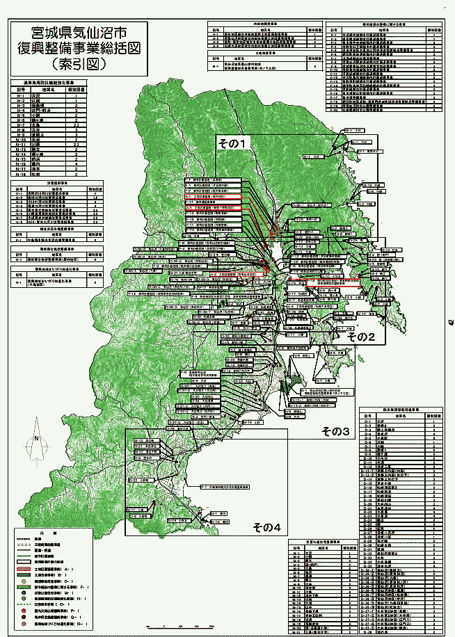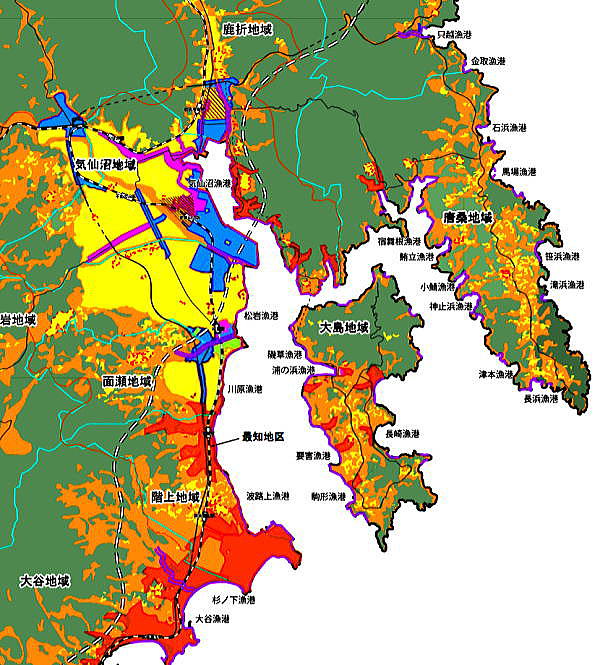 | <総合メニューへ> 南三陸1歌津1 南三陸2歌津2 南三陸3歌津3 南三陸4 南三陸5 南三陸6 南三陸7 南三陸8 気仙沼1 気仙沼2 気仙沼3 気仙沼4 気仙沼5 気仙沼6 気仙沼7 ◆気仙沼市4 ![]() 出典:東北地方太平洋沖地震を教訓とした地震・津波対策に 関する専門調査会配付資料 ◆気仙沼市沿岸4 ![]() 出典:Wikipedia 気仙沼市市は石巻市同様、地形が複雑で特に沿岸部の地形は入り組んでおり、さらに半島や島がある。地域特性が変化に富んでいる。 3.11の津波や浸水との関係では、沿岸域の距離、面積が多く、その管理は非常に困難を極めるものと推察される。3.11による死亡者(犠牲者)の数は、966人で、石巻市、東松島市に次いで県下で第3位に多い。 気仙沼市は、最新(平成30年)の気仙沼市土地利用構想図の主要部である。 ![]() ![]() 気仙沼市土地利用構想図の主要部(平成30年) 上記の土地利用図を見て直ちにわかるように、気仙沼市の沿岸部の土地利用は、多岐にわたっており、しかも湾奥ではそれらが複雑に入り組んでいる。 事実、以下の最新の復興整備事業総括図(第87回公表:平成31年1月22日)を見ると、膨大な数の事業が市内至るところで進行中であることが分かる。 ![]() 出典:復興整備事業総括図(第87回公表:平成31年1月22日) 復旧、復興のひとつの要となっている防潮堤については、上記の最新の土地利用図を見ると、市域のほぼすべてに紫色の太線、すなわち防潮堤等が見られるが、気仙沼市では、この防潮堤の設置をめぐり、市民と行政の間で議論が続いている。 本来、復旧、復興は住宅地の高台移転など土地利用面での対応が望まれるが、南三陸町や陸前高田市のような、大規模なまちの基盤を改変したり、背後地の山林を開発し住宅地化することが困難な自治体では、どうしても防潮堤(堤防)に頼らざるを得ない面もある。 しかし、3.11の大津波は、低い堤防や中途半端な防潮堤では、津波により容易に乗り越えられ、また物凄い重力加速度により堤防自体が破壊される事例も多くみられた。 さらに、漁業と住宅を分離し、漁業関係施設は沿岸に整備するものの、住宅は離れた高台や遠方の場所に配置するなどの方策も重要である。 気仙沼市にあっては、宮城県南部の諸自治体のように、沿岸域の背後地を一定程度、土地利用規制をかけ、住宅などの建築を禁止し、沿岸部に7.2mの防潮堤を築造するという方法は困難であった。理由は、沿岸域に市街地や住宅地が接近していること、国など行政による一方的な堤防建設に地域住民が疑義を唱えたことがある。 防潮堤、堤防の建設は人命や資産保全の観点から重要な物であっても、上述のように決して万全なものではない。これは釜石市の釜石湾口に数千億円の巨額をかけた防潮堤が津波で破壊されたり、同じ釜石市の唐丹の白石漁港の大規模な堤防や宮古市田老のやはり大規模な堤防が3.11の津波で破壊された実例からも分かる。 また防潮堤や堤防ができることにより眺望、景観が極度に悪化することも従前その地に永年住んできた人々には耐えがたいことである。 それらの観点からすると、津波被害=防潮堤の建造という短絡的な発想ではなく、緊急時における通報、具体的な避難、避難通路、避難場所などの確保、高齢者、身体不自由者、病院の患者らへの対応などソフト面、ハート面での対応を含めた対応が重要なものとなるだろう。 さらに画一的な防潮堤、堤防建設が歴史的、文化的資源や環境を破壊することもある。何でも鉄とコンクリートの土建事業で対応するという日本的対応にも疑問が向けられている。 以下は、 2014年7月12日の日本経済新聞の気仙沼市にある小泉海岸の記事である。