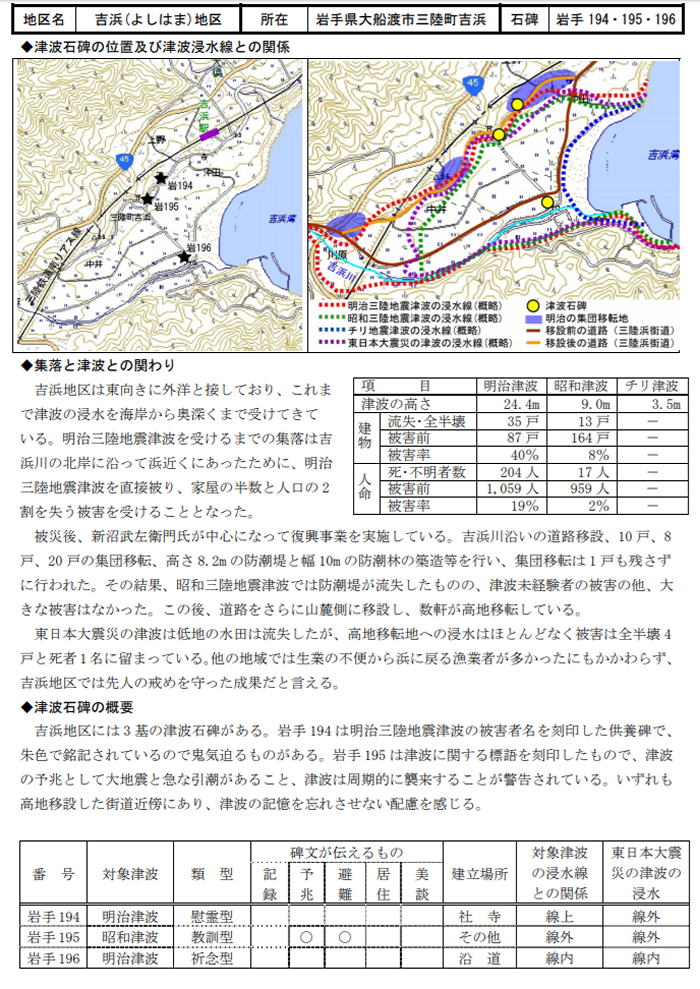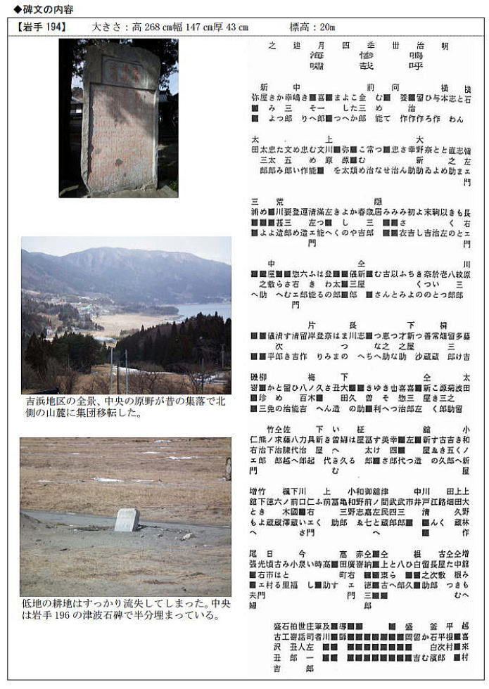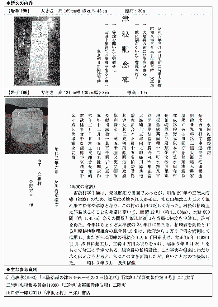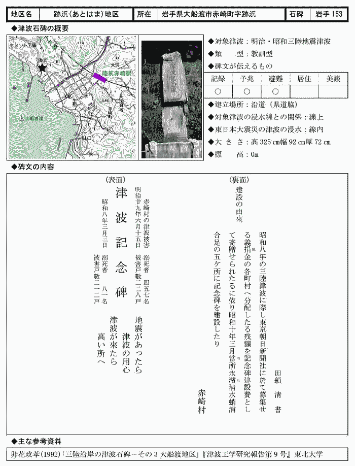 | <総合メニューへ> 陸前高田1 陸前高田2 陸前高田3 陸前高田4 陸前高田5 陸前高田6 陸前高田7 大船渡1 大船渡2 大船渡3 大船渡4 大船渡5 大船渡6 ◆大船渡市6 ![]() 出典:東北地方太平洋沖地震を教訓とした地震・津波対策に 関する専門調査会配付資料 ◆津波来襲時の碑石、供養塔など2 以下は三陸地域に現存する津波石碑の数々である。 ![]() 出典:グーグルマップ 以下は、岩手県大船渡市に残る津波の碑の続きである。 ![]() ![]() ![]() ![]() ![]() 釜石小白浜1へつづく <総合メニューへ> |