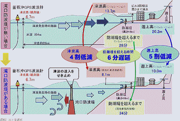 | <総合メニューへ> 釜石小白浜1 釜石小白浜2 釜石小白浜3 釜石小白浜4 釜石1 釜石2 釜石3 釜石湾口防潮堤1 釜石湾口防潮堤2 釜石湾口防潮堤3 釜石両石1 釜石両石2 釜石両石3 釜石鵜住居1 釜石鵜住居2 釜石鵜住居3 釜石鵜住居4 釜石鵜住居5 ◆釜石湾口防潮堤1 ![]() 出典:東北地方太平洋沖地震を教訓とした地震・津波対策に 関する専門調査会配付資料 次に、東部・平田地区にある釜石湾口防潮堤を対象とする。 これは釜石湾の入り口、湾口に建設省(その後の国土交通省)がつくった防潮堤である。 以下の写真h3.11の津波で粉々に破壊される前の釜石湾港防潮堤の写真である。 ![]() 破壊されるまえの釜石大堤防 出典:国土交通省、釜石港湾事務所 ![]() 元出典:釜石市 2018年7月1日の現地調査では湾口防潮堤の現場には行かなかったが、私達は唐丹の白子浜の防潮堤とともに、この釜石湾口防潮堤にこだわり、以前破壊された現場にも足を運んだ。 ここでは、過去に遡り、この釜石湾口防潮堤に言及してみたい。 以下は2011年(平成23年)の国土交通白書における国土交通省自身による「釜石港湾口防波堤の損壊と減災効果」と題する論考である。