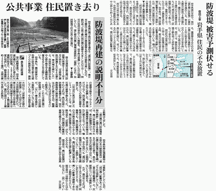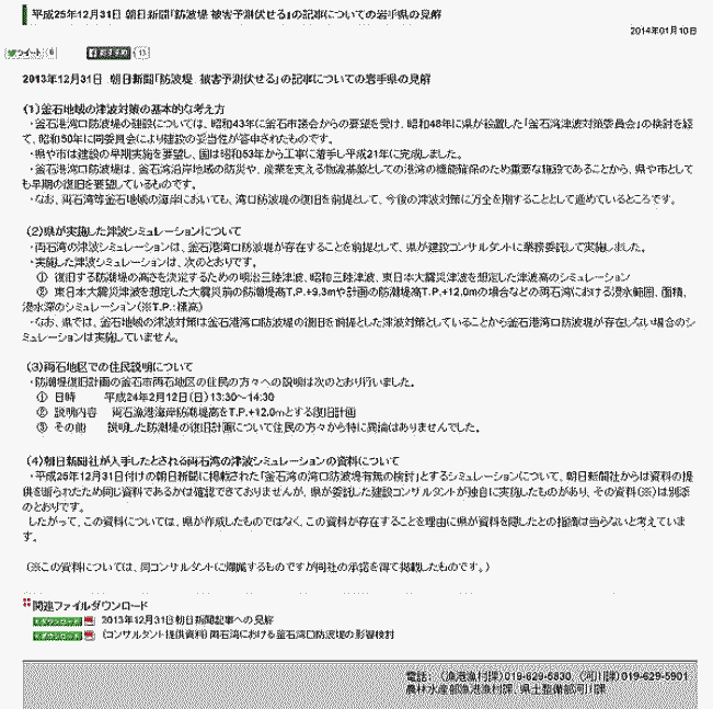 以下は日本報道検証機構の記事である。 ◆釜石防波堤「津波被害予測を隠蔽」に岩手県が反論 2014年1月16日 震災後の復旧工事が進められている釜石市湾口防波堤があると津波被害が一部で拡大するとの予測結果を岩手県が隠していると朝日新聞が報道。しかし、県は隠したとの指摘は当たらないと反論している。 【朝日】 2013/12/31朝刊1面「防波堤 被害予測伏せる 復旧工事 岩手県 住民の不安放置」、3面「公共事業 住民置き去り 防波堤再建の説明不十分」 《注意報1》2014/1/16 07:00 《注意報1》 2014/1/16 07:00 朝日新聞は昨年12月31日付朝刊で、「防波堤 被害予測伏せる」と見出しをつけ、岩手県が釜石湾口防波堤があることで両石湾の津波被害が拡大するとのシミュレーションを実施していながら隠蔽していたと報じた。これに対し、県側は、シミュレーションは県が実施したものではなく、隠したとの指摘は当たらないと反論している。 岩手県の発表や朝日新聞の報道によると、岩手県は、東日本大震災の後、破壊された釜石湾口防波堤の復旧を前提に、両石湾などの沿岸の津波被害の予測をコンサルタント会社に依頼して実施。それを踏まえ、国土交通省が防波堤の復旧工事を進めている。この防波堤をめぐり、朝日新聞は、大震災の津波で釜石湾に隣接する両石湾の集落が壊滅し、住民が「津波が防波堤で跳ね返って何倍も高くなって来るのでは」と調査を求めていたことを指摘。同紙の取材で「釜石湾口防波堤があることで両石の被害が大きくなるとする岩手県のシミュレーションがあることがわかった」とし、独自に入手した「釜石湾の湾口防波堤有無の検討」と題する資料によれば、防波堤がなければ両石湾岸の集落の被害が減るという結果が出ていたと報じた。