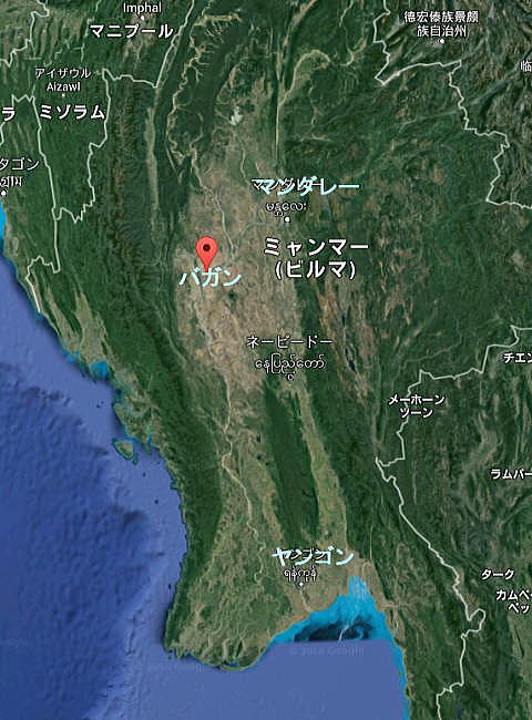 | (72) マンダレーからバガンへ(1) (73) マンダレーからバガンへ(2) (74) マンダレーからバガンへ(3) (75) バガンのホテル (76) バガンの位置 ◆バガンの地理的位置と他都市からの移動手段 まず最初にバガン(Bagan)の地理的な位置について確認しましょう。下の地図は、ミャンマーにおけるバガン、マンダレー、ヤンゴンの位置です。 ヤンゴンからバガンは直線距離で約700km、マンダレーからバガンは直線距離で約290kmです。一般的には、ヤンゴンとバガンは国内線の飛行機が1時間ちょっとで便利ですが、料金はかなり高額(1万4000円前後)です。 バガン、マンダレー、ヤンゴンに共通に関わるのは、エーヤワディ川(旧イラワジ川)です。ヤンゴン、バガンを船で移動するのは無理でも、マンダレーとバガンの間には現在でも船が行き来しています。 しかし、船旅は大変時間がかかるので、マンダレーとバガンはバスによる移動が一般的となります。OK社のミニバスなら、ホテルとホテルのドア・ツー・ドアを800円で移動してくれます。一方、船はクラスにもよりますが、5000円前後かかります。 ということで、マンダレーからバガンへの移動は、間違いなくOK社のミニバス利用がベストと思えます。下はOK社のミニバスです。、 ![]() 出典:OK bus Mandalay to Bagan このミニバスは大別して、ホテルとホテルを結ぶタイプと、ターミナルとターミナルを結ぶものがあります。値段は高くなりますが、前者の方がはるかにGoodです。 ![]() 出典:グーグルアース 下の地図は、マンダレーからバガンにバスで移動するときに使ったものですが、青い太い線がエーヤワディ川(旧イラワジ川)です。しっかりと両都市は船でも行き来できるのです。今回は訪問しませんでしたが、モンユワとバガンの間でも船が行き来しています。 ![]() 出典:グーグルマップ ◆Old Bagan (オールドバガン) 下はオールドバガンを中心に置いた地図です。赤い線がかつての城壁の跡であり、現在、考古学的保全地区となっています。私たちのホテルはその考古学的保全地区の左下にあります。地図にThande Hotel Old Bagan (オールドバガンのタンデ・ホテル)とある場所です。 ただし、考古学的保全地区は、オールドバガンを中心とした13km×8kmの範囲をさし、北はNyaung U、南はNew Baganを含み、イラワジ川の曲がったところ(蛇行したところ)に位置する上ビルマの平原に広がっています。 ホテルのすぐ西には、大河、エーヤワディ川(旧イラワジ川)が洋々と流れています。この川は大降雨時には、氾濫し大きな被害を流域にもたらすようですが、この大河は、モンスーンで三毛作を可能とする水利上のもととなっているのです。 ![]() 出典:グーグルマップ 今回の旅行では、マンダレーかバガンまで約5時間のバスで移動し、オールドバガンのホテルまで来ました。このホテルからは、バガンの数ある寺院、パゴダの中で必見といわれるアーナンダ寺院、スラマニ寺院はじめ主な寺院やパゴダまで、徒歩や自転車それに一部馬車で移動しました。 何しろ、上の地図の草原の中に5000もの仏教遺跡(寺院、パゴダ)があることを想起していただければ、いかに壮大なものであるかがわかるというものです。 下は上の地図の部分拡大です。 現在、城壁は一部の門(ゲート)以外残っていませんが、オールドバガンの区域の中心地といえます。 一方、主なパゴダは示されていますが、実際には下の地図のパゴダのおそらく10倍以上存在しているはずです。 ![]() 出典:バガンのホテルが出している地図 下は夕日のなかにたくさんのパゴダが見え隠れするバガンの風景です。 ![]() 出典:Bagan English Wikipedia つづく |