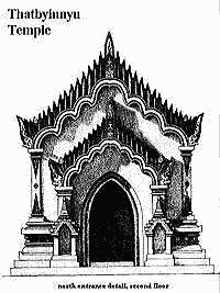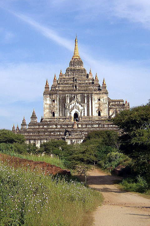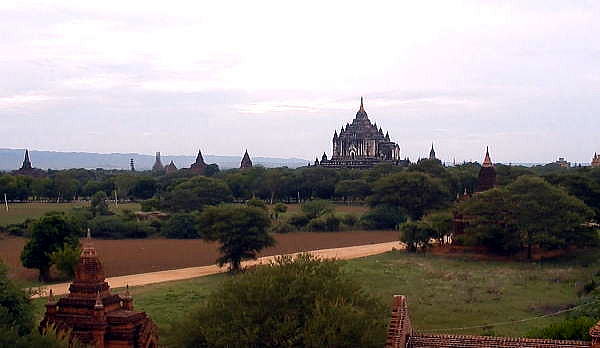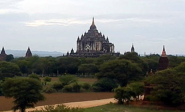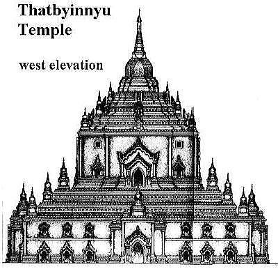 | (86) ゴドーパリィン寺院 (87) ミマラン僧院 (88) パホタミャー寺院 (89) ガーチャウェ・ナダウン・パゴダ (90) ナッラウン寺院 (91) タビィニュ寺院(1) (92) タビィニュ寺院(2) (93) ピタカタイ (94) ホテルでの夕食と操り人形 ◆タビィニュ寺院 ThatbyinnyuTemple タビィニュ寺院の場所はバガン到着後、ホテルから歩いて散策した東に向かう道の突き当りにあります。 タビィニュ寺院はグーグルマップにあるように、林の中に立っています。タビィニュ寺の建築物の高さは61mあり、バガンに数1000あるパゴダ、仏教施設のなかで最も高さがあります。 タビィニュ寺院は、同時にオールドバガンにあって、東(右)にバガンで一番有名な寺院であるアーナンダ寺院(Ananda Temple)、真北(上)にバガン黄金王宮(Bagan Gold Palace)、さらに西(左)にはバガン考古学博物館やゴドパリィン寺院があります。すでに紹介したゴドパリィン寺院タビィニュ寺院についで60mの高さがあります。 ![]() 出典:グーグルマップ 出典:グーグルマップ 数あるパゴダや寺院のなかで、タビィニュ寺院はデザイン面からもひときわ目立つ存在となっており、オールドバガンのさまざまな場所から見ることができます。 下は、バガン滞在二日目の夕方に視察したシェエダンドーパゴダを30mほど登った展望台から池田が動画で撮影したものです。動画で撮影したものを静止画として切り出した写真です。確かに非常によく目立つ存在です。 ![]() 撮影:青山貞一 Nikon Coolpix S9900 2016-6-6 ◆タビィニュ寺院の概要 タビィニュの北東にある小さなgayochoまたは「タリー」寺院です。タビィニュの建物の中にレンガの数を維持するために、レンガを使用するすべての万のために確保された、この小さな寺院は、このように確保されたレンガで造られました。 タビィニュ寺院は、1144年に4代目のアラウンシートゥー(Alaungsithu)王により建てられた寺院で、その高さは約61mもあり、バガンは一番高さがある寺院の仏塔(パゴダ)です。 寺院の名前、すなわちThatbyinnyuとは「全知全能」という意味であり、バガン(旧パガン)にある有名な寺院で、12世紀半ば、Alaungsithu王時代に創建されました。 このタビィニュ寺院は、バガンで最も著名なアナンダ寺院のすぐ近くに位置しています。タビィニュ寺院は十字架のような形をしていますが、左右対称ではありません。この寺院は、二つの重要な二つの層からなっており、二階部分に仏像が安置されています。 下の写真は上の写真のうち、タビィニュ寺院を拡大したものです。ざっと見ただけでも多数のパゴダの尖塔が見えます。 ![]() 撮影:青山貞一 Nikon Coolpix S9900 2016-6-6 なお、以下は晴天時に撮影したタビィニュ寺院です。非常に均整の取れた美しい寺院で鵜。 ![]() Source: English Wikipedia 以下はタビィニュ寺院の解説です。 ◆タビィニュ寺院 Thatbyinnyu Temple ・仏教施設のタイプ :タイプ IIの寺院 ・場 所 : ゴドーパリィン寺院、アーナンダ寺院の近く ・地 域 : ニャンウ地域 ・創建者 : Alaungsithu王 ・創建世紀: 11世紀y バガンに数ある寺院やパゴダの中でタビィニュ寺院は、仏の「全知全能」からその名を取ったようにその素晴らしさは群を抜いています。ミャンマー語でThatbyinnyutanyan、パーリ語でSabbannutananaは、全知全能であり現代の碑文では「徹底的に知り、広く見る」となっています。 タビィニュ寺院は、Alaungsithu王(1113-1163)によって建てられており、アーナンダ寺院(北西800m)とゴーダパリン寺院(Gawdawpalinm東500m)の間にあります。タビィニュ寺院は最古の二重階建の寺院のひとつですが、その配置はのちの二重階建ての寺院のものとは異なっており、二階部分に仏像が安置されています。 タビィニュ寺院のデザインは、十字架のような形をしていますが、左右対称ではありません対称性であり、アナンダ寺院のような正方形にはなっていません。このようなデザインは、その後のサルマニ寺院(Sulamani)やゴーダパリィン(Gawdawpalin)に継承されています。 三層のテラスは、ギザギザの形をした欄干の角は仏舎利塔で飾られており、それぞれの階を超えて天に向かって伸びています。タビィニュ寺院では、上部階のテラスの上に、61m(201フィート)まで先を細くした仏舎利塔をのせ、さらに膨らみを持った曲線状の尖塔が天に向かってそびえています。バガン随一のタビィニュ寺院の高さと炎のような何本もの仏舎利塔が仏塔をより印象深いものにしています。 タビィニュ寺院の東の柱や廊は二つの主義信に守られています。内部には中央階段があり中間階につながります。壁に沿って存在する窓の二つの層は、内部を明るく照らし、風通しの良い空間をつくっています。 厚い壁の中に組み込まれた二つの階段は、階段が上階につながり階上のテラスへと通じています。ここでは、仏の巨大な像が石づくりの玉座に座っています。また厚い壁に組み込まれた狭い階段も上階以上のテラスへとつながっています。タビィニュ寺院のテラスからは、一面に緑と茶の壮大な風景、無数のパゴダや寺院な