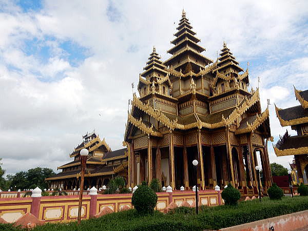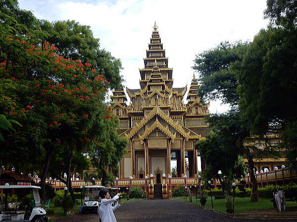 | (99) バガン黄金王宮(1) (100) バガン黄金王宮(2) (101) バガン黄金王宮(3) (102) バガン黄金王宮(4) 9:30近くになったので、タラバー門を視察後、王宮を拝観、視察することにしました。 ◆黄金王宮 Golden Palace 下はバガン王宮(黄金王宮)の入場チケットです。5000K=約500円です。残念ながらパンフレットもありません。 ![]() 撮影:青山貞一 Nikon Coolpix S9900 2016-6-7 下の写真は、バガン王宮(黄金王宮)の入場係員と王宮を背景に撮影したものです。やはり公務員も例のロングの巻きスカートをはいていますね。 これはビルマ語で「ロンシー」といい、ミャンマー国内では誰でも普通に皆これをはいて過ごしているようです。 池田が値段を調べてみましたが、数100円と大変リーズナブルです。 ![]() 撮影:池田こみち Nikon Coolpix S9900 2016-6-7 黄金宮殿の建築物は、いすれも復元、レプリカなのですが、マンダレーの王宮に比べるとバガンの王宮はすべて金色で派手ですね。 ここまでやるか! という感じです。ただ、黄金のパゴダが常識の国ですから王宮が黄金でも何らおかしくはないと思います。 ![]() 撮影:青山貞一 Nikon Coolpix S9900 2016-6-7 どうでしょう! 以下がバガン黄金王宮(宮殿)の主要部です。一階ホール部分の高さが異常に高いのが気になります。一方、尖塔は真ん中のものが七層ですが、両脇の小さな尖塔は五層となっています。いずれも奇数です。 帰国後、少し調べえたところ、 「一、三、七という奇数、すなわちこの割り切れない数は、割り切ることのできる相対の世界よりも、どうしても割り切れない絶対の世界をめざす仏教の世界を象徴しています」とありました。 確かに、「死亡した翌年の祥月命日(死亡した日と同月同日)が一周期、その翌年が三回忌、そのあとは七、十三、十七、二十三、二十七、三十三、三十七五十、百回忌の順となります」ね。「年忌または年回法要と呼びますが、三回忌以降の数え方がよく誤解されます。つまり、一周期だけを満で数え、それ以外は死亡の年を入れて「かぞえ」となっているとか。 ![]() 撮影:池田こみち Nikon Coolpix S9900 2016-6-7 このバガンの黄金宮殿の配置図や平面図を帰国後いろいろ調べ、探してみましたが、今のところありません。もともと入場時の半券は冒頭に示した通り、何も書かれていません。 仕方なく、とりあえずグーグルアースの衛星写真で以下をつくってみました。つくってみた、といっても拡大して切り取っただけです。ただし、方位は90度左に回してあります。また右側が入口です。私が入り口の係員と3人で撮影したのは、以下の写真の右の中央あたりです。 実際に、入口から入って直ぐのところで前方を見ると、この王宮は左右対称に見えますが、以下の写真で見ると必ずしもすべてがシンメトリーとなっている訳ではないようです。 ![]() 出典:グーグルアース 下は黄金王宮の中心的な建築物です。 マンダレーの王宮同様、七層の塔はじめほぼすべてが黄金のホールとなっています。 ![]() 撮影:青山貞一 Nikon Coolpix S9900 2016-6-7 下がその七層の塔です。 ![]() 撮影:青山貞一 Nikon Coolpix S9900 2016-6-7 下はメインホールですかね? ![]() 撮影:池田こみち Nikon Coolpix S9900 2016-6-7 下を見てください。全部が金色です。数1000のパゴダと言い、この黄金宮殿と言い、往時のバガンの繁栄がしのばれますね。ただし、池田が調べたところ、この黄金宮殿は往事のものを復元したものではなく、レイアウトだけでなく、アーキテキチャーもかなり違うもののようです。 この辺がユネスコの世界委員会から世界文化遺産登録を拒否される理由の一つなんでしょう。しかし、バガンには何しろ2500もの仏塔、寺院、僧院、王宮などがあるので、そのうちのいくつかにその種の疑義があったからといって、遺産登録を全面的に拒否されるのはいかがなものかと思います。 とはいえ、下は七層の塔と主堂です。メインホールは沢山の高い柱があります。柱の高さは10mほどあるように見えます。 ![]() 撮影:青山貞一 Nikon Coolpix S9900 2016-6-7 つづく |
