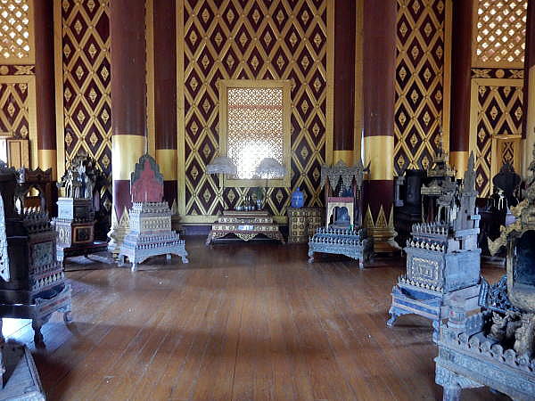 | (99) バガン黄金王宮(1) (100) バガン黄金王宮(2) (101) バガン黄金王宮(3) (102) バガン黄金王宮(4) この黄金王宮については、日本語はもとより英語でもほとんどまともな解説がないこともあり、以下に現場で撮影した写真をギャラリー的に紹介するにとどめます。 おそらく膨大なミャンマーの国費を投入しながら、ミャンマー国民はまだしも、入域料と入場料を徴収しておきながら外国人観光客らに対し、これでは申し開きができないのではないかと思えます。 これは何もバガンの黄金王宮のみでなくバガンの考古学博物館、さらにマンダレー王宮、ヤンゴンの国立博物館についても同じです。これらについては、帰国後しらべたところ、まともな公式Webもないようです。 とくにこのバガン黄金王宮では、建築物、施設、調度、家具などについての英文による表示、解説がないため、入場者には自分がどこにいるのか、この部屋は何の部屋なのか、時代状況はどうなっているのか、バガンのどの王がつくり、追加、改良したものなのかが、さっぱりわからないのです。 これには大変驚きましたが、お昼過ぎに訪問した考古学博物館も似たり寄ったりです。説明案内板がない場合には、常識的には最低限英語が話せる学芸員がいて質問に対応すべきですが、見渡したところ係員同士がビルマ語でおそらく私語をしているばかりでした。 もっぱら、王宮には出入り口に切符切りの係員がいるだけで、王宮内部では誰一人学芸員と思しきひとはいませんでした。 今後、軍事政権から民主的な政権に移行するなかで、国、行政が国民にまた外国からの観光客などに何をどうすべきかについて考え、「はこもの」主義から情報、説明などの重要性に気づかれることを期待します。 以下は王宮メインホールの天井です。 ![]() 撮影:青山貞一 Nikon Coolpix S9900 2016-6-7 天井の模様についてについての解説です。