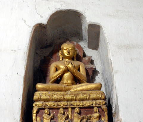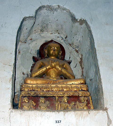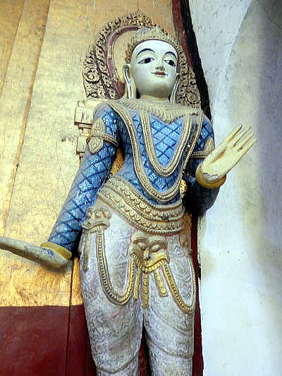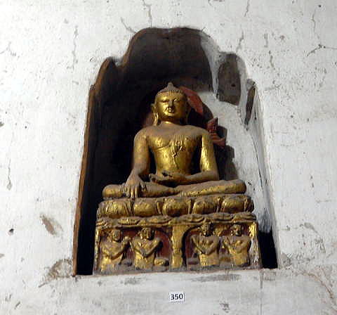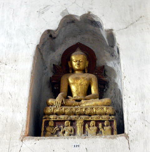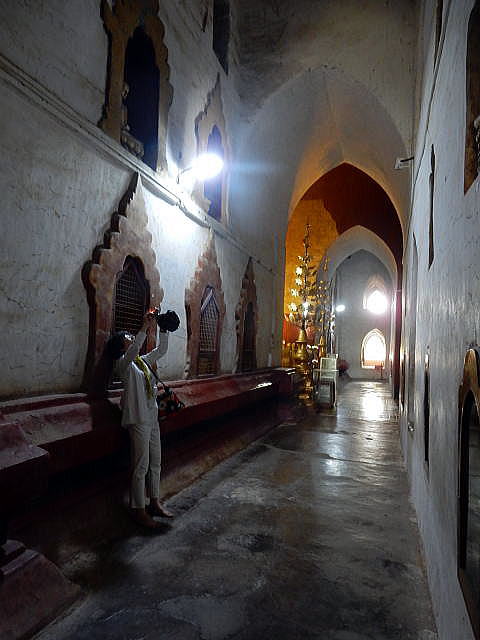 | (103) 王宮からアーナンダ寺院へ (104) アーナンダ寺院(1) (105) アーナンダ寺院(2) (106) アーナンダ寺院(3) (107) アーナンダ寺院(4) アーナンダ寺院は、下の平面図(レイアウト)に見るように、内部は二重の回廊でめぐらさせています。 一つの回廊は、東西南北に仏像が鎮座している前にあり、もう一つは、それより数mづつその側をめぐる回廊です。 これらの回廊の壁面には、埋込み型の約80点に及ぶ仏像が浮き彫りされています。 ![]() ource: English Wikipedia 以下は、壁面に埋め込まれた約80点の浮き彫り仏像の一部です。 ![]() 撮影:池田こみち Nikon Coolpix S9900 2016-6-7 ![]() 撮影:池田こみち Nikon Coolpix S9900 2016-6-7 ![]() 撮影:池田こみち Nikon Coolpix S9900 2016-6-7 ![]() 撮影:青山貞一 Nikon Coolpix S9900 2016-6-7 下の写真は、壁や壁に埋め込まれた仏像を写真撮影している池田です。池田が背にしている壁だけでも七つの埋め込まれた仏像があることが分かります。 ![]() 撮影:青山貞一 Nikon Coolpix S9900 2016-6-7 ![]() 撮影:池田こみち Nikon Coolpix S9900 2016-6-7 以下は下部にある碑文を持つ典型的なアーナンダ寺院のプラークの一つです。 ![]() Source: English Wikipedia ◆アーナンダ寺院の壁画 Paintings アーナンダ寺院の礼拝堂の壁に描かれた絵は、ほとんど白塗りされてします。ただ、北側の祈祷を行う広間の南西の柱は、ミャンマー考古学局によって絵の修復が行われました。 寺院内の壁画のうち状態の良いものもいくつかありました。具体的には、東側の祈祷ホールの壁や天井には仏陀の姿が再び現れ、北側には仏陀の立像のところには、Arahats(解脱した仏様たち)や蓮の花が、そして、西の入口には花々の絵が描かれていました。 注)Arahatとは上座部仏教における定義によれば、arhat (サンスクリット語)又は、arahant (パーリ語)とは、悟りを開いた"尊い人" または "完全な人"を指します。 Source: English Wikipedia ![]() This photo of Ananda Temple is courtesy of TripAdvisor ![]() 撮影:青山貞一 Nikon Coolpix S9900 2016-6-7 下はアーナンダー寺院の梵鐘をたたく池田です。しっかり裸足なのが分かります。 ![]() 撮影:青山貞一 Nikon Coolpix S9900 2016-6-7 つづく |