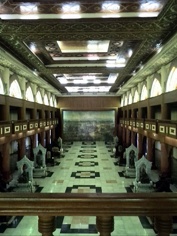 | (108) アーナンダーオーク僧院 (109) ミノチャンタ・パゴダ (110) スータンファイ・パゴ (111) バガン考古学博物館(1) (112) バガン考古学博物館(2) (113) ミニェインゴンパゴダ (114) ミィンパヤー (115) グタウティト アーナンダ寺院とその周辺の僧院、パゴダを拝観、視察後、一旦、滞在先ホテルに戻って戦線を立て直すつもりでしたが、途中にバガン考古学博物館があるので、そこを見学してから戻ることにしました。 宿泊先ホテルのすぐ隣に、バガン考古学博物館がありました。 この種のミャンマー国立博物館は、ヤンゴンでもマンダレーでも、いかにも「国立」で、展示物、展示方法、学芸員がいるのかいないのか不明、いる係員は私語ばかりなど、結構、高い入場料金をとる割には、課題が多いのです。 とくに問題は、学芸員がいるのかいないのか不明、いる係員は私語ばかりなどです。これは、最近でいえばナポリのカゼルタ王宮、ブハラのアルク城などなど、世界各地の国立、公設博物館に共通のことです。 本来、博物館では学芸員が積極的に入館者からの質問に専門的にこたえるべき存在なのですが、どこもかしこも、ただ黙ってつったっているだけ、あるいは仲間の係員と私語ばかりです。 それでもバガン考古学博物館(Bagan Archaelogical Museum) というからには、行かないわけにはゆきません(笑)。そこで6月8日の昼、バガン考古学博物館に行きました。 出典:グーグルマップ 下はグーグルマップで見たバガン考古学博物館です。ピンク色の屋根の建築物が博物館です。 すぐ西に、私達が滞在しているタンデ・オールドバガン・ホテルがあります。とはいえ、博物館に入るにはグルーと回わり、地図の右端から入らなければなりません。 ![]() 出典:グーグルマップ 下は入り口の前に立つ池田です。 ![]() 撮影:青山貞一 Nikon Coolpix S9900 2016-6-7 下は博物館の全容です。なんと、まぁ立派な建築物です。 ![]() 撮影:青山貞一 Nikon Coolpix S9900 2016-6-7 バガン考古学博物館は1904年、アナンダ寺院の北の入口付近に建築され、Epigraphic事務所の管理者Taw Sein Kho氏などによって収集された出土品が展示されていたといいます。 さらに、彫像や画像、古器などが保全を理由としてバガンのパゴダや寺院から移され、さらにシュエジーゴンパゴダから青銅フロッグドラムなども展示されていました。 これら博物館の展示物のほとんどは、1975年の地震によって見つかった記念碑、パゴダで発見された貴重な考古学関連文物、さらに青銅置物、青銅製の仏彫像、ガラス聖の小道具・小箱、また古代バガンで掘り出された遺跡の品々とのことです。 ![]() 撮影:青山貞一 Nikon Coolpix S9900 2016-6-7 以下は入場時にいただいたパンフレットです。しかし、このパンフはほとんどないも同然です。博物館の概要が分かりません。 ![]() 入場時にいただいたパンフレット 下の写真は博物館内にある展示物、室の配置と概要です。 一階(写真下)はバガン王朝時代のアートギャラリーと壁画とあります。二階は特別展示、会議室およびバガン王朝時代の文物の展示、さらに同時代の建築文化、書物の展示などとあります。 ![]() 撮影:青山貞一 Nikon Coolpix S9900 2016-6-7 下の写真は、博物館の1階にに入ってすぐにある1階の大ホールの突き当たりの壁に飾られている大きなバガン草原に点在するパゴダの巨大な絵画です。 ![]() 撮影:青山貞一 Nikon Coolpix S9900 2016-6-7 ![]() 撮影:池田こみち 京セラ製アンドロイドスマホ Urbano L02 下は2階の廊下から写したものです。この両側に1、2階とも展示室があります。 ![]() 撮影:池田こみち 京セラ製アンドロイドスマホ Urbano L02 つづく |