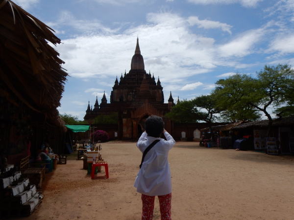 | (126) スラマニ寺院(1) (127) スラマニ寺院(2) (128) スラマニ寺院(3 (129) スラマニ寺院(4) (130) スラマニ寺院(5) (131) スラマニ寺院(6) (132) スラマニ寺院(7) (134) バガン草原で迷子に (135) バガン最後の夕食 ダマヤンジー寺院の後、私達は自転車で、さらにスラマニ寺院に向います。 残念なのはやはり自転車のタイヤの空気圧が足りず、走るのが非常につらいことです。下はその自転車です。 ![]() 撮影:青山貞一 Nikon Coolpix S9900 2016-6-8 ![]() 撮影:青山貞一 Nikon Coolpix S9900 2016-6-8 とはいえ、ここまで来たので引き返すわけにはゆきません。 そうこうしているうちに、スラマニ寺院に到着しました。下の地図の右側にある寺院です。 ![]() ダヤンジー寺院とスラマニ寺院の位置関係 出典:グーグルマップ 最初に、寺院の前の露店で麦わら帽子を買いました。もっと早く買えばよかったのですが、今日もすごい暑さ(熱さ)です。何しろ超がつく晴天、気温はおそらく40℃近いです。 下はグーグルマップで見たスラマニ寺院です。 アーナンダ寺院は周辺に多くの僧院、パゴダなどがありましたが、スラマニ寺院は大草原のなかの孤高の寺院という感じです。周りにはほとんど仏教遺跡はありません。 出典:グーグルマップ スラマニ寺院に到着しましたが、私達以外にほとんど拝観したり見学している人、観光客はいないようです。 ◆スラマニ寺院到着 さて、私たちは今後に備えて左側の露店で麦わら帽子を買いました。 もっと早く買えばよかったのですが、今日一日のためだけとなっても重要な装備品です! 下は逆光で写しているので輪郭だけしかわかりませんが、スラマニ寺院です。寺院を池田が撮影しているところです。 見てお分かりのように、ちょうどお昼時で露店主らが食事しているからでしょうか、また団体ツアーがこの時間を避けているせいか、ひとっこひとりいません。 それにしても、暑そうな光景です(笑、実際あついのです)! ![]() 撮影:青山貞一 Nikon Coolpix S9900 2016-6-8 以下はデジタル大辞泉でみたスラマニ寺院の簡単な解説です。 ちなみに世界的な観光・旅行アドバイザー、トリップアドバイザーのバガン編では、数1000ある仏教遺跡の中で、スラマニ寺院は第二位にランクしています。