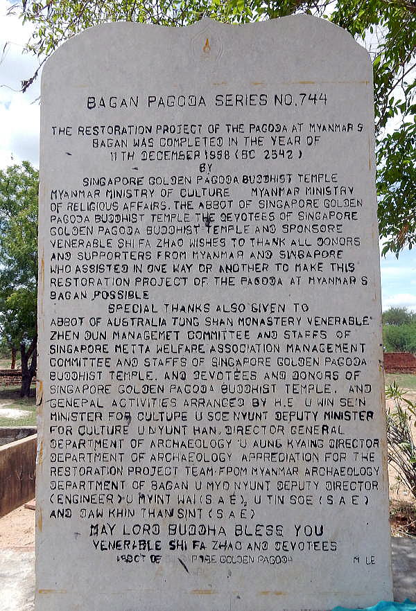 | (126) スラマニ寺院(1) (127) スラマニ寺院(2) (128) スラマニ寺院(3 (129) スラマニ寺院(4) (130) スラマニ寺院(5) (131) スラマニ寺院(6) (132) スラマニ寺院(7) (134) バガン草原で迷子に (135) バガン最後の夕食 この後、寺の外に出て一周します。 裸足で灼熱の太陽で熱くなった床の上を歩くのは大変です。 ![]() 撮影:池田こみち Nikon Coolpix S9900 2016-6-8 途中、米国のカリフォルニア州からきている若者と出会い、議論します。下はその若者が撮影してくれた写真です。 ![]() 撮影: Nikon Coolpix S9900 2016-6-8 ![]() 撮影:池田こみち Nikon Coolpix S9900 2016-6-8 このあと、青山、池田は自転車でホテルに帰るのですが、時間があるので、スラマニ寺院周辺のパゴダを視察することにし、自転車で出発しました。 ◆Tha Beik Hmauk Gu Hpaya パゴダ 下はスラマニ寺院のほぼ真東にあった小さなパゴダです。 名前はTha Beik Hmauk Gu Hpayaと呼ぶようです。 ここからはスラマニ寺院がよくく見えます。 撮影:青山貞一 Nikon Coolpix S9900 2016-6-8 下はパゴダの中にあった仏像です。 ![]() 撮影:青山貞一 Nikon Coolpix S9900 2016-6-8 このTha Beik Hmauk Gu Hpayaとの辺りでは、パゴダや寺院の修復、復元が行われていました。 下はそのプロジェクトについての標識です。バガンのパゴダ遺跡復元シリーズ No.744とあります。この復元プロジェクトは1998年の12月に終了したとあります。 バガンには膨大な数のパゴダ遺跡が眠っており、それらを発掘、復元するのはよういはことではないはずです。また膨大な費用もかかるのは言うまでもありません。しかし、これらがバガンのひとびとの業務(=仕事)となっていれば、それだけで多くの雇用が生み出せるはずです。 ![]() 撮影:青山貞一 Nikon Coolpix S9900 2016-6-8 つづく |