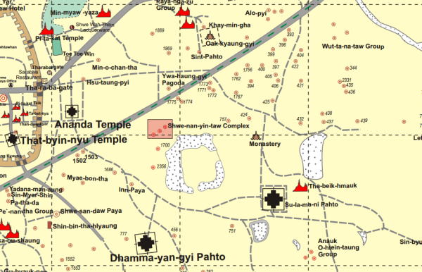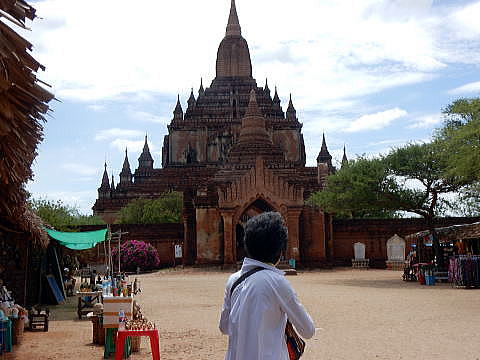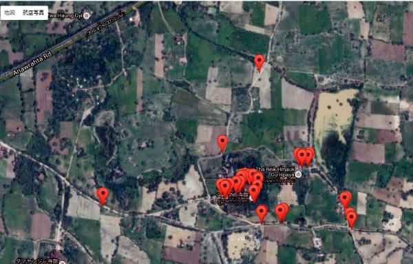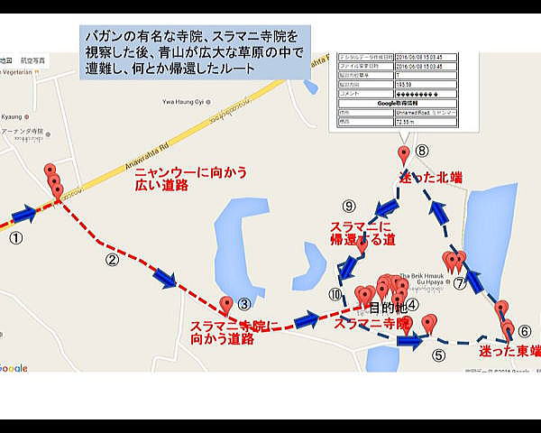 | (126) スラマニ寺院(1) (127) スラマニ寺院(2) (128) スラマニ寺院(3 (129) スラマニ寺院(4) (130) スラマニ寺院(5) (131) スラマニ寺院(6) (132) スラマニ寺院(7) (134) バガン草原で迷子に (135) バガン最後の夕食 このTha Beik Hmauk Gu Hpayaというパゴダまで、青山と池田は自転車で一緒に走って行ったのですが、このパゴダの少し北あたりで、青山が先を走る池田を見失ってしまいました。 見失った場所は下の地図のF近くです。Fは上の写真のパゴダの近くを示しています。 ![]() 出典:グーグルマップ その後、青山は一旦、Gの方向に走っていった上で、再度E方向まで引き返し、そのあと北、すなわち再度、Gに向けて走ります。 この間、大きな声で池田の名前を呼んでも、大草原のなかに池田は見えません。また返事もないのです。 天気は良くカンカン照り、まだ昼間なのですが、途方に暮れました。E→F→Gの道路は、舗装はされていません。さらに雨の後に4WDが通ったため大きな輪達(わだち)ができており、自転車では非常に走りにくいのです。 すこし、休憩をとったあと、気を取り戻し、今回のミャンマー現地調査で持参したNikon Coolpix S9900のデジカメに、現在自分がいる場所を画面上に占めずGPS機能があることを思い出し確認しました。 非常に小さな液晶画面で見ずらいのですが、北に向かって走っている道は、ニャンウーという村に向かう幹線道路に向っていることが分かりました。 ![]() 撮影:青山貞一 Nikon Coolpix S9900 2016-6-8 そこでニャンウーに向かう幹線道路に出るべく北に向かって走ったのです。しかし、かなり走っても、その幹線道路は見当たりません。 ニャンウーに向かう幹線道路に出るのはあきらめ、迷った時の原則、すなわち出発点に戻ることを考えました。つまりスラマニ寺院に引き返すことにしました。 Nikon Coolpix S9900のデジカメにはデジタルの方位系(磁石)がついているので、それを見ながら、GからH方向に向けて走りつづけました。 そして、ついにIの地点でスラマニ寺院近くにいる池田を発見したのです。下はスラマニ寺院の前にいた池田です。この日は、おそらくバガンで最高に気温が高かった日です。よくもまあ熱中症にならずに、バガンの大草原から帰還したものです。 ただし、麦瓦帽子とペットボトルの水は常時もっていました。 ![]() 撮影:青山貞一 Nikon Coolpix S9900 2016-6-8 下図は、Nikon Coolpix S9900で撮影した際に、GPSの測位情報をファイルに統合することができるため、記憶後、それをグーグルマップ上に展開したものです。目玉マークは撮影した写真の数と場所を示しています。すなわち、ニコンのカメラで即位付きの撮影写真フェイルをグーグルマップにプロットしたものです。 ![]() 出典:グーグルマップ+Nikon Coolpix S9900 2016−6−8 さらに、下は上記の地図を衛星地図に置き変えたものです。ただし、位置は上の地図とは異なっています。スuラマニ寺院では、大部分の写真撮影をレンガづくりのパゴダの内部で行ったため、衛星からの電波は届かず外で撮影したものだけが示されています。 ![]() 典:グーグルマップ+Nikon Coolpix S9900 さらに以下はバガンの上記を含む詳細地図です。 ![]() 出典:The Map of Bagan 下は自転車でアーナンダ寺院が見えるところまで帰ってきた写真です。 ![]() 撮影:青山貞一 Nikon Coolpix S9900 2016-6-8 この後、自転車でホテルに戻りました。それにしても、バガンの大草原のなかは、一つ間違うとどこにいるのかがわからなくなるという意味で危険です。 つづく |