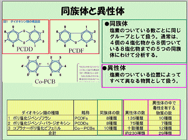 さて、ひとつの大きな問題は、かくも高濃度のダイオキシン類がなぜ生じたかです。 ダイオキシン類は大別して3種類あり、それぞれに同族体と異性体があり、分析結果からそれらをチェックしてゆくと、DNA鑑定同様、最終的に、発生したダイオキシン類が何によるものかが分かる可能性があります。 これについて、私の論考をご覧いただいたこの道の世界的研究者でもあります宮田秀明摂南大学名誉教授は、以下のように述べています。 > 青山先生の速報のお知らせ有難うございました。 > ダイオキシン類の毒性当量のほぼ全てがPCDFsに起因していれば、 > 原因は食塩電解工程の陽極スラッジの埋め立てによるものと思います。 > > 宮田 今後、東京都に検出されたダイオキシン類のデータの情報公開を請求し、異性体、同属体の分析を行いたいと思います。 以下は、ダイオキシン類及び同族体と異性体についての解説です。 ダイオキシン類には、PCDD(ジベンゾダイオキシン)、PCDF(ジベンゾフラン)それにCo-PCB(コプラナーPCB)の3種から構成されています。これらはそれぞれ多くの異性体、同属体を持っています。 ![]() 出典:東京都環境科学研究所 ![]() ダイオキシン類の構造図 PCDDとPCDFには、結合している塩素の数と位置により、合わせて16個の同族体と210個の異性体が存在します。PCBには、10個の同族体と209個の異性体が存在します。 環境中に存在するダイオキシン類には複数の異性体が混在していますが、異性体の種類によって毒性の強さが大きく異なるため、毒性を評価するときには、最も毒性が強い2,3,7,8‐四塩化ジベンゾ‐パラ‐ジオキシン(2,3,7,8-TCDD)を基準(1)として各異性体ごとに定められた毒性等価係数(TEF:ToxicityEquivalency Factor)をかけ、それらを合計した値で表します。この値を毒性等量(TEQ:ToxicityEquivalency Quantity)と言い、濃度にTEQを付記しています。 以下は上記の説明を図にしたものです。 ![]() 出典:池田こみち(環境総合研究所) 以下は、東京都の用地を保有しており、東京都に用地を売った株式会社アデカの概要です。 ![]() 敷地の一角にあったアデカ本社ビル 図の左上の点線の外側 撮影:青山貞一 Nikon Coolpix S8 2013-9-19 以下はWikipediaに見るアデカの概要です。