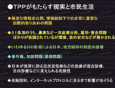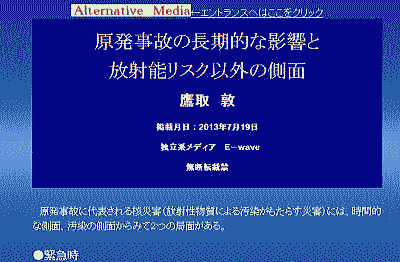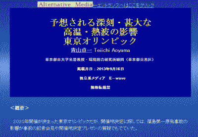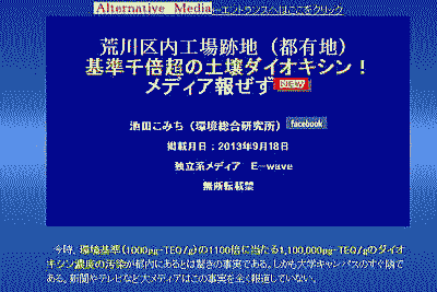 2011年2月からはじめた独立系メディア E-wave Tokyoの動画(YouTube,USTREAM)は、大小全部で400本以上となり、1本1時間以上の動画でも7万を超えるアクセスを得るに至っています。 今年の前半は、研究所の事務所移転、その後は全国津々浦々からの講演依頼などで、動画部門に対応する時間が限られていました。 7月中旬に事務所移転が完了し、9月下旬になり講演対応も一段落しましたので、今週末から動画制作を再開します。東京都目黒区大岡山の新オフィスには、動画撮影のスタジオ、撮影・編集機材がすべて揃っています。 なお、みなさまで、ぜひ、この問題を取り上げて欲しいとか、独立系メディアでご自身がインタビューを受けてみたい、報告、問題提起、政策提言してみたいという方は、青山までご一報ください! 9月27日、E-wave Tokyoスタジオで行われた収録の様子 撮影:鷹取敦 ![]() 9月27日、E-wave Tokyoスタジオで行われた収録の様子 撮影:鷹取敦 <<動画制作、当面の予定>> ◆オリンピック2020が抱える7つの環境課題 ダイジェスト (青山、池田、鷹取) ![]() ◆東京都荒川区における環境基準の1100倍のダイオキシン汚染問題 (池田、青山対談、現地調査を踏まえて) ![]() ※池田こみち:荒川区内工場跡地、基準千倍超の土壌ダイオキシン ◆沖縄米軍基地跡地から発見された枯葉剤中のダイオキシン問題 (池田へのインタビュー) (宮田秀明摂南大学名誉教授インタビュー) ◆2つの特措法の実態 (青山、鷹取、日弁連講演をベースに) ![]() ◆がれき広域処理の大総括 (池田、青山対談、北九州講演をベースに) ◆なぜ日本のマスコミはマスゴミと呼ばれるのか (日隅弁護士追悼、青山) ◆学生でもわかる報道すべきものを報道しない大マスコミの堕落 (青山貞一、大学の授業をもとに) ◆福島原発周辺のペット、その後の状況 (坂本・鶴田夫妻へのインタビュー) ◆八ッ場ダム周辺の吾妻渓谷における地質崩壊問題 (大学研究者) ◆その後のTPP問題 (横田一氏と青山の対談、一新塾講義をベースに) ・極度な情報非公開、情報統制下での非常に重要な 国際的取り決めの問題 ・21条項のうち、農業など一次産業分野、雇用・賃金問題 ばかりが強調されているが環境、食の安全などが脅かされる ・いわゆるISD条項による日本、地方固有の制度の崩壊 ・著作権、知財問題(薬価問題) ・日本が世界に誇る国民皆保険などの医療が混合診療、 自由診療などに変えられる危険性 ・金融規制、インターネットプロトコルに至るまで影響がありうる ![]() ◆福島第一原発汚染水問題 (青山、横田、鷹取の座談) ![]() ◆放射能影響以前に800人が死んでいる現地の状況 (鷹取へのインタビュー) ![]() ◆なぜ、福島原発事故関係者への刑事告訴、告発が起訴にいたらなかったか? (青山貞一) ◆無責任な国の対応で頓挫している原子力防災計画 (青山貞一) ◆自民党政権下でどうなる 地方分権、地域の環境、福祉、教育など新たな公共政策 (青山貞一、一新塾講義をベースに) ・地方分権は民主党政権でも進まなかったが、 自民党政権では、中央集権化が強化される可能性が高い ・地方分権、地方主権の牽引車となっていた日本維新の会 が橋下共同代表の度重なる言動で急降下、失速している ![]() ◆自民党政権下でどうなる ・環境政策は、民主党政権では自民党政権より後退した が、新自民党政権では「鉄とコンクリート」の再来となる ・福祉、教育は自民党政権で間違いなく民主党政権より かなり後退する可能性が高い ・民主党政権に目玉であった「新たな公共政策」は、 総じて後退するだろう ◆自民党政権下で国民が遭遇する深刻な政策の数々 (青山貞一、一新塾講義をベースに) ・過渡な格差社会化 ・福祉、社会保障の切り捨て化 ・鉄とコンクリートへの舞い戻り ・国土強靭化(法)計画 ・福島原発対策、原発再稼働化 ・TPP参加による一次産業切り捨て化、 地方経済の極度な劣化、多国籍企業支援強化 ・情報統制化、特定秘密保護法 ・隣国との関係悪化 ・沖縄米軍基地強化、米国隷属強化 ・防衛予算の増加、武器利権の増大 ・集団的自衛権化、憲法改正 ![]() ◆参院選後の自民1強、生活者主権に向けて市民はどう行動すべきか (青山貞一、一新塾講義をベースに) ◆自公は 約2600票、全野党は約2720票の意味 (青山貞一、一新塾講義をベースに) ![]() ◆メディアに翻弄されない市民に目覚めるために (青山、池田対談) ◆米国の対シリア軍事攻撃が懸念される情勢について (青山貞一、一新塾講義をベースに) 課題1 主権国家の内戦に他国が軍事攻撃 することの疑義 課題2 反政府勢力=アルカイダなどを含む 勢力である 課題3 アルカイダを米国が支援するおかしさ 課題4 かつてイラクの時はG.W.ブッシュ政権は 「大量破壊兵器」、を理由にイラクを攻撃し 政権を倒し、暫定傀儡政権を樹立し フセイン大統領を殺戮した 課題5 シリアでは 「化学兵器」の所持や使用を 攻撃の理由としている。もし、そうであるなら 日本のオウムのサリン事件で米国は 日本を攻撃するのか? 事実 世界で最も「