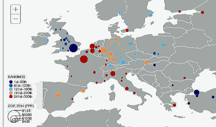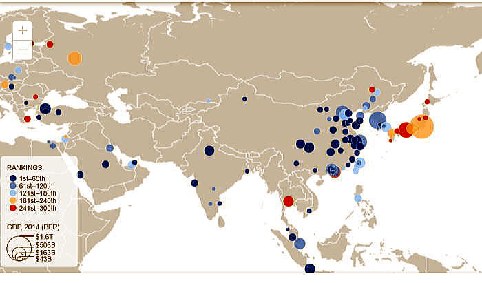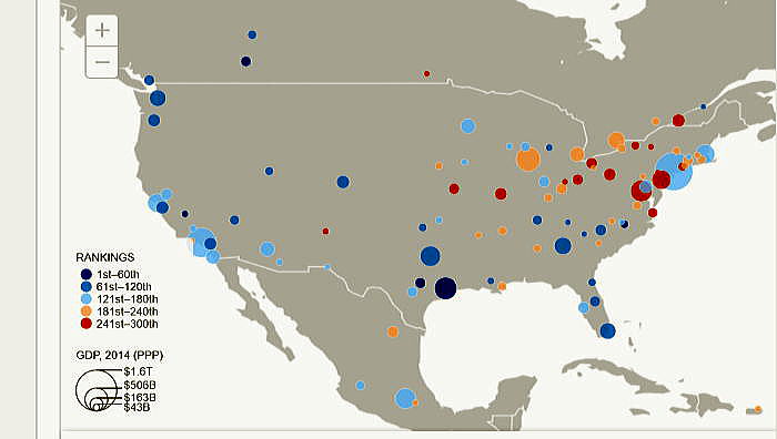 世界300の大都市圏が次のようにランキングされ、色分けされます。