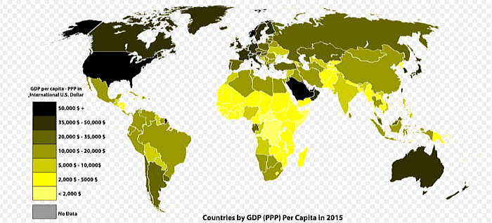 そこで市場取引における為替レートではなく、その地域の生活関連コストやインフレ率や収入の差などの要素を考慮した購買力平価(PPP)を用いることで、貿易や国家間投資のような、国際間資本移動の影響を受けにくいレートで比較することができるようになります。
