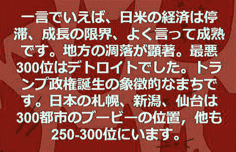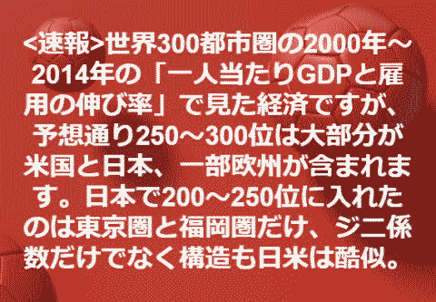 日本・韓国 オリジナル出典:米国ブルッキングス研究所 ここではアジアの日本と韓国の大都市圏について、調査結果(総合、2000年〜2014年)を見てみます。 ![]() 出典ブルッキングス研究所(米国) 以下は日本、韓国の拡大図です。 ![]() 出典ブルッキングス研究所(米国) <世界300都市経済圏ランクマップ> 総合・一人当たりGDP・雇用 ◆日本の大都市圏 以下は日本の主要大都市圏の結果です。残念ながら、すべてが停滞か下降の赤色グループです。 日本の大都市圏の大きな特徴は、2008年9月のいわゆるリーマンショック以降、激しい雇用の落ち込みがあり、一人当たりGDPも落ち込みとなり、なかなかその影響を克服しきれていないことにあります。とりわけ、雇用の落ち込みは、世界300都市圏のいずれより大きなことも判明しました。 また一人当たりのGDPが上がっている割には雇用が少ない点も指摘できます。さらに一人当たりのGDPが上がっていても勤労者の所得が増えていないのは、企業が税引き後利益を内部留保とし、勤労者の所得に再分配していないことにあります。 ●、すなわち一人当り購買力平価の大きさは、東京は世界都市圏で最大規模です。東京の●の大きさは、米国のニューヨーク大都市圏に比肩しており、物価が世界規模で高く、生活がしずらいことを意味しています。また、これは東京が日本の他の都市圏との対比で世界一一極集中化していることが見て取れます。 日本 東京大都市圏(212位/300) ![]() 日本 北九州・福岡大都市圏(246位/300) ![]() 日本 鹿児島都市圏(260位/260) ![]() 日本 名古屋都市圏(264位/300) ![]() 日本 熊本都市圏(267位/300) ![]() 日本 浜松都市圏都市圏(272位/300) ![]() 日本 静岡都市圏(273位/300) ![]() 日本 岡山都市圏(276位/300) ![]() 日本 大阪神戸大都市圏(281位/300) ![]() 日本 広島都市圏(288位/300) ![]() 日本 札幌都市圏(289位/300) ![]() 日本新潟都市圏(290位/300) ![]() 日本 仙台都市圏(293位/300) ![]() 次はお隣の韓国の大都市圏です。 ◆韓国主要都市圏 韓国の特徴は2008年9月のいわゆるリーマンショックの影響を日本ほど受けていないことがあげられます。また雇用の増加と一人当たりGDPがともに増加しています。 韓国 ソウル市・仁川都市圏(91位/300) ![]() 韓国 大田都市圏(93位/300) ![]() 韓国 光州都市圏(94位/300) ![]() 韓国 釜山市・ウルサン大都市圏(119位/300) 市韓国 大邱都市圏(125位/300) ![]() 以上、日本と韓国の順位を見てきましたが、おおよそ以下のことが言えます。すなわち、2000年から2014年の14年間で成長が著しいアジア諸国にあって韓国はその一員でしたが、日本は東京が4位グループにあるだけで、福岡・北九州大都市圏など他は最下位グループと停滞していたことが分かります。 <アジア地域都市圏の分布> 1位から 60位 中国、マカオ、香港、東南アジア、インド、中東 61位から120位 韓国、台湾、東南アジア、インド、トルコ 121位から180位 該当なし 181位から240位 日本 241位から300位 日本 青山貞一コメント(初出フェイスブック) ![]() ![]() つづく 中国へ