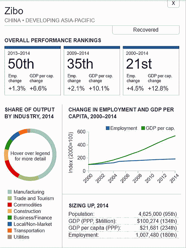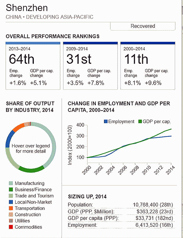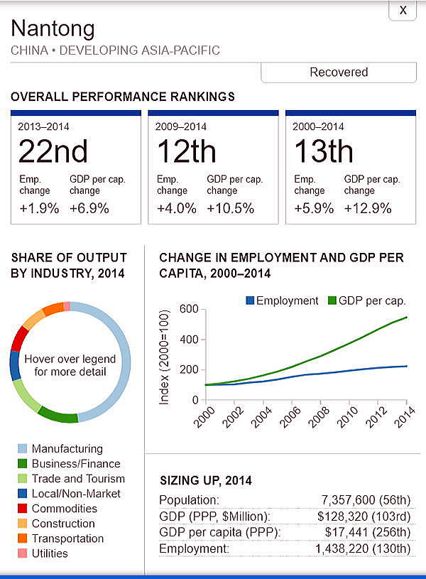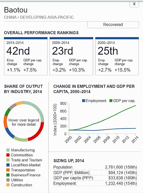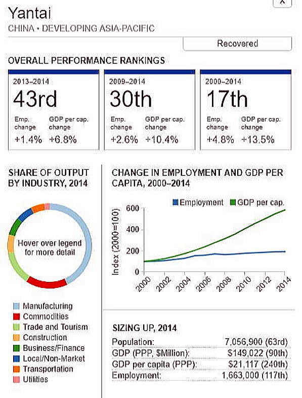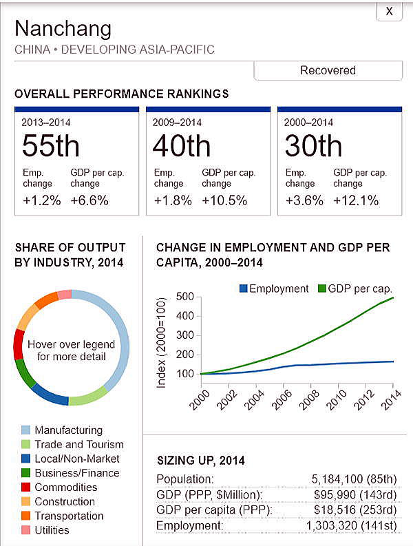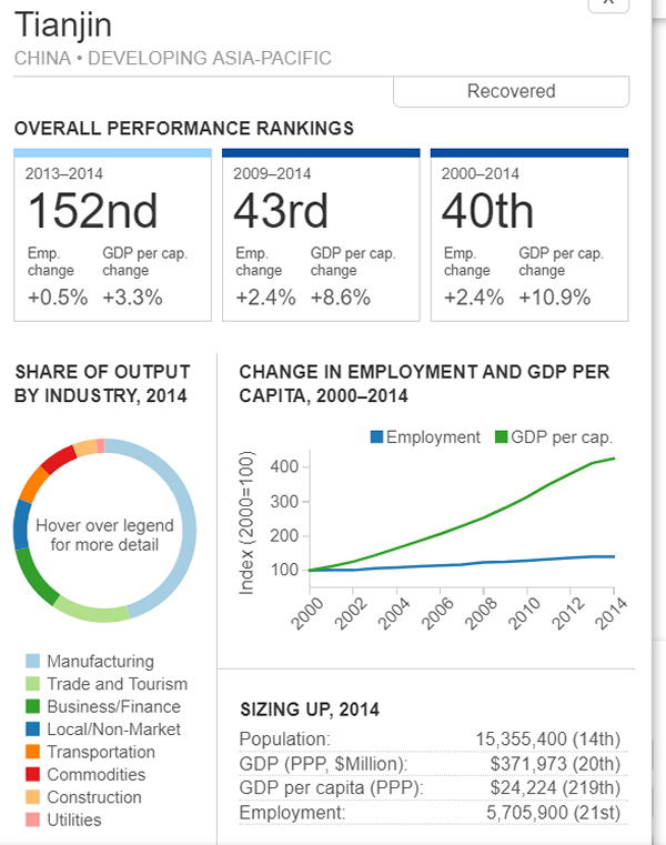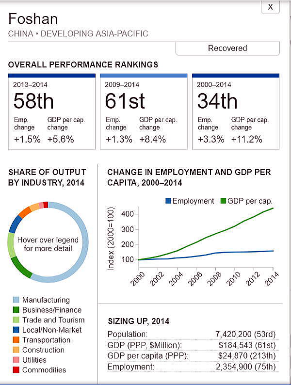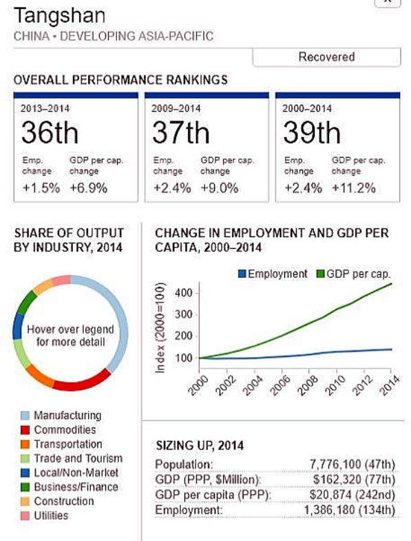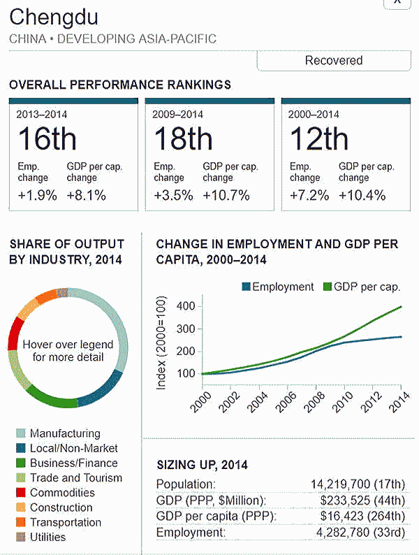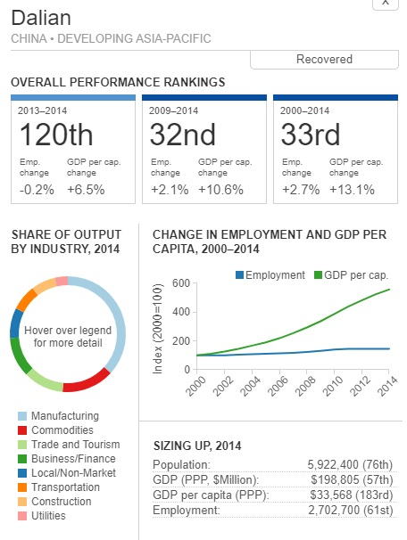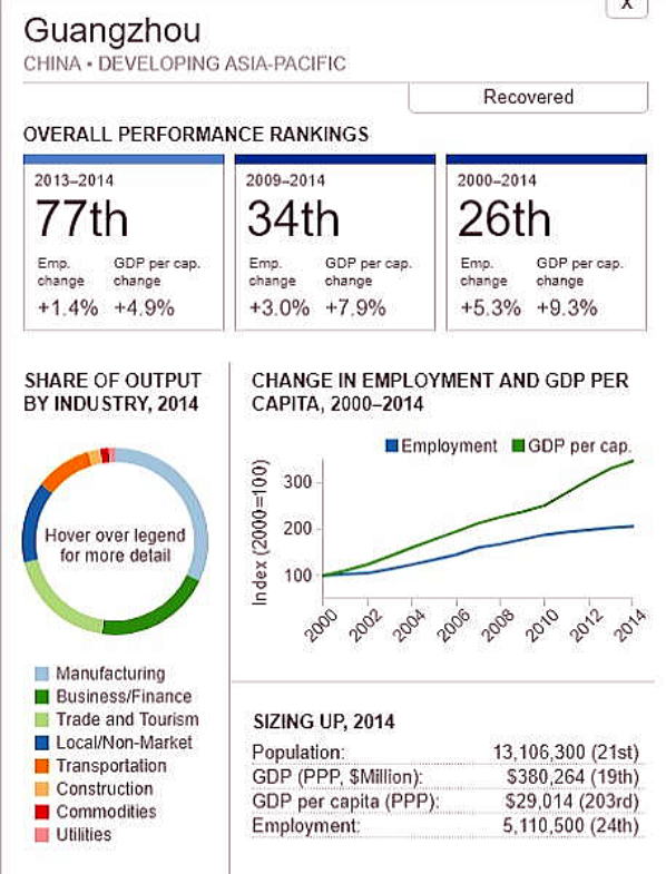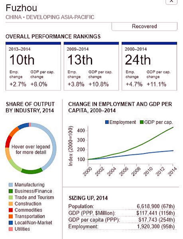 <世界300都市経済圏ランクマップ> 総合・一人当たりGDP・雇用 オリジナル出典:米国ブルッキングス研究所 第1位〜第50位 調査結果(総合、2000年〜2014年)を見てみます。 中国 東莞都市圏(1位/300) ![]() 中国 済南都市圏(2位/300) ![]() 中国 蘇州都市圏(3位/300) ![]() 中国 アモイ都市圏(4位/300) ![]() 中国 無錫都市圏(5位/300) ![]() 中国 福州都市圏(6位/300) ![]() 中国 杭州都市圏(7位/300) ![]() 中国 常州都市圏(8位/300) ![]() 中国 中山都市圏(9位/300) ![]() 中国 合肥都市圏(10位/300) ![]() 中国 深セン大都市圏(11位/300) ![]() 中国 成都都市圏(f第12位/300) ![]() 中国 南通都市圏(13位/300) ![]() 中国 徐州都市圏(14位/300) ![]() 中国 温州都市圏(15位/300) ![]() 中国 南寧都市圏(16位/300) ![]() 中国 煙台都市圏(17位/300) ![]() 中国 昆明都市圏(18位/300) ![]() 中国 南京都市圏(19位/300) ![]() 中国 ウルムチ都市圏(20位/300) ![]() 中国 ![]() 中国 青島都市圏(22位/300) ![]() マカオ 都市圏(23位/300) ![]() 中国 福州都市圏(24位/300) ![]() 中国 バトゥー都市圏(25位/300) ![]() 中国 広州市圏(26位/300) ![]() 中国 長 沙都市圏(27位/300) ![]() 中国 西安都市圏(28位/300) ![]() 中国 フヘハト都市圏(29位/300) ![]() 中国 南昌都市圏(30位/300) ![]() 中国 東営都市圏(31位/300) ![]() 中国 珠海都市圏(32位/300) ![]() 中国 大連都市圏(33位/300) ![]() 中国 仏山都市圏(34位/300) ![]() 中東 アラブ首長国連邦ドバイ都市圏(35位/300) ![]() 中国 北京大都市圏(36位/300) ![]() 中国 武漢都市圏(37位/300) ![]() ベトナム ホーチミン大都市圏(38位/300) ![]() 中国 唐山都市圏(39位/300) ![]() 中国 天津都市圏(40位/300) ![]() 中国 鄭州都市圏(41位/300) ![]() 中国 重慶大都市圏(42位/300) ![]() 中国 長春大都市圏(43位/300) ![]() アラブ 首長国連邦アブダビ都市圏(44位/300) ![]() インド デリー大都市圏(45位/300) ![]() 中東クウェート クウェート市(46位/300) ![]() マレーシア クアラルンプール大都市圏(47位/300) ![]() 中国 瀋陽都市圏(48位/300) ![]() ブルガリア ・ソフィア都市圏(49位/300) ![]() 中国 上海都市圏(50位/300) ![]() つづく 51−100