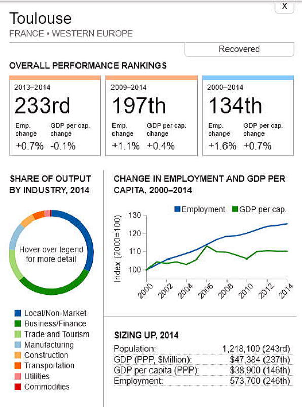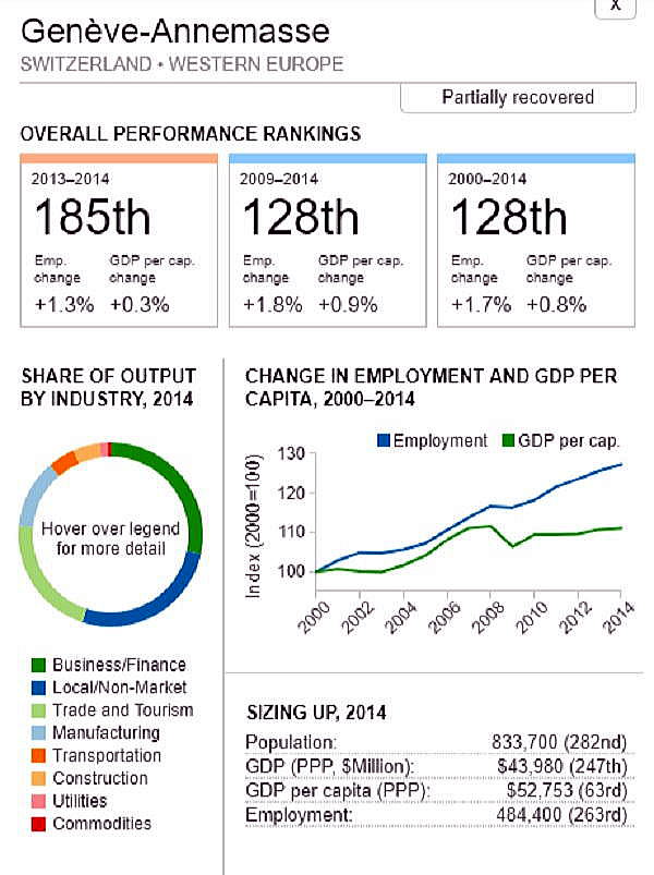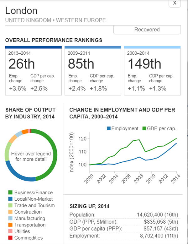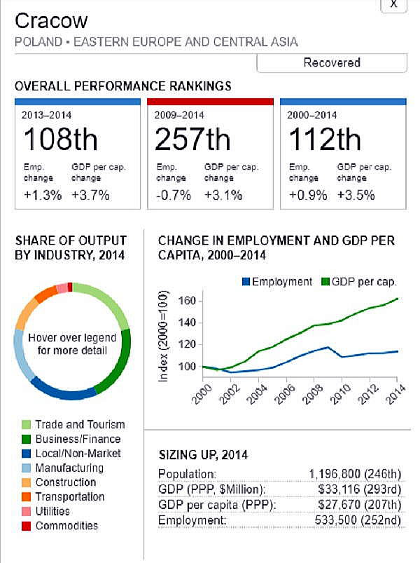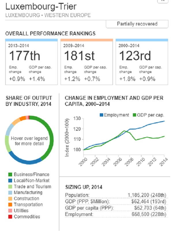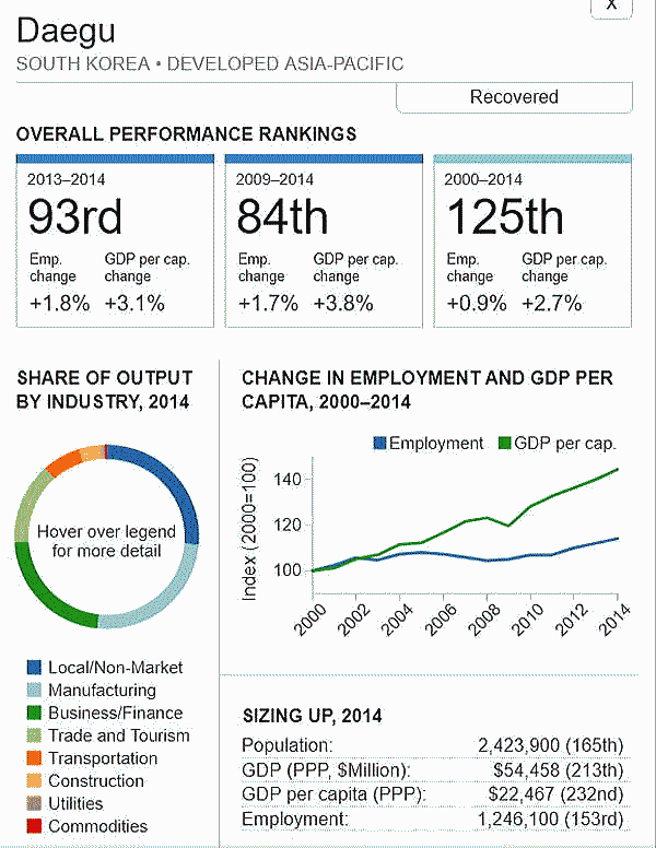 <世界300都市経済圏ランクマップ> 総合・一人当たりGDP・雇用 オリジナル出典:米国ブルッキングス研究所 第101位〜第150位 調査結果(総合、2000年〜2014年)を見てみます。 ブラジル フォルタレザ都市圏(101位/300) ![]() ブラジル キャンピナス都市圏(102位/300) ![]() カナダ ケベックシティ度試験(103位/300)青山、池田 ![]() 南アフリカ プレトリア都市圏(104位/300) ![]() 中華民国 新竹都市圏(105位/300) 青山 ![]() イスラエル ハイファ都市圏(106位/300) ![]() 中華民国 台南都市圏(107位/300) ![]() オーストラリア メルボルン都市圏(108位/300) 池田 ![]() メキシコ モンテレー都市圏(109位/300) ![]() 香港 大都市圏(110位/300)青山、池田 ![]() 米国 オースティン都市圏(111位/300) ![]() ポーランド クラクフ都市圏(112位/300)青山、池田 ![]() 中華民国 台北都市圏(113位/300)青山、池田 ![]() 南アフリカ イーストランド(114位/300) ![]() ブラジル サルバドール都市圏(115位/300) ![]() ニュージーランド オークランド都市圏(116位/300) ![]() 南アフリカ ヨハネスブルグ都市圏(117位/300) ![]() 米国 ヒューストン大都市圏(118位/300) ![]() 韓国 釜山市・ウルサン大都市圏(119位/300)青山、池田 市メキシコ グアダラハラ大都市圏(120位/300) ![]() 中華民国 高雄中大都市圏(121位/300) ![]() カナダ バンクーバー大都市圏(122位/300)..青山、池田 ![]() ルクセンブルグ・トリーア都市圏(123位/300) ![]() プラハ都市圏(124位/300) ![]() 韓国 大邱都市圏(125位/300) ![]() ヴェネズエラ カラカス都市圏(126位/300) ![]() ブラジル・リオデジャネイロ都市圏(127位/300) ![]() スイス ジュネーヴ都市圏(128位/300) ![]() スイス チューリッヒ都市圏(129位/300) ![]() ブラジル ポートアレグレ都市圏(131位/300) ![]() 米国 ベーカースフィールド都市圏(132位/300) beka-カナダ トロント都市圏(133位/300)..青山、池田 ![]() フランス トゥールーズ都市圏(134位/300).池田 ![]() ノルウェー オスロ都市圏(135位/300) ![]() ポーランド カトヴィツェ - オストラバ都市圏(136位/300) ![]() 米国 ポートランド都市圏(137位/300)青山、池田 ![]() 米国 ソルトレイクシティー都市圏(138位/300) ![]() 米国 ローリー都市圏(139位/300) ![]() カナダ オタワ都市圏(140位/300)青山、池田 ![]() 米国 バトンルージュ都市圏(141位/300) ![]() ハンガリー ブダペスト都市圏(142位/300) ![]() オーストラリア シドニー都市圏(143位/300) 青山、池田 ![]() 英国(スコットランド)、エジンバラ大都市圏(144位/300)..青山、池田 ![]() オーストラリア アデレード都市圏(145位/300) ![]() 米国 サンアントニオ都市圏(146位/300) ![]() スウーデン ストックホルム都市圏(147位/300) ![]() 南アフリカ ケープタウン都市圏(148位/300) ![]() 英国 ロンドン大都市圏(149位/300)..青山、池田 ![]() 米国 リバーサイド都市圏(150位/300) ![]() つづく 151−200