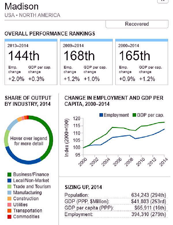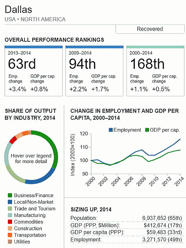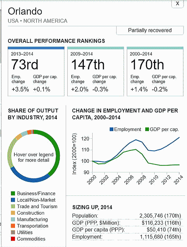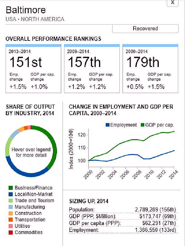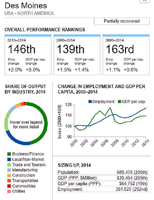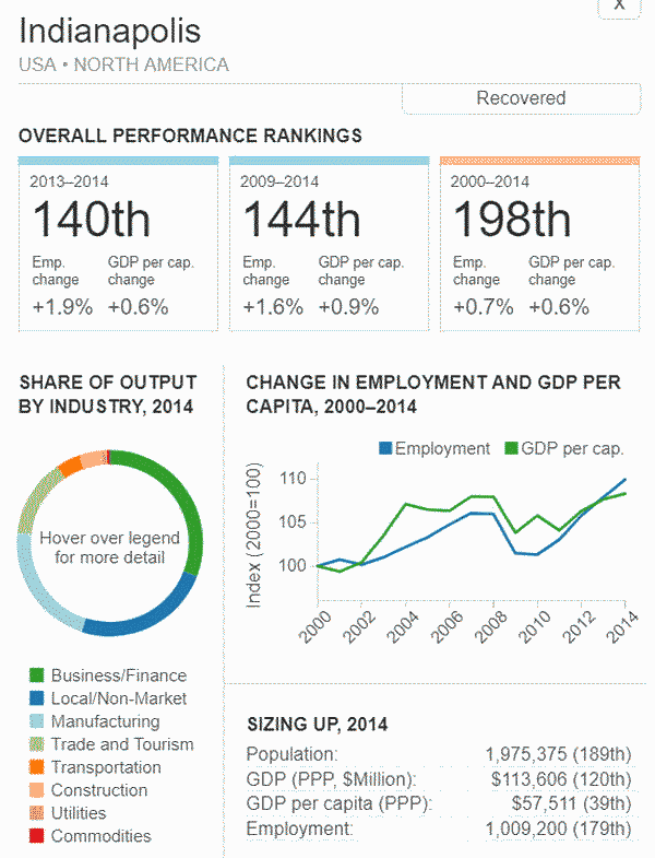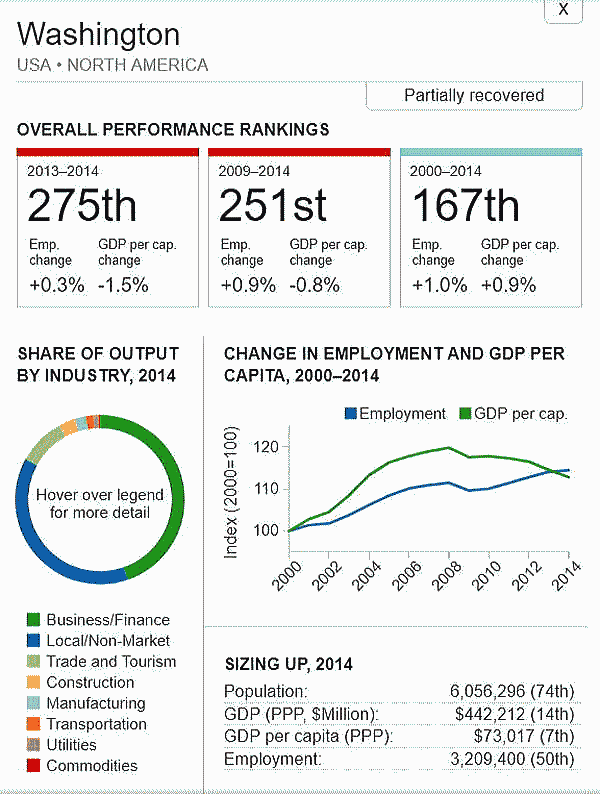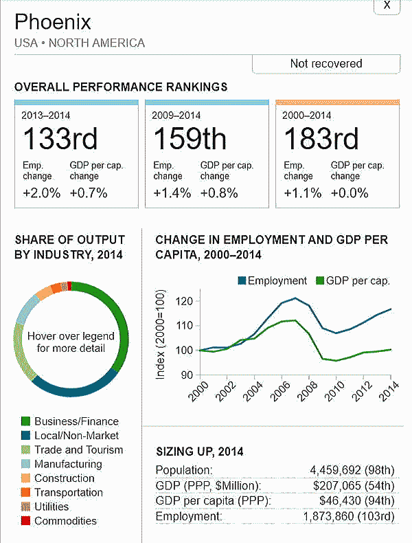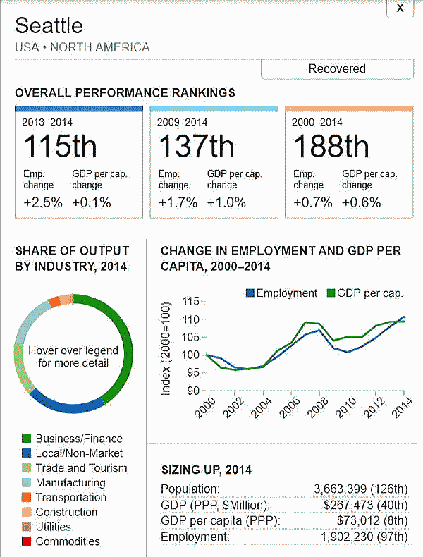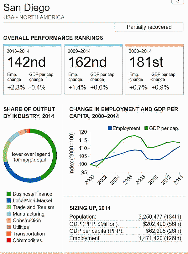 G7 オリジナル出典:米国ブルッキングス研究所 ここではいわゆるG7諸国、すなわち米、英、仏、独、伊、加、日の大都市圏(各3都市圏)について、調査結果(総合、2000年〜2014年)を見てみます。 想定されるのは、G7諸国の経済は行き着くところまで来た、いわば成熟経済社会であり停滞社会であって、中国、東南アジアなどのような高い順位は望めないということです。公表は最後の部分にあります。 G7諸国の大都市圏、都市圏の顕著な特徴は、 2008年9月のいわゆるリーマンショックの影響を受けていることで、以降、激しい雇用の落ち込みがあり、一人当たりGDPも落ち込みとなり、なかなかその影響を克服しきれていないことにあります。 これはグローバル化された経済下にある欧米日本の大都市圏、都市圏が共通に持つ弊害でもあります。多くの都市ではリーマンショックの影響を回復するのに長い年月をようしているだけでなく、それをきっかけに停滞社会となっている都市圏も多くあります。とくに米国のデトロイト都市圏は300都市圏中300位となっています。これはリーマンショックだけでなく、同地の主要産業である自動車工業が日本、ドイツなどからの自動車輸入とあわせ壊滅的な影響を受けていることにあり、トランプ大統領誕生のひとつの要因となっています。 米国デトロイト都市圏(300位/300) ![]() これは日本の都市圏にあっても類似しており、たとえば札幌都市圏では、以下のように雇用が壊滅様態を続けていることが分かります。そしてこれが東京ぢ都市圏への人口流入の遠因となっています。 日本札幌都市圏(289位/300) ![]() そのなかでカナダの諸都市圏は、いずれも最上位グループないし第二位グループにあり、雇用を大幅に改善していますが、一人当たりGDP(ppp)は依然として停滞したままとなっています。 ![]() 出典ブルッキングス研究所(米国)https://www.brookings.edu/research/global-metro-monitor/ ◆G7諸国の大都市圏(各3都市圏) 米国 米国は以下の地図にあるように、青色系と、赤色系が半々と混在していることです。青色系は南部と太平洋岸にあり、一方、赤色系はニューイングランドなど東部、シカゴなどにあり2極化していることが分かります。規模としては、ニューヨークが群を抜いており、その次は、ヒューストンなど多岐にわたっています。 ![]() 出典ブルッキングス研究所(米国) 米国 米国は以下の地図にあるように、青色系と、赤色系が半々と混在していることです。青色系は南部と太平洋岸にあり、一方、赤色系はニューイングランドなど東部、シカゴなどにあり2極化していることが分かります。規模としては、ニューヨークが群を抜いており、その次は、ヒューストンなど多岐にわたっています。 ![]() 出典ブルッキングス研究所(米国) 米国 オースティン都市圏(111位/300) ![]() 米国 ヒューストン大都市圏(118位/300) ![]() 米国 ベーカースフィールド都市圏(132位/300) ![]() 米国 ポートランド都市圏(137位/300) ![]() 米国 ソルトレイクシティー都市圏(138位/300) ![]() 米国 ローリー都市圏(139位/300) ![]() 米国 バトンルージュ都市圏(141位/300) ![]() 米国 サンアントニオ都市圏(118位/300) ![]() 米国 リバーサイド都市圏(150位/150) ![]() 米国 エルパソ都市圏(153位/300) ![]() 米国 オクラホマシテイー大都市圏(156位/300) ![]() 米国 ダーハム都市圏(160位/300) ![]() 米国 ナッシュビル都市圏(162位/300) ![]() 米国 デスモンズア都市圏(163位/300) ![]() 米国 ラスベガス都市圏(164位/300) ![]() 米国 マジソン都市圏(165位/300) ![]() 米国 ワシントンDC大都市圏(167位/300) 青山・池田 ![]() 米国 ダラス大都市圏(168位/300) ![]() 米国・リトルロック都市圏(169位/300) ![]() 米国 オーランド市圏(170位/300)..青山、池田 ![]() 米国 ホノルル大都市圏(171位/300)..青山、池田 ![]() 米国 ボルティモア都市圏(179位/300) ![]() 米国 サンディエゴ大都市圏(181位/300)..青山 ![]() 米国 フェニックス都市圏(183位/300) ![]() 米国 シアトル大都市圏(188位/300)..青山、池田 ![]() 米国 ノックスビル都市圏(193位/300) ![]() 米国 シャーロッテ都市圏(195位/300) ![]() 米国 インディアナポリス都市圏(198位/300) ![]() 米国 タルサ大都市圏(199位/300) ![]() 米国 アレンタウン市圏(200位/300) ![]() 米国 オマサ都市圏(205位/300) ![]() 米国 マイアミ大都市圏(206位/300). ![]() 米国 ニューヨーク大都市圏(207位/300)..青山、池田 ![]() 米国 オックスナード大都市圏(222位/300). ![]() 米国 サクラメント都市圏(210位/300).青山、池田 ![]() 米国 ロサンゼルス大都市圏(218位/300).青山、池田 ![]() 米国 リッチモンド都市圏(219位/300) ![]() 米国 デンバー大都市圏(220位/300).. ![]() 米国 ロサンゼルス大都市圏(221位/300)..青山、池田 ![]() 米国 ボストン大都市圏(224/300) 青山・池田 ![]() 米国 コロンバス都市圏(226位/300) ![]() 米国 アルバニー都市圏(226位/300) ![]() 米国 フレスノ都市圏(230位/300) ![]() 米国 ツーソン都市圏(228位/300) ![]() 米国 ミネアポリス都市圏(235位/300) 青山、池田 ![]() 米バージニアビーチ都市圏(236位/300) ![]() 米国 ジャクソンビル都市圏(237位/300) ![]() 米国 バッファロ