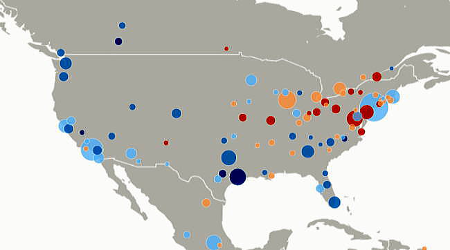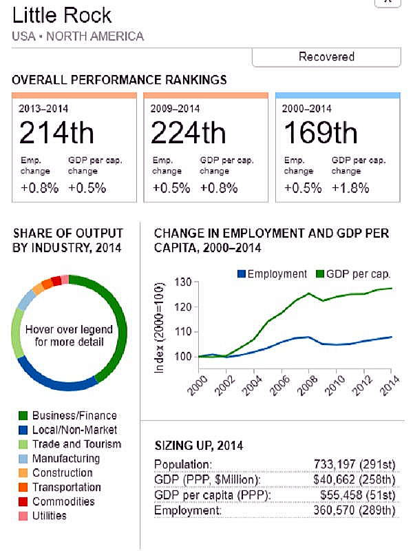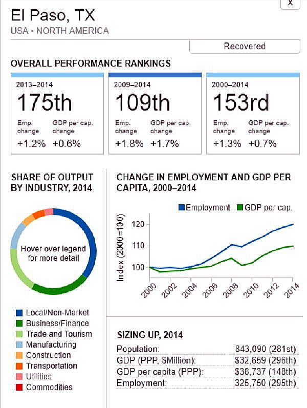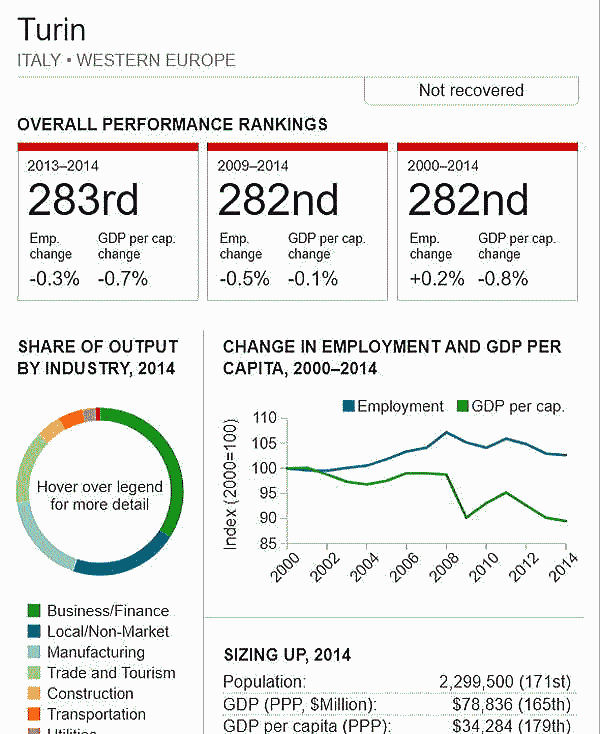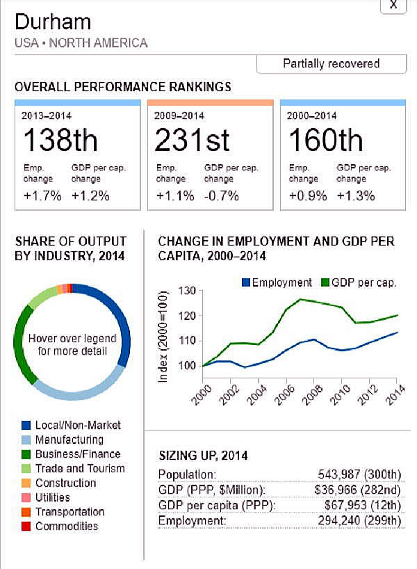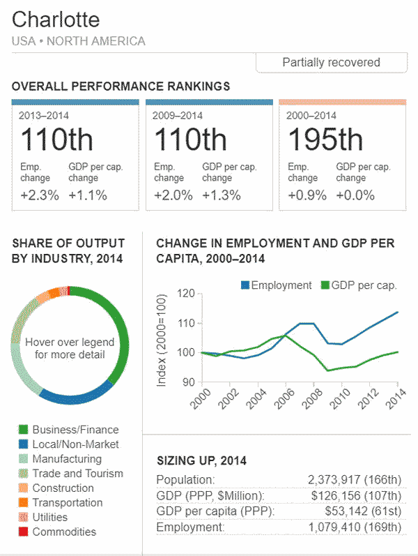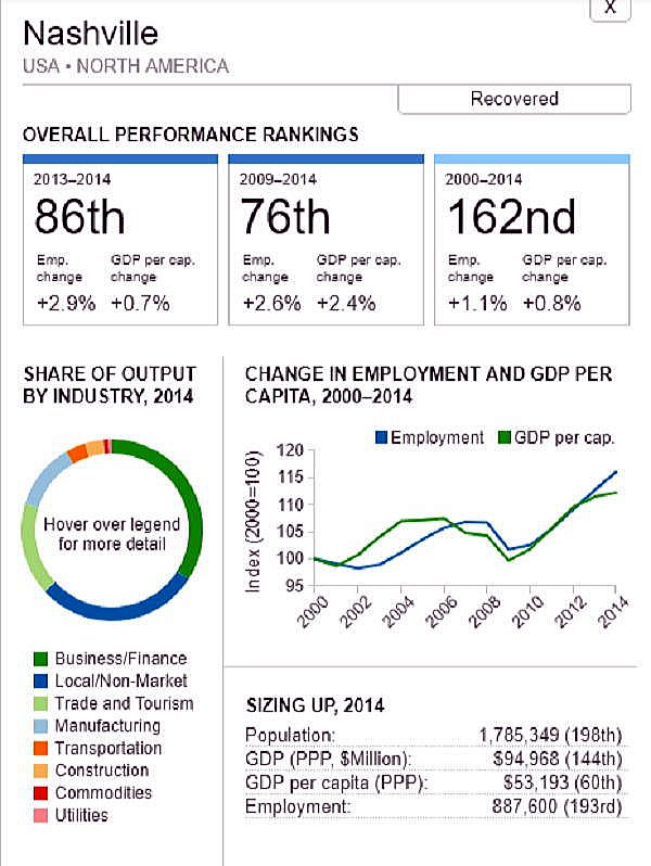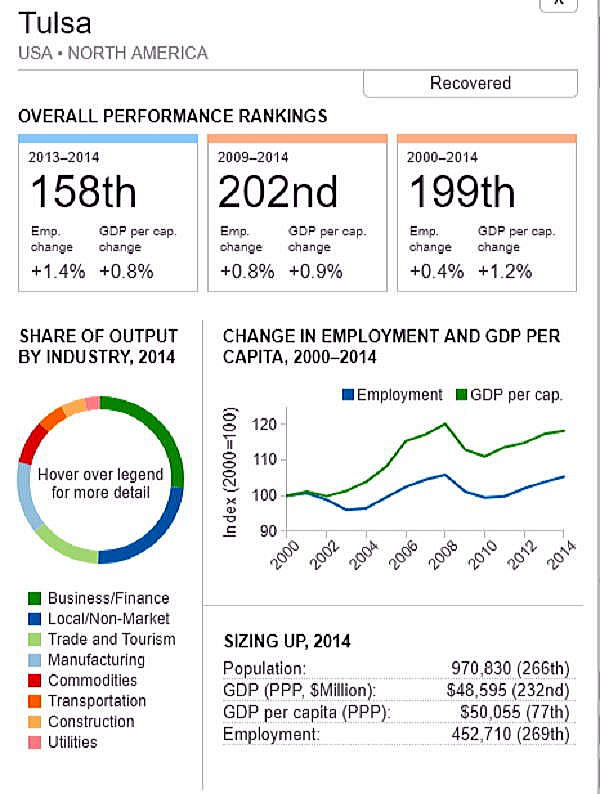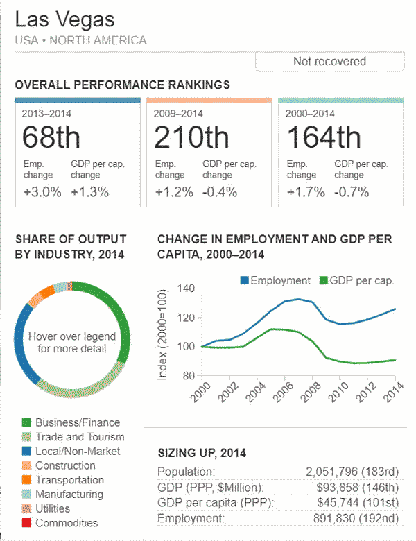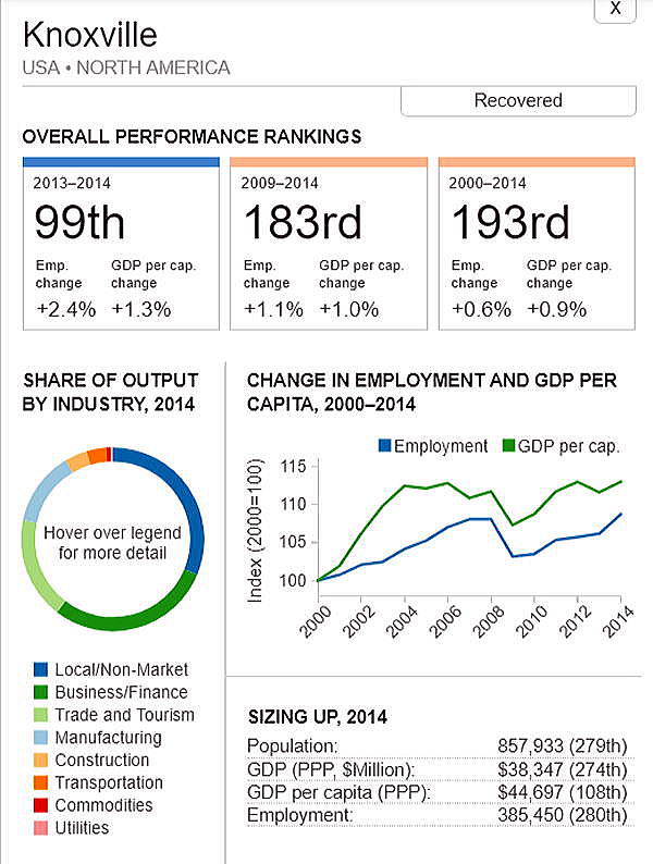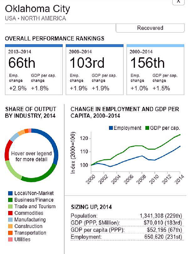 G7 オリジナル出典:米国ブルッキングス研究所 ここではいわゆるG7諸国、すなわち米、英、仏、独、伊、加、日の大都市圏(各3都市圏)について、調査結果(総合、2000年〜2014年)を見てみます。 想定されるのは、G7諸国の経済は行き着くところまで来た、いわば成熟経済社会であり停滞社会であって、中国、東南アジアなどのような高い順位は望めないということです。公表は最後の部分にあります。 G7諸国の大都市圏、都市圏の顕著な特徴は、 2008年9月のいわゆるリーマンショックの影響を受けていることで、以降、激しい雇用の落ち込みがあり、一人当たりGDPも落ち込みとなり、なかなかその影響を克服しきれていないことにあります。 これはグローバル化された経済下にある欧米日本の大都市圏、都市圏が共通に持つ弊害でもあります。多くの都市ではリーマンショックの影響を回復するのに長い年月をようしているだけでなく、それをきっかけに停滞社会となっている都市圏も多くあります。とくに米国のデトロイト都市圏は300都市圏中300位となっています。これはリーマンショックだけでなく、同地の主要産業である自動車工業が日本、ドイツなどからの自動車輸入とあわせ壊滅的な影響を受けていることにあり、トランプ大統領誕生のひとつの要因となっています。 米国デトロイト都市圏(300位/300) ![]() これは日本の都市圏にあっても類似しており、たとえば札幌都市圏では、以下のように雇用が壊滅様態を続けていることが分かります。そしてこれが東京ぢ都市圏への人口流入の遠因となっています。 日本札幌都市圏(289位/300) ![]() そのなかでカナダの諸都市圏は、いずれも最上位グループないし第二位グループにあり、雇用を大幅に改善していますが、一人当たりGDP(ppp)は依然として停滞したままとなっています。 ![]() 出典ブルッキングス研究所(米国)https://www.brookings.edu/research/global-metro-monitor/ ◆G7諸国の大都市圏(各3都市圏) 米国 米国は以下の地図にあるように、青色系と、赤色系が半々と混在していることです。青色系は南部と太平洋岸にあり、一方、赤色系はニューイングランドなど東部、シカゴなどにあり2極化していることが分かります。規模としては、ニューヨークが群を抜いており、その次は、ヒューストンなど多岐にわたっています。 ![]() 出典ブルッキングス研究所(米国) 米国 米国は以下の地図にあるように、青色系と、赤色系が半々と混在していることです。青色系は南部と太平洋岸にあり、一方、赤色系はニューイングランドなど東部、シカゴなどにあり2極化していることが分かります。規模としては、ニューヨークが群を抜いており、その次は、ヒューストンなど多岐にわたっています。 ![]() 出典ブルッキングス研究所(米国) 米国 オースティン都市圏(111位/300) ![]() 米国 ヒューストン大都市圏(118位/300) ![]() 米国 ベーカースフィールド都市圏(132位/300) ![]() 米国 ポートランド都市圏(137位/300) ![]() 米国 ソルトレイクシティー都市圏(138位/300) ![]() 米国 ローリー都市圏(139位/300) ![]() 米国 バトンルージュ都市圏(141位/300) ![]() 米国 サンアントニオ都市圏(118位/300) ![]() 米国 リバーサイド都市圏(150位/150) ![]() 米国 エルパソ都市圏(153位/300) ![]() 米国 オクラホマシテイー大都市圏(156位/300) ![]() 米国 ダーハム都市圏(160位/300) ![]() 米国 ナッシュビル都市圏(162位/300) ![]() 米国 デスモンズア都市圏(163位/300) ![]() 米国 ラスベガス都市圏(164位/300) ![]() 米国 マジソン都市圏(165位/300) ![]() 米国 ワシントンDC大都市圏(167位/300) 青山・池田 ![]() 米国 ダラス大都市圏(168位/300) ![]() 米国・リトルロック都市圏(169位/300) ![]() 米国 オーランド市圏(170位/300)..青山、池田 ![]() 米国 ホノルル大都市圏(171位/300)..青山、池田 ![]() 米国 ボルティモア都市圏(179位/300) ![]() 米国 サンディエゴ大都市圏(181位/300)..青山 ![]() 米国 フェニックス都市圏(183位/300) ![]() 米国 シアトル大都市圏(188位/300)..青山、池田 ![]() 米国 ノックスビル都市圏(193位/300) ![]() 米国 シャーロッテ都市圏(195位/300) ![]() 米国 インディアナポリス都市圏(198位/300) ![]() 米国 タルサ大都市圏(199位/300) ![]() 米国 アレンタウン市圏(200位/300) ![]() 米国 オマサ都市圏(205位/300) ![]() 米国 マイアミ大都市圏(206位/300). ![]() 米国 ニューヨーク大都市圏(207位/300)..青山、池田 ![]() 米国 オックスナード大都市圏(222位/300). ![]() 米国 サクラメント都市圏(210位/300).青山、池田 ![]() 米国 ロサンゼルス大都市圏(218位/300).青山、池田 ![]() 米国 リッチモンド都市圏(219位/300) ![]() 米国 デンバー大都市圏(220位/300).. ![]() 米国 ロサンゼルス大都市圏(221位/300)..青山、池田 ![]() 米国 ボストン大都市圏(224/300) 青山・池田 ![]() 米国 コロンバス都市圏(226位/300) ![]() 米国 アルバニー都市圏(226位/300) ![]() 米国 フレスノ都市圏(230位/300) ![]() 米国 ツーソン都市圏(228位/300) ![]() 米国 ミネアポリス都市圏(235位/300) 青山、池田 ![]() 米バージニアビーチ都市圏(236位/300) ![]() 米国 ジャクソンビル都市圏(237位/300) ![]() 米国 バッファロ