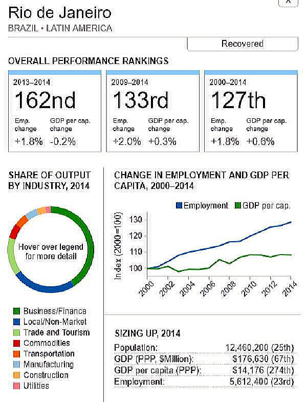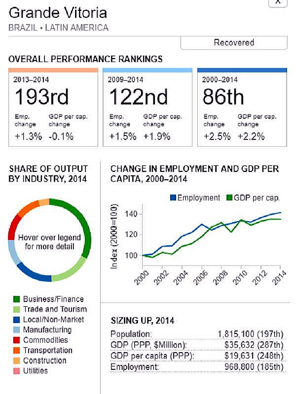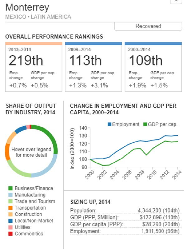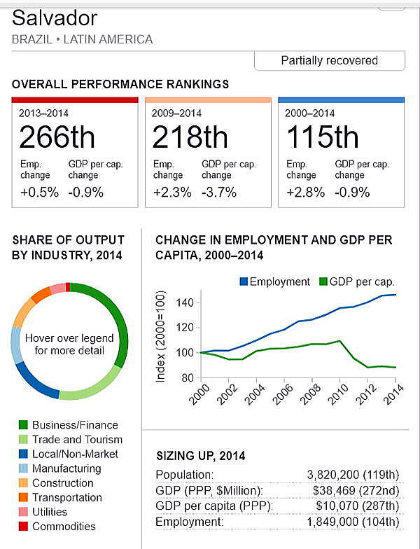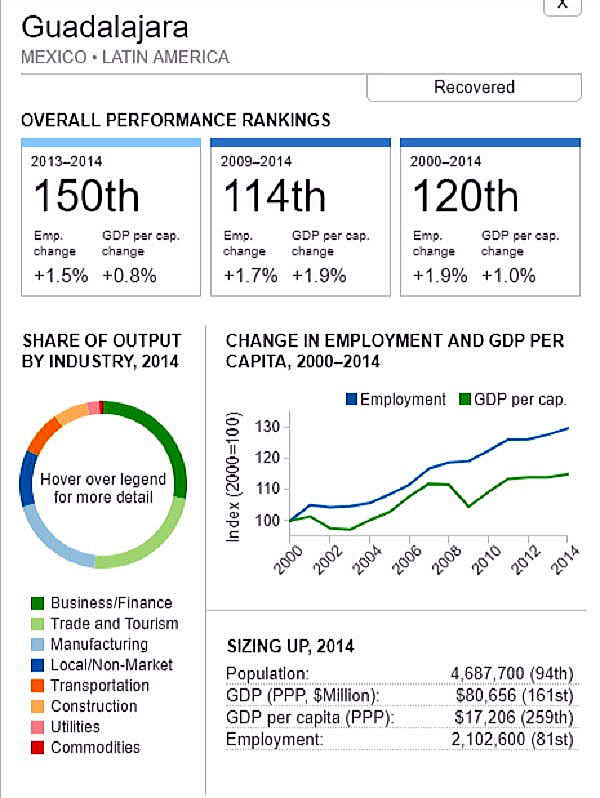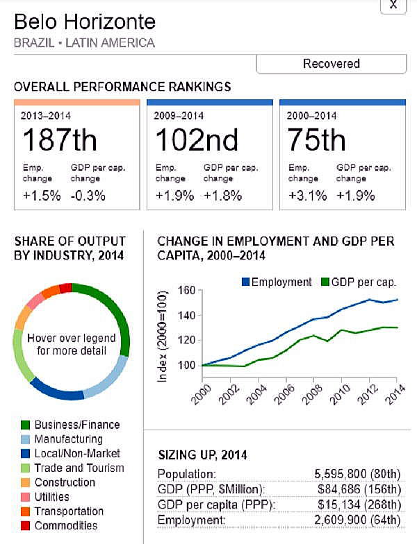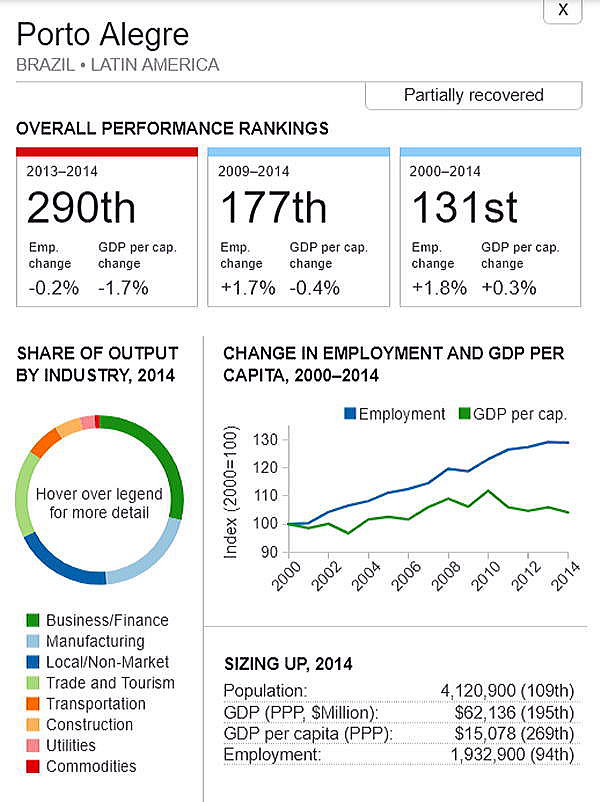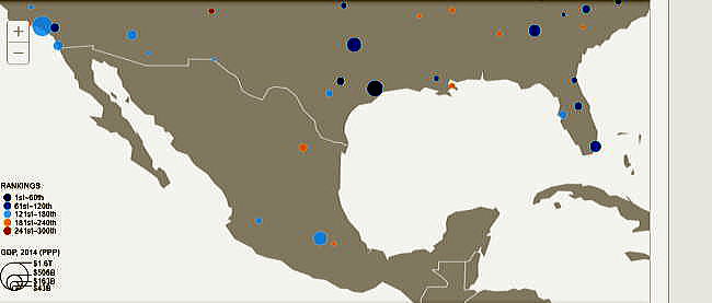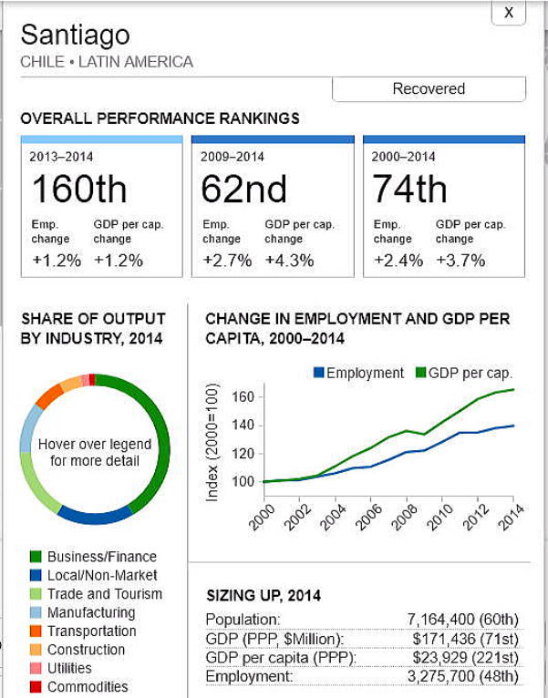 カナダ・中南米 オリジナル出典:米国ブルッキングス研究所 ここではカナダと中南米諸国の大都市圏について、調査結果(総合、2000年〜2014年)を見てみます。 ![]() 出典ブルッキングス研究所(米国)https://www.brookings.edu/research/global-metro-monitor/ ◆カナダ カナダ(全数、7都市圏) カナダの大都市圏はいずれも米国との国境沿いにあり東側の太平洋に近い都市圏の伸び率が高く、アメリカ東部に近い都市の伸び率は中位か低く、成熟社会化しています ![]() 出典ブルッキングス研究所(米国) <世界300都市経済圏ランクマップ> 総合・一人当たりGDP・雇用 カナダ エドモントン大都市圏(83位/300) ![]() カナダ カルガリー大都市圏(90位/300)..青山、池田 ![]() カナダ ケベックシティ度試験(103位/300)青山、池田 ![]() カナダ バンクーバー大都市圏(122位/300)..青山、池田 ![]() カナダ トロント都市圏(133位/300)..青山、池田 ![]() カナダ オタワ都市圏(140位/300) ![]() カナ_ ウィニペッグ都市圏(151位/300) ![]() カナダ モントリオール都市圏(159位/300)..青山、池田 ![]() 。 中米 中米(全数、4) ![]() 出典ブルッキングス研究所(米国) メキシコ プエブラ都市圏(98位/300) ![]() メキシコ モンテレー都市圏(109位/300) ![]() メキシコ グアダラハラ大都市圏(120位/300) ![]() メキシコ メキシコシティー大都市圏(130位/300) 青山 ![]() 南米 ![]() 南米(全数、18) ペルー リマ都市圏(60位/300) ![]() コロンビア メディリン都市圏(63位/300) ![]() アルゼンチン ブエノスアイレス都市圏(87位/300) ![]() ブラジル ブラジリア都市圏(71位/300) ![]() ブラジル ベロオリゾンテ都市圏(75位/300) ![]() ブラジル レシフェ都市圏(76位/300) ![]() ブラジル クリティバ都市圏(82位/300) ![]() ブラジル グランデ・ヴィトーリア都市圏(86位/300) ![]() ブラジル サンパウロ都市圏(95位/300) ![]() ブラジル フォルタレザ都市圏(101位/300) ![]() ブラジル・キャンピナス都市圏(102位/300) ![]() ブラジル・サルバドール都市圏(115位/300) ![]() ブラジル リオデジャネイロ都市圏(127位/300) ![]() ブラジル ポートアレグレ都市圏(131位/300) ![]() ヴェネズエラ カラカス都市圏(126位/300) ![]() コロンビア ボゴタ都市圏(51位/300) ![]() チリ サンチアゴ都市圏(74位/300) ![]() プエルトリコ サンフアン都市圏(297位/300) ![]() 以上、カナダと中南米の都市圏の順位を見てきましたが、おおよそ以下のことが言えます。 カナダ、メキシコは、すべての都市圏が中位の位置にあり、南米諸国は、最上位グループ、第二位グループにあることが分かる。 <カナダ、中南米地域都市圏の分布> 1位から 60位 コロンビア、ペルー 61位から120位 アルゼンチン、ベネズエラ、ブラジル 121位から180位 カナダ、メキシコ、コロンビア 181位から240位 該当なし 241位から300位 該当なし つづく G7へ