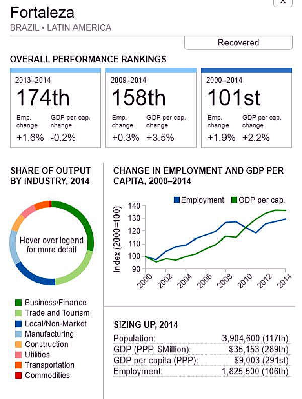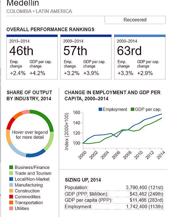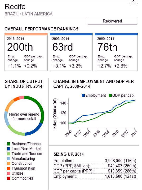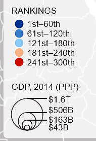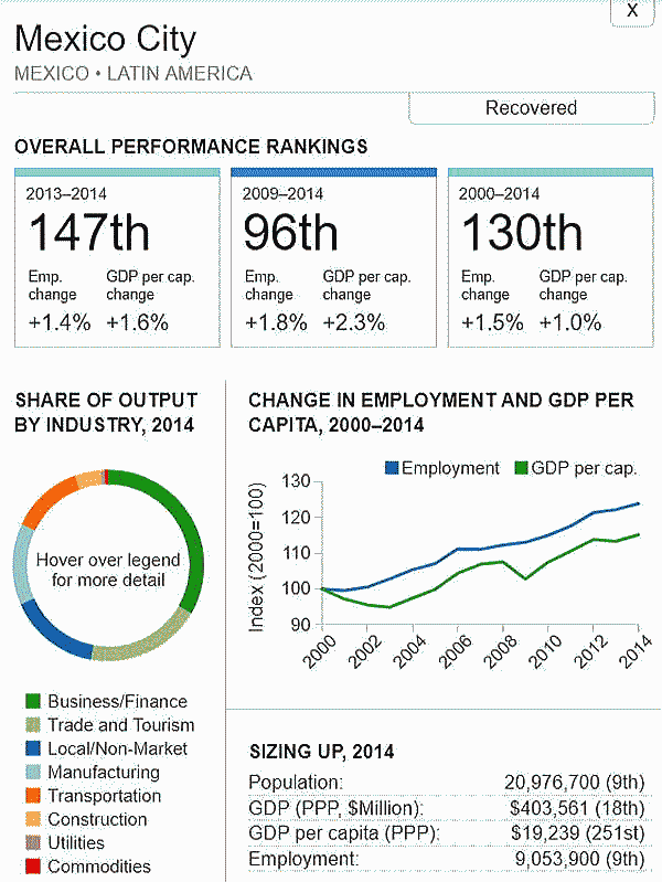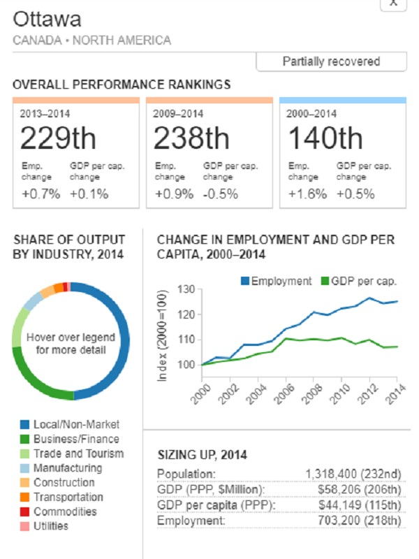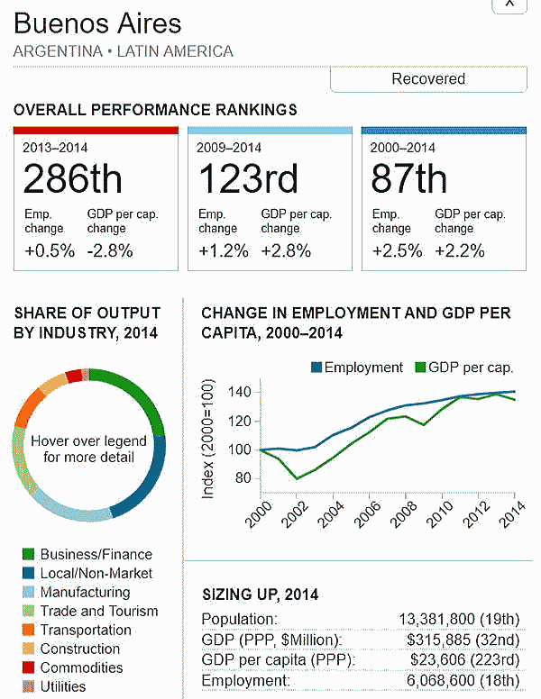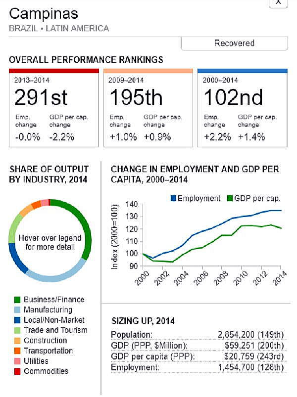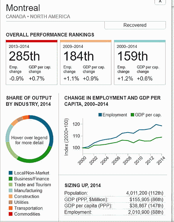 カナダ・中南米 オリジナル出典:米国ブルッキングス研究所 ここではカナダと中南米諸国の大都市圏について、調査結果(総合、2000年〜2014年)を見てみます。 ![]() 出典ブルッキングス研究所(米国)https://www.brookings.edu/research/global-metro-monitor/ ◆カナダ カナダ(全数、7都市圏) カナダの大都市圏はいずれも米国との国境沿いにあり東側の太平洋に近い都市圏の伸び率が高く、アメリカ東部に近い都市の伸び率は中位か低く、成熟社会化しています ![]() 出典ブルッキングス研究所(米国) <世界300都市経済圏ランクマップ> 総合・一人当たりGDP・雇用 カナダ エドモントン大都市圏(83位/300) ![]() カナダ カルガリー大都市圏(90位/300)..青山、池田 ![]() カナダ ケベックシティ度試験(103位/300)青山、池田 ![]() カナダ バンクーバー大都市圏(122位/300)..青山、池田 ![]() カナダ トロント都市圏(133位/300)..青山、池田 ![]() カナダ オタワ都市圏(140位/300) ![]() カナ_ ウィニペッグ都市圏(151位/300) ![]() カナダ モントリオール都市圏(159位/300)..青山、池田 ![]() 。 中米 中米(全数、4) ![]() 出典ブルッキングス研究所(米国) メキシコ プエブラ都市圏(98位/300) ![]() メキシコ モンテレー都市圏(109位/300) ![]() メキシコ グアダラハラ大都市圏(120位/300) ![]() メキシコ メキシコシティー大都市圏(130位/300) 青山 ![]() 南米 ![]() 南米(全数、18) ペルー リマ都市圏(60位/300) ![]() コロンビア メディリン都市圏(63位/300) ![]() アルゼンチン ブエノスアイレス都市圏(87位/300) ![]() ブラジル ブラジリア都市圏(71位/300) ![]() ブラジル ベロオリゾンテ都市圏(75位/300) ![]() ブラジル レシフェ都市圏(76位/300) ![]() ブラジル クリティバ都市圏(82位/300) ![]() ブラジル グランデ・ヴィトーリア都市圏(86位/300) ![]() ブラジル サンパウロ都市圏(95位/300) ![]() ブラジル フォルタレザ都市圏(101位/300) ![]() ブラジル・キャンピナス都市圏(102位/300) ![]() ブラジル・サルバドール都市圏(115位/300) ![]() ブラジル リオデジャネイロ都市圏(127位/300) ![]() ブラジル ポートアレグレ都市圏(131位/300) ![]() ヴェネズエラ カラカス都市圏(126位/300) ![]() コロンビア ボゴタ都市圏(51位/300) ![]() チリ サンチアゴ都市圏(74位/300) ![]() プエルトリコ サンフアン都市圏(297位/300) ![]() 以上、カナダと中南米の都市圏の順位を見てきましたが、おおよそ以下のことが言えます。 カナダ、メキシコは、すべての都市圏が中位の位置にあり、南米諸国は、最上位グループ、第二位グループにあることが分かる。 <カナダ、中南米地域都市圏の分布> 1位から 60位 コロンビア、ペルー 61位から120位 アルゼンチン、ベネズエラ、ブラジル 121位から180位 カナダ、メキシコ、コロンビア 181位から240位 該当なし 241位から300位 該当なし つづく G7へ