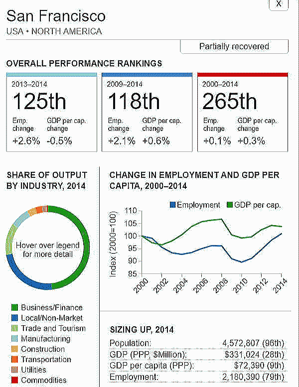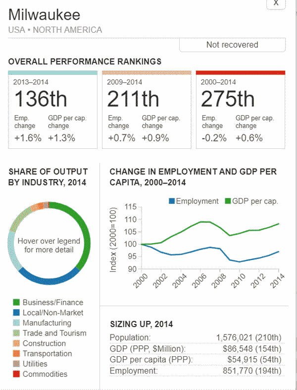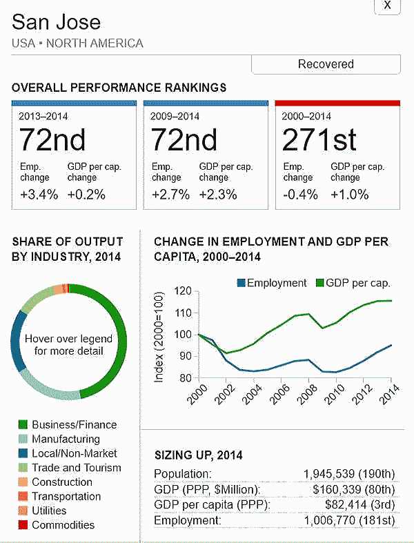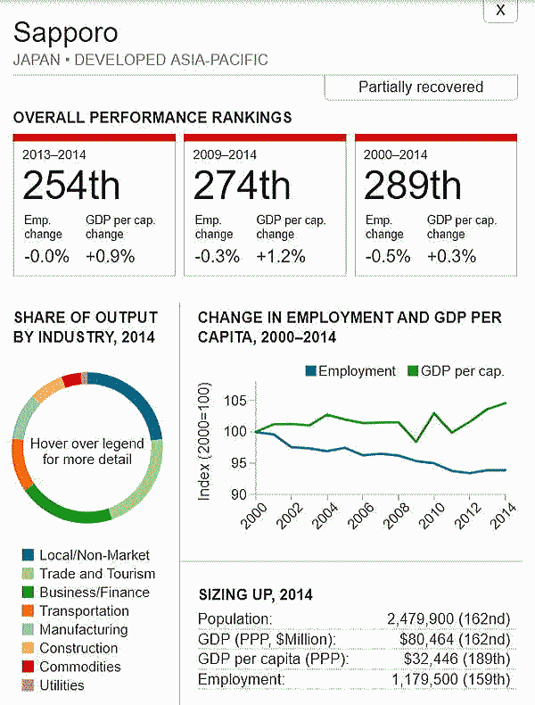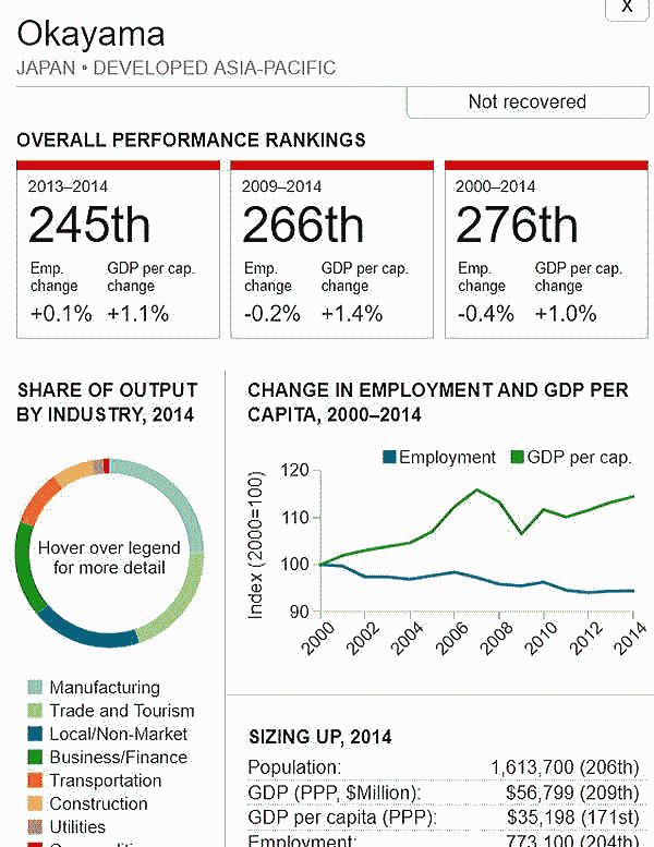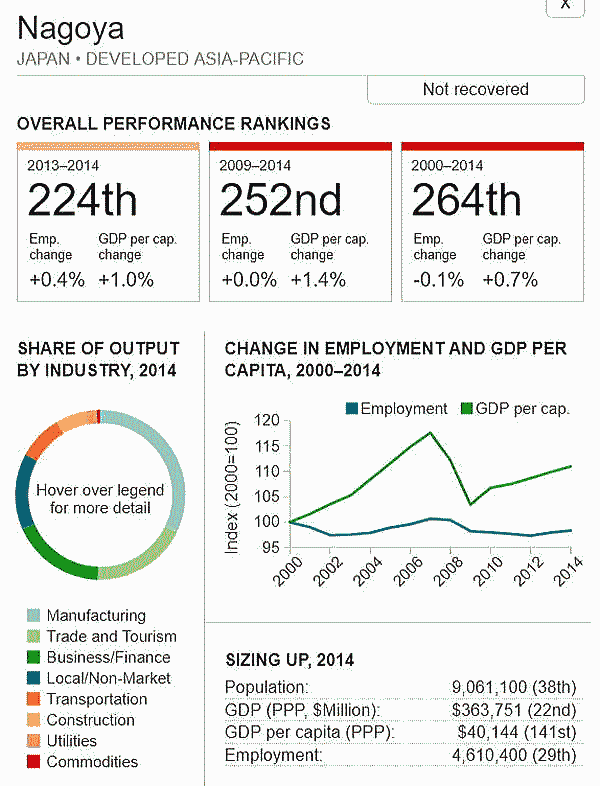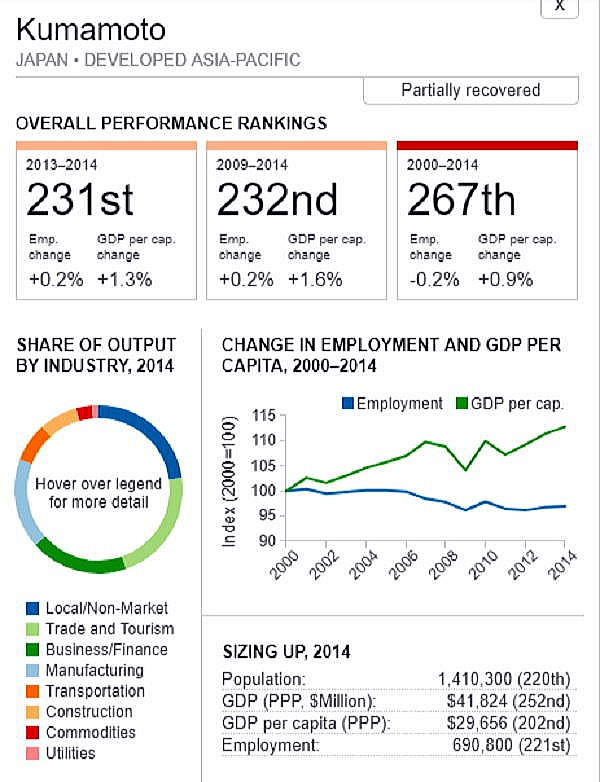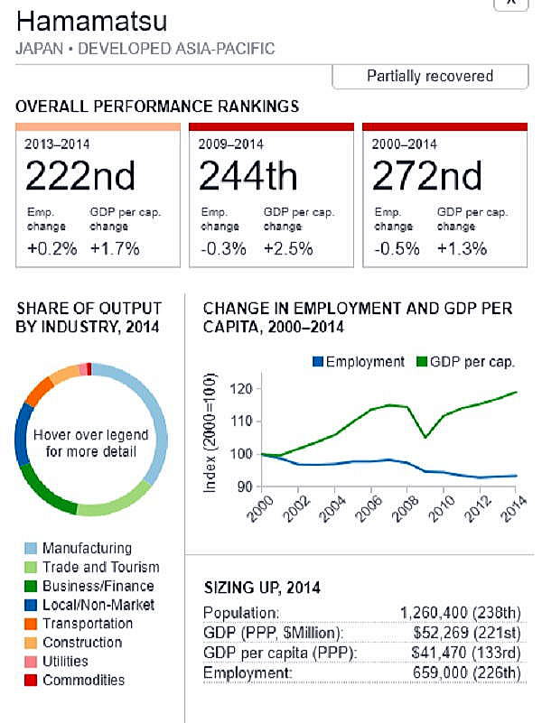 <世界300都市経済圏ランクマップ> 総合・一人当たりGDP・雇用 オリジナル出典:米国 ブルッキングス研究所 第251位〜第300位 調査結果(総合、2000年〜2014年)を見てみます。 米国 タンパ都市圏(251位/300) 青山 ![]() フランス ストラスブ-ルグ都市圏(252位/300)..池田 ![]() 米国 グリーンビル都市圏(253位/300) ![]() 米国 プロヴィデンス都市圏(254位/300) ![]() 米国 アクロン都市圏(255位/300) ![]() 米国 カンサスシティー都市圏(256位/300) ![]() 米国 フィラデルフィア大都市圏(257位/300) ![]() 米国 アトランタ都市圏(258位/300) ![]() 米国 ハートフォード都市圏(259位/300) ![]() 日本 鹿児島都市圏(260位/300) 青山、池田 ![]() イタリア ヴェニス・パドヴァ大都市圏(261位/300)..青山、池田 ![]() 米国 ルイスビル都市圏(262位/300) ![]() スペイン ビルバオ都市圏(263位/300) ![]() 日本 名古屋市都市圏(264位/300)青山、池田 ![]() 米国 サンフランシスコ大都市圏(265位/300)..青山、池田 ![]() 米国 バーミンガム都市圏都市圏(266位/300) ![]() 日本 熊本都市圏(267位/300)青山、池田 ![]() 米国 アルバカーキー都市圏(268位/300) ![]() 米国 ニューヘブン都市圏(269位/300) ![]() スペイン バルセロナ大都市圏(270位/300) ![]() 米国 サンホセ大都市圏(271位/300).青山、池田 ![]() 日本 浜松都市圏都市圏(272位/300) 青山、池田 ![]() 日本 浜松都市圏都市圏(272位/300) 青山、池田 ![]() 日本 静岡都市圏(273位/300) 青山、池田 ![]() 米国 セントルイス都市圏(274位/300) ![]() 米国 ミルウォーキー都市圏(275位/300) ![]() 日本 岡山都市圏(276位/300) 青山、池田 ![]() 米国 シカゴ都市圏(277位/300) ![]() 米国 ロチェスター都市圏(279位/300) ![]() 米国 シラキュース都市圏(279位/300) ![]() 米国 ブリッジポート都市圏(280位/300) ![]() 日本 大阪神戸大都市圏(281位/300) 青山、池田 ![]() イタリア ツーリン都市圏(282位/300) ![]() ポルトガル リスボン都市圏(283位/300) 池田 ![]() 米国 メンフィス都市圏都市圏(284位/300) ![]() 米国 グランドラピッズ都市圏(285位/300) ![]() イタリア フローレンス(フィレンツェ)都市圏(第286位/300) ![]() スペイン ヴァレンシア大都市圏(287位/300) ![]() 日本 広島都市圏(288位/300) 青山、池田 ![]() 日本 札幌都市圏(289位/300) ![]() 日本 新潟都市圏(290位/300) ![]() 米国 クリーブランド都市圏(291位/300) ![]() ギリシャ アテネ都市圏(292位/300) ![]() 日本 仙台都市圏(293位/300) ![]() 米国 グリーンズボロ都市圏(294位/300) ![]() イタリア ナポリ大都市圏(295位/300)..青山、池田 ![]() 米国 ニューオリンズ都市圏(296位/300) ![]() プエルトリコ サンフアン都市圏(297位/300) ![]() ポルトガル ポルト都市圏(298位/300) 池田 ![]() 米国 デイトン都市圏(299位/300) ![]() 米国 デトロイト都市圏(300位/300) ![]() つづく 世界300都市経済マップへ