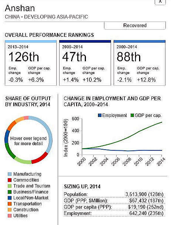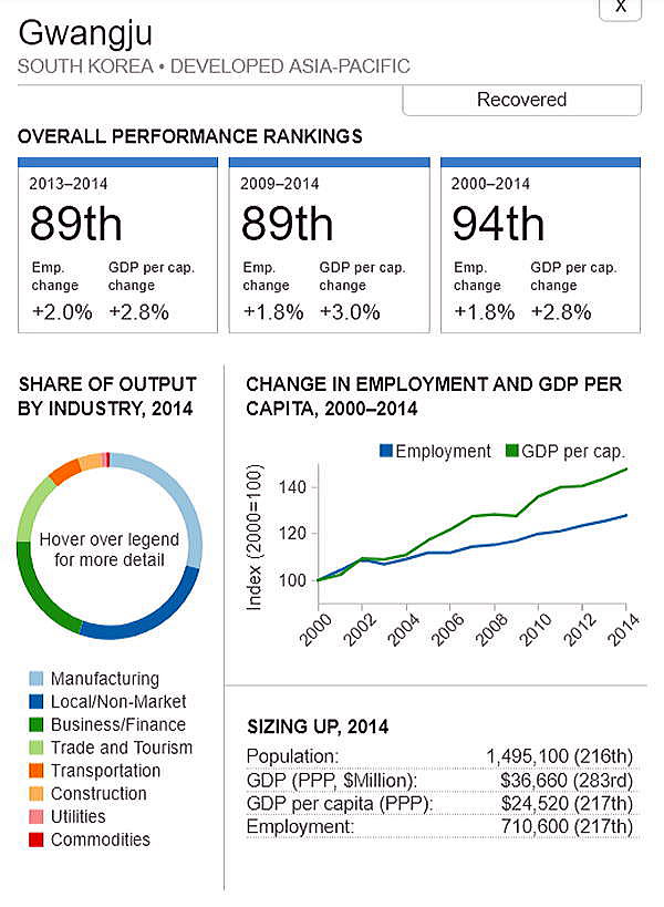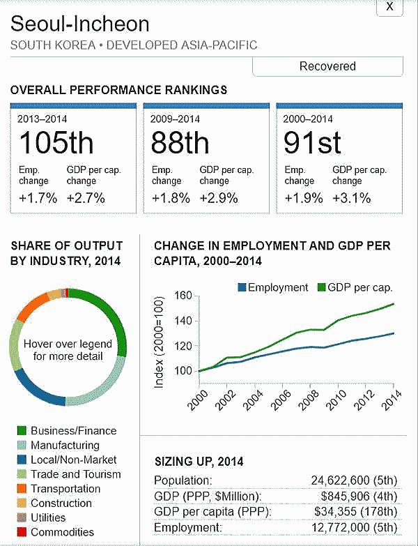 <世界300都市経済圏ランクマップ> 総合・一人当たりGDP・雇用 オリジナル出典:米国ブルッキングス研究所 第51位〜第100位 調査結果(総合、2000年〜2014年)を見てみます。 コロンビア ボゴタ都市圏(51位/300) ![]() 中国 石家荘都市圏(52位/300) ![]() カザフスタン アルマティ都市圏(53位/300) ![]() 中国 太原都市圏(54位/300) ![]() 都市圏国家 シンガポール(55位/300) 青山、池田 ![]() インド ムンバイ大都市圏(56位/300) ![]() インドネシア ジャカルタ大都市圏(57位/300) ![]() サウジアラビア リヤド市(58位/300) ![]() エジプト カイロ都市圏(59位/300) ![]() ペルー リマ都市圏(60位/300) ![]() インド カルカッタf大都市圏(61位/300) ![]() 中国 汕頭都市圏(62位/300) ![]() コロンビア メディリン都市圏(63位/300) ![]() フィリピン マニラ大都市圏(64位/300) 青山 ![]() オーストラリア パース都市圏(65位/300) 池田 ![]() トルコ アンカラ大都市圏(66位/300) 青山、池田 ![]() インド チェンナイ都市圏(67位/300) ![]() トルコ イズミール都市圏(68位/300) ![]() インド バンガロー都市圏(69位/300) ![]() サウジアラビア ジェッダ市・メッカ市(70位/300) ![]() ブラジル ブラジリア都市圏(71位/300) ![]() インド ハイデラバード都市圏(72位/300) ![]() 中国 大慶都市圏(73位/300) ![]() チリ サンチアゴ都市圏(74位/300) ![]() ブラジル ベロオリゾンテ都市圏(75位/300) ![]() ブラジル レシフェ都市圏(76位/300) ![]() ルーマニア ブカレスト都市圏(77位/300) ![]() 中華民国 桃園都市圏(78位/300) 青山 ![]() トルコ イスタンブール大都市圏(79位/300) ![]() ロシア サンクトペテルブルグ都市圏(80位/300) ![]() ロシア モスクワ大都市圏(81位/300) ![]() ブラジル クリティバ都市圏(82位/300) ![]() カナダ エドモントン大都市圏(83位/300) ![]() オーストラリア ブリスベン都市圏(84位/300) ![]() トルコ ブルサ都市圏(85位/300) ![]() ブラジル グランデ・ヴィトーリア都市圏(86位/300) ![]() アルゼンチン ブエノスアイレス都市圏(87位/300) ![]() 中国 鞍山都市圏(88位/300) ![]() イスラエル テルアビブビフ都市圏市第(89位/300) ![]() カナダ カルガリー都市圏(90位/300))..青山、池田 ![]() 韓国 ソウル市・仁川都市圏(91位/300)青山、池田 ![]() エジプト アレクサンドリア都市圏(92位/300) ![]() 韓国 太田都市圏(93位/300) ![]() 韓国 光州都市圏(94位/300) ![]() ブラジル サンパウロ都市圏(95位/300) ![]() ポーランド ワルシャワ都市圏(96位/300) 青山、池田 ![]() 中国 哈爾浜(ハルビン)都市圏(97位/300) ![]() メキシコ プエブラ都市圏(98位/300) 青山 ![]() モロッコ カサブランカ都市圏(99位/300)青山、池田 ![]() 中華民国 台中大都市圏(100位/300)青山、池田 ![]() つづく 101−150