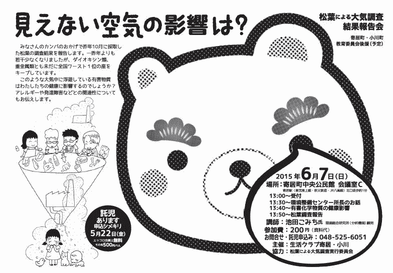 埼玉県が寄居町に設置した環境整備センターは、大型の複数の廃棄物焼却施設、10を超す最終処分場をもつ巨大な廃棄物処理処分センターです。 当然のことながら、周辺地域住民や食の安全を考える市民団体や生協は計画段階からこの施設の立地に反対してきました。 ![]() 出典:マピオン 大気{空気)中のダイオキシン調査監視活動は、1999年以降、全国各地で毎年行われています。すでに10万人以上が参加しています。 , 今回お送りしているのは、そのうちの首都圏の一部(埼玉県寄居町)です。 , 周知のように日本は世界一ゴミを燃やしている国です。 しかも、近年、せっかく分別しているプラスチックゴミを燃やす自治体が増えており、その結果、大気中のダイオキシン類や重金属類の濃度が上昇しています。 , 3.11以降、国民の環境問題の感心は放射能、放射線に集中していますが、ゴミ焼却は日本の津々浦々で毎日行わ れており、住民は空気を選ぶことはできないことから、住民は毎日それら有害物質を呼吸を通じ摂取していることになります。 , この活動は、常緑樹の松葉の針葉を試料とし、それに含まれるダイオキシン類や重金属類を分析することにより、概ね年平均の濃度が調査でき、しかもその値と空気を直接測定して得られる値の相関係数も分かっていることから、市民参加により空気中の有害化学物質を調査、監視し、国、自治体に改善のための政策提言を行うことを目的としています。 ![]() |