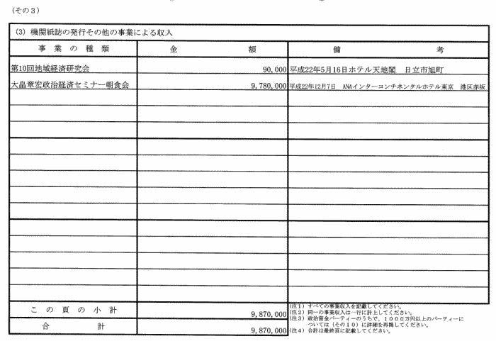 ![]() 大畠議員関係団体の政治資金収支報告書をみると、上記の「朝食会」以外にも、比較的大きなものとして電力・電機関係と思われるものや出身大学の都市大学長(元は武蔵工業大学)からも50万円の寄附がある。 ●大畠章宏: 2,373,300 ●幡谷祐一: 1,000,000 会社役員 水戸市常磐町2-8-11 茨城県信用組合 理事長 ●中村英夫 500,000 大学教授 世田谷区玉堤1-28-1 さらに以下は大畠議員の政治資金収支報告に関連する情報である。 ■政党交付金使途等報告書 平成22年分 定期公表 http://www.soumu.go.jp/senkyo/seiji_s/seijishikin/reports/KP08F20110930.html 収入は、民主党本部から10,000,000円のみ。 一方、支出は半分が人件費、半分がが家賃(細かい支出は他にもありますが)で「(株)友愛日立」に毎月31万円払っている。(日立市鹿島町1-11-13)(これとは別に毎月7万円の家賃を田口俊男氏、北茨木市磯原町本町2-3-11に払っ ている。) この会社名を検索したところ、朝日新聞・政治資金で家賃、それっていいの? 明細公表で対応二分 http://www.asahi.com/special/minshu/TKY201012010207.html?ref=reca という記事に、大畠氏の事務所がこのビルに移転したのは06年11月。売却を希望する当時の持ち主の意向で、大畠氏の妻名義で購入し、妻に家賃を支払ってきた。ところが、06年末から07年にかけて事務所費問題が注目され、「妻への家賃支払いで疑惑を持たれては」と、ビル所有のための会社を新設することになっ た。 会社は「友愛日立」。地元事務所の幹部、大畠氏を支援する日立労組の幹部、税理士の3人が出資し、08年12月に設立された。事務所や不動産登記によると、その直後に地元の信用組合から2700万円を10年ローンで借り入れ、大畠氏の妻からビルを買い取った。大畠氏はローンの連帯保証人になっているという。 という記載がありました。自分に払っているようなものだ。 民主党本部から来た1千万円をほとんど使い切っているので、それに合わせて人件費と家賃を決めたのだと思われる。 つづく |