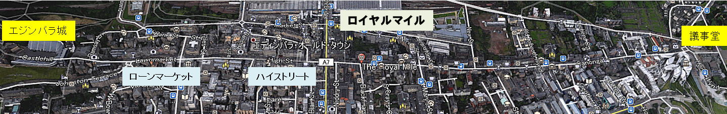 | スコットランド総目次へ 悲劇の女王、メアリー・スチュアートの生涯 スコットランド基礎知識 なぜ、スコットランドか 東京からエディンバラへ リンリスゴー到着 エディンバラ予備視察 ロイヤル・マイル1 ロイヤル・マイル2 ロイヤル・マイル3 再独立に燃える議会 スコットランド議会1 スコットランド議会2 ◆ロイヤル・マイルーはじめに 以下は前述内容と重なりますが、敢えてそのままとします。 実質初日、宿泊先から雨のリンリスゴー城を短時間訪問後、わたくしたちはスコットランドの首都、エディンバラ市の旧市街に車で向かいました。 エディンバラ城周辺には駐車場が少なく四苦八苦しましたが、何とかエディンバラ市役所の地下駐車場を探し、そこにレンタカーを停めることができました。 エディンバラ市の旧市街の中心は、エディンバラ城からホーリー・ルードやスコットランド国会議事堂までの通称、ロイヤル・マイル(Royal Mile)と呼ばれる約1マイルの道の両側にあります。 私たちはエディンバラ滞在中、このロイヤル・マイルを何度となく、行き来しました。 ロイヤルマイルには、起点(エディンバラ城)と終点(ホーリー・ルードやスコットランド国会議事堂)の間に、さまざまな歴史的遺跡、建築物、教会があるとともに、ロイヤルマイルと交差する大小の数々の道路や路地にも、スコットランド国立博物館、大小さまざまな博物館、美術館、多くのカフェがびっしりとあり、いかにも中世の都市さながらの景観や雰囲気を味わうことができます。 下の写真はエディンバラ城とロイヤルマイルを中心としたエディンバラの歴史的景観です。おそらくこの景観は、中世から現在までその骨格、構成は変わっていないと思えます。 ![]() Source:Wikimedia Commons 以下はそのロイヤル・マイルの概要紹介です。 出典は主に English Wikipedia です。 ◆ロイヤル・マイルの概要 ![]() ロイヤルマイルはエディンバラ市の中心にあり、 世界遺産の一部となっています ※エディンバラ市評議会公式Web ※エディンバラ旧市街協議会 ロイヤルマイル(Royal Mile)はエディンバラ市旧市街の主要な道を形成する一連の通りに与えられた名前です。この名前は、1901年、W Mギルバートのエディンバラで初めて使用され、1920年に出版されたガイドブックのタイトルとしてさらに普及しました。 ロイヤル・マイルのコース名は、スコットランドの歴史の中でふたつの重要な場所、すなわちエディンバラ城とホリールード宮殿の間を通る、およそ1マイル続く長い道を指しています。 以下の街路図は、エディンバラのロイヤル・マイルの全貌です。 左側の始点にエディンバラ城があり、右側の終点にホーリールードとスコットランド議事堂があります。 |