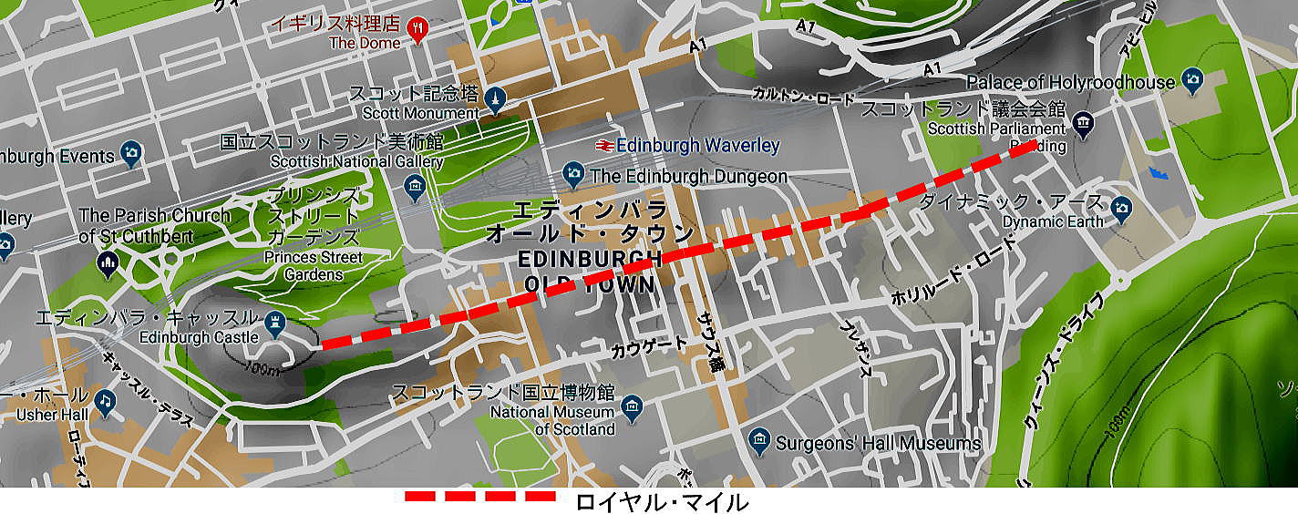 | ロイヤルマイルを構成する通りの部分は、上の地図にあるように、西から東へ、キャッスルヒル、ローンマーケット、ハイストリート、キャノゲート、修道院の各道路があります。 ロイヤル・マイルはニュータウンのプリンセス通りに匹敵する旧市街で最も繁華街の通りです。またロイヤルマイルは、エディンバラ市の中心部にあり、世界遺産の一部となっています。 ※ニュータウンのプリンセス通り エディンバラの目抜き通り。由緒あるデパートを始め、ウールやキルト 専門店、ファッション、レストランなどが密集し、洗練された活気に溢 れています。通りの南側には建物がなく、オールドタウンやエジンバラ城 がパノラミックに広がります。 下の写真は旧市街のトロン・カークの前を通り、ロイヤル・マイル通りの東方向を撮影したものです。たくさんの歴史的建築物、建造物が所狭しと並んでいることがわかります。 ![]() 旧市街のトロン・カークの前を通り、ローヤル・マイル通りの東方向を見たところ。 Source:Wikimedia Commons ◆ロイヤル・マイルの地理 数千年前の氷床が後退したことにより、エディンバラ城が建てられている堅い岩でできた火山の火口の後ろ側に氷の残骸を堆積させ、その結果、独特の岩と尾のような形状が形成されました。 ロイヤル・マイルは、岩の東側(城の岩)を走って、穏やかにホーリー・ルード宮殿に向かう尾根にあります。 主要な幹線道路から数多くの高地(または建物の建物)の間を行き来する急峻な路地があります。このルートは、宮殿の海抜42メートルの標高から、城の標高109メートルまで平均4.1%の勾配で走っています。 ◆キャッスル・エスプラネードとキャッスルヒル ![]() キャッスルヒル Source:Wikimedia Commons キャッスルヒルは、ディンバラ城近くのローヤルマイルの一部です。旧ヴィクトリア朝教会の建物はハブと呼ばれ、エディンバラ国際フェスティバルの案内所(インフォメーション・サービス)となっています。 右側には、スコッチ・ウィスキー体験施設があり、左側にはカメラ・オブスキュラ・タワーと店が並んでいます。 ※:カメラ・オブスキュラ・タワー( Tower & Camera Obscura) カメラ・オブスキュラ・タワーは、エディンバラを代表する人気の観光 スポット。もともと商業施設として1856年に建てられた展望台「アウト ルック・タワー」に「カメラ・オブスキュラ」を備えたアトラクションです。 カメラ・オブスキュラ・タワーは、ホリールードハウス宮殿まで続くロイ マイルの歴史的な石造りの建物が並ぶエディンバラの代表的な観光 スポット「ロイヤル・マイル沿いにあり、エジンバラ城に近いスコッチウイ スキー博物館(The Scotch Whisky Experience)の反対側にあります。 ※スコッチ・ウイスキー・エクスペリエンス (The Scotch Whisky Experience) スコッチ・ウイスキーに関する博物館。電動カートに乗りながら、ウイス キーの歴史や蒸留の工程などを楽しく学ぶことができます。テイスティ ングも楽しみの1つ。併設されているショップでは270種類以上のウイス キーを取扱っている。館内レストランでスコットランド料理も味わえます。 ![]() ハブ(The Hub)の位置 Source:Wikimedia Commons エスプラネードは、1753年にロイヤル・エクスチェンジの建物(現在はシティ・チェンバース)の建物を利用してパレード・グラウンドとして設計されました。 それは1816年に公式化され、装飾された手すりと壁が広げられています。 いくつかのモニュメントを持つエスプラネード(Esplanade)は、「スコットランドの歴史」に登場します。それは特別に設計された一時的なイベント会場が建てられるエディンバラ・ミリタリー・タトゥーの会場となっています。 ※エスプラネード エジンバラ城前の広場です。 エスプラネーについてはエディンバラ城も参照下さい。 ![]() エディンバラ・ミリタリー・タトゥーの会場 出典:グーグルアース3D展開 キャッスル・エスプラネードから、キャッスルヒルと名付けられた短い区間は、以前トールブース・ハイランド・セント・ジョンズ教会が管理していました。現在、それらはエディンバラ国際フェスティバル・ソサエティの本部 - ハブ(The Hub)、 Outlook TowerとCamera Obscuraの北側にあります。 つづく スコットランド総目次へ |