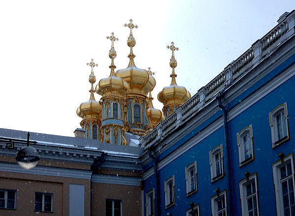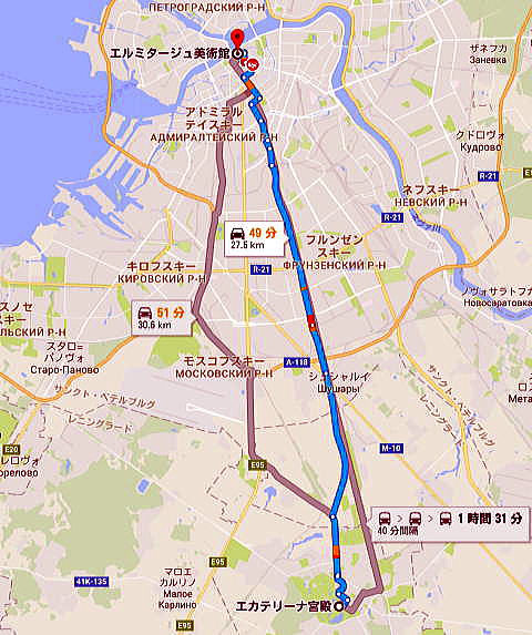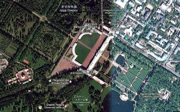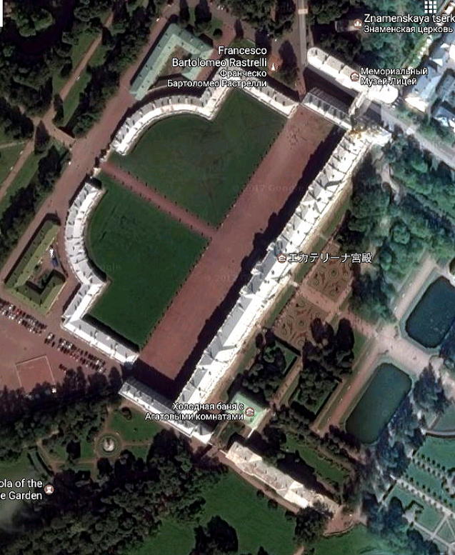 | ロシア短訪・総目次に戻る ・エカテリーナ宮殿 エカテリーナ宮殿・行き方 エカテリーナ公園1 エカテリーナ公園2 エカテリーナ宮殿・門と外飾 エカテリーナ宮殿・計画・外観 エカテリーナ宮殿・入り方 エカテリーナ宮殿・内部概要 エカテリーナ宮殿・内部概要2 ◆サンクトペテルブルグ市 ![]() ◆エカテリーナ(エチュカリーナ)宮殿 Catharine Palace ◆宮殿への行き方 エカテリーナ宮殿は、サンクトペテルブルク市中心部から南東25kmの郊外の避暑地ツァールスコエ・セローに存在するロシア帝国時代のロココ建築の宮殿です。現在この地はプーシキン市となっています。 ツァールスコエ・セロー (Царское Село)は、サンクトペテルブルク中心区の南方にあるロシア皇帝の離宮、エカテリーナ宮殿などが集まる避暑地を指します。 かつてはプーシキン市でしたが、現在はサンクトペテルブルク市プーシキン区となっています。サンクトペテルブルク歴史地区と関連建造物群の一つとして、世界遺産にも登録されています。 下のグーグルマップは、エルミタージュ美術館から車、電車でエカテリーナ宮殿に行く場合の地図です。車だと50分前後、電車だと1時間半かかることが分かります。 ![]() 出典:グーグルマップ サンクトぺテルグルグ市にいることを前提として、エカテリーナ宮殿に行くための一番簡単なのは半日ツアーに参加したり、タクシーで行くことですが、それなりにお金がかかるのと、どうしても見る時間が制限されます。そこで、少々面倒ですが、地下鉄を乗り継ぎ、最後は乗り合いタクシーに乗るのが一般的であり、よいと思います。 以下は地下鉄を乗り継いで行く具体的方法です。 たとえばネフスキー・プロスペクト駅などサンクトペテルブルク市中心部にある地下鉄の駅からエカテリーナ宮殿に行くには、まず青色M2の地下鉄に乗り終点のモスコフスカヤ(モスコフスキー)駅へ行きます。 下のグーグルマップでは、左上にモスコフスカヤ(モスコフスキー)があり、真ん中下に目的のエカテリーナ宮殿があるプーシキン市があります。地下鉄の終点駅から宮殿近くまでは距離にして10km弱あるので、歩くのは時間がかかりすぎます。 ![]() 出典:グーグルマップ そこで、地下鉄のモスコフスカヤ(モスコフスキー)駅からエカテリーナ宮殿まで行くには、乗り合いタクシーのマルシュルートカ(K299)に乗るのが便利です。マルシュルートカは乗り合いタクシーです。白タクではありません。 料金は600円前後のはずです。 ![]() マルシュルートカ Source:Wikipedia 下図の中央にある白い建築物などが、目的のプーシキン市にあるエカテリーナ宮殿です。通常、バスや乗り合いタクシーは、下の写真の右上で降ろされます。この後、宮殿中央にある入口まで歩きます。 宮殿の建物の前後は、大きな庭園が広がっています。今回は真冬だったので、一面真っ白でした。 ![]() 出典:グーグルアース ![]() 出典:グーグルアース 途中、進行方向左側に下の写真にあるプーシキン像が見えます。 ![]() プーシキン増 撮影:青山貞一 Nikon Coolpis S9900 2017-2 プーシキン像からかなり先に行くと、下の写真にあるエカテリーナ宮殿の北東端にある寺院の金色をしたタマネギ色の宮殿のいくつもの教会のドームが見えてきます。 ![]() 撮影:青山貞一 Nikon Coolpis S9900 2017-2 このエカテリーナ宮殿内の教会ドームはご覧のように大変素晴らしく、クレムリンなどにあるロシア正教会の大聖堂などの類似の玉ねぎ型ドームとは一味違います。 ![]() Купола дворцовой церкви Source::Russian Wikipedia By I, Sailko, CC BY-SA 3.0, Link つづく |