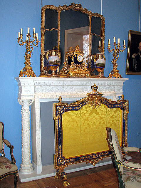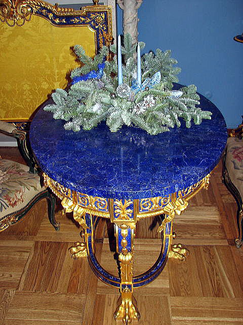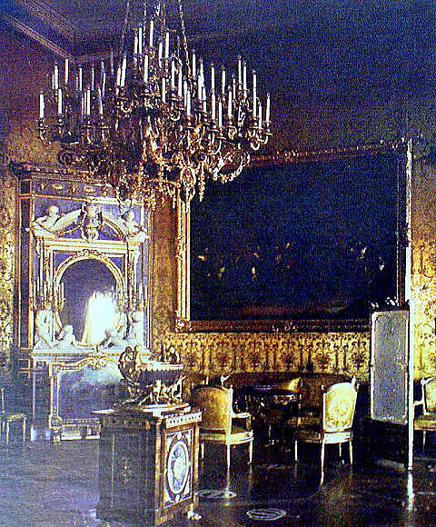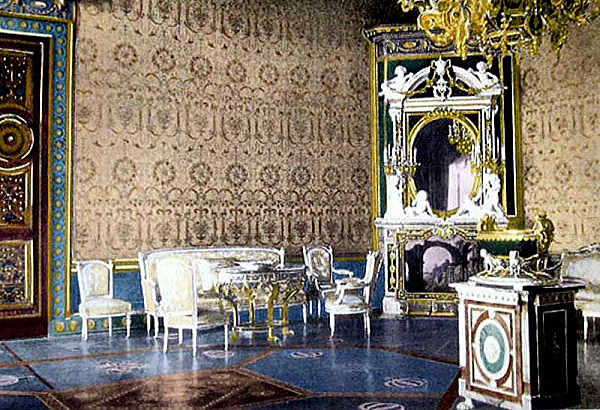| ロシア短訪・総目次に戻る ・エカテリーナ宮殿施設・内装 主階段 チャペル 大ホール1 大ホール2 緑の柱の間 中国青壁の間 アレクサンダー一世の間 瑠璃色の間 緑色ダイニング リヨンの応接間1 リヨンの応接間2 アラベスクの広間 給仕人の間 パントリー ダイニング 各部屋の暖炉 ◆サンクトペテルブルグ市 ![]() ◆エカテリーナ宮殿 リヨンの応接間(1) Lyon drawing room of the Catherine Palace http://eng.tzar.ru/museums/palaces/c_atherine/lyons_hall 以下はエカテリーナ宮殿のリヨンの応接間の写真です。 ![]() ツァルスコエ・セロー、エカテリーナ宮殿。1917年、リヨンの応接間にて。カラー写真化は、アンドレ・アンドレイェヴィッチ・ゼーストが1917年6月~8月に作成した物です。ツァルスコエ・セローの内装の写真は、G.K.ルコムスキー(暫定政府が設置した委員会で、ツァルスコエ・セロー宮殿の資産管理登録及び受入委員会の座長)に替わって行われたものです。 Source:Wikimedia Commons Андрей Андреевич Зеест - http://www.tsarselo.ru/content/0/read4880.html#.VGPR_mckQTB, パブリック・ドメイン, リンクによる エカテリーヌ宮殿のリヨンの広間は、これから内装の改装を行う予定となっています。現在、このリヨンの広間は、訪れるお客様を、戦前から生き残った家具と1878年にツァルスコエ・セロの大宮殿において、「リヨンの広間」(黄色の客間)と題してルイージ・プレマッツィが描いた水彩画の写しが歓迎してくれます。この絵はまさに19世紀半ばの輝きを表している作品です。 内装は二人の建築家が手がけました-チャールス・キャメロンと後のイッポリト・モニゲッティの二人です。ラピスラズリと、リヨンから取り寄せた豪華な絹織物の壁(部屋の名前の由来)があり、部屋は、1781年~83年にキャメロンが古典様式を取り入れて完成させました。 その後、キャメロンの仕事を非常に繊細に扱ったモニゲッティにより1848年から61年にかけて修復され、この部屋の視覚的なインパクトを強調しつつ新しい家具を加えていきました:両側に白い大理石のキューピッドを配置した暖炉の上の鏡と壁に取り付けたラピスラズリの突き出し燭台などです。 室内には、テーブル、植物を入れる花壇、装飾のある植木鉢、カーテン、花瓶などの台座、そして机などが沢山置かれていました。 モニゲッティはラピスラズリや青銅のメッキを施した84本の蝋燭が建てられる豪華なシャンデリアをデザインし、現在は失われてしますが、傑出した天井装飾として美しく完成しました。 建築家がリヨンの間のハイライトとしているおは、青銅メッキとラピスラズリで造られた家具のセットで、アレクサンダー2世の妻である女帝マリア・アレクサンドロヴナのモノグラムとしてユニークな特徴を備えています。 イニシャルは、1856年にピーターホフ・ラピダリー工房(Peterhof LapidaryWorks)から特別に依頼してつくらせたこれらの作品の所有者の印で、女帝の好きな宮殿の内部を飾るためのものです。 金色の斑点がちりばめられた豊かな深い色のアフガニスタンのラピスラズリは、金めっきされたブロンズの周りに見事に浮かび上がっています。 ![]() ツァルスコエ・セロー、エカテリーナ宮殿。1917年、リヨンの応接間にて。カラー写真化は、アンドレ・アンドレイェヴィッチ・ゼーストが1917年6月~8月に作成した物です。ツァルスコエ・セローの内装の写真は、G.K.ルコムスキー(暫定政府が設置した委員会で、ツァルスコエ・セロー宮殿の資産管理登録及び受入委員会の座長)に替わって行われたものです。 Source:Wikimedia Commons By Андрей Андреевич Зеест - http://visualhistory.livejournal.com/200025.html, Public Domain, Link ![]() ツァルスコエ・セロー、エカテリーナ宮殿の内部と家具の展示。リヨンの応接間からの品々。暖炉のスクリーン(リヨンの絹、ラピスラズリ、金箔を貼ったブロンズ)。設計は、I.A.モニゲッティ。ロシア、ペテルゴフ、宝石細工工房、1860年代。リオンの応接間のインテリアはチャールス・キャメロンが1770年代に造ったものです。それをI.A.モニゲッティが1860年代に改めて設計し直しました。大祖国戦争の間に完全に破壊されましたが、ツァルスコエ・セローから分けて疎開させていた品々は被害を免れました。 Source:Wikimedia Commons By Andrey Korzun - Own work, CC BY-SA 4.0, Link ![]() ツァルスコエ・セロー、エカテリーナ宮殿の内部と家具の展示。リヨンの応接間からの品々。青金石の小卓(ラピスラズリ、金箔を貼ったブロンズ)。設計は、I.A.モニゲッティ。ロシア、ペテルゴフ、宝石細工工房、1860年代。リオンの応接間のインテリアはチャールス・キャメロンが1770年代に造ったものです。それをI.A.モニゲッティが1860年代に改めて設計し直しました。大祖国戦争の間に完全に破壊されましたが、ツァルスコエ・セローから分けて疎開させていた品々は被害を免れました。 Source:Wikimedia Commons By Andrey Korzun - Own work, CC BY-SA 4.0, Link ![]() ツァルスコエ・セロー、エカテリーナ宮殿の内部と家具の展示。リヨンの応
