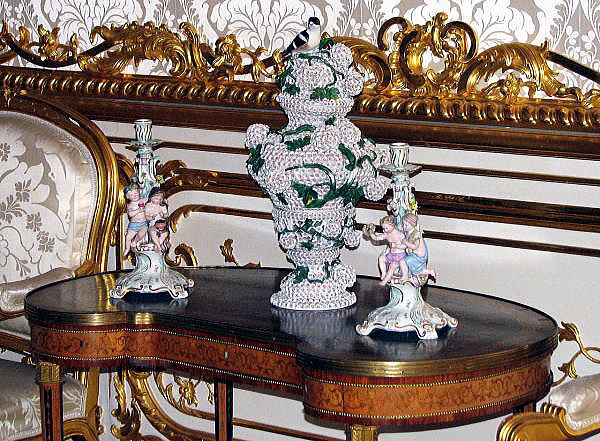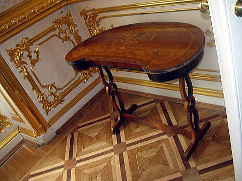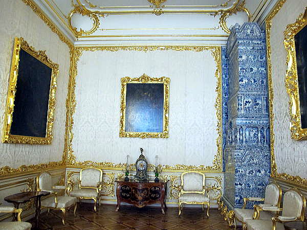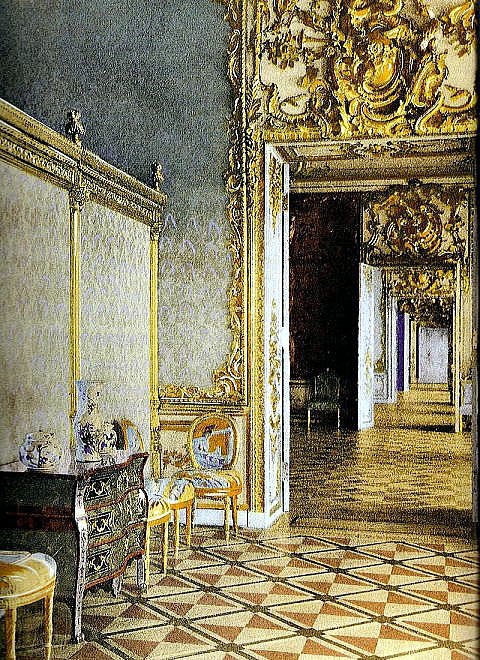 | ロシア短訪・総目次に戻る ・エカテリーナ宮殿施設・内装 主階段 チャペル 大ホール1 大ホール2 緑の柱の間 中国青壁の間 アレクサンダー一世の間 瑠璃色の間 緑色ダイニング リヨンの応接間1 リヨンの応接間2 アラベスクの広間 給仕人の間 パントリー ダイニング 各部屋の暖炉 ◆サンクトペテルブルグ市 ![]() ◆エカテリーナ宮殿のパントリー Pantry of Catherine Palace http://eng.tzar.ru/museums/palaces/c_atherine/buffet_room ※パントリー=食器室、食品貯蔵室 パントリー(Pantry)は、キッチンの一部分あるいはキッチンに隣接して設けられる収納スペースです。食品や飲料のほか、日常使う頻度の少ない調理器具や什器類をストックするために利用されます。 食品貯蔵庫や食器室とも呼ばれます。多くの場合、北半球では日光を避けるために北や東の方向に作られる場合が多いようです。 ![]() ツァルスコエ・セロー、エカテリーナ宮殿。1917年、パントリー(食器室/食料貯蔵室)にて。カラー写真化は、アンドレ・アンドレイェヴィッチ・ゼーストが1917年6月~8月に作成した物です。ツァルスコエ・セローの内装の写真は、G.K.ルコムスキー(暫定政府が設置した委員会で、ツァルスコエ・セロー宮殿の資産管理登録及び受入委員会の座長)に替わって行われたものです。 Source:Wikimedia Commons By Андрей Андреевич Зеест - http://visualhistory.livejournal.com/200025.html, Public Domain, Link ![]() ツァルスコエ・セローのエカテリーナ宮殿、パントリー。豆型のテーブル(サンクトペテルブルグ、1780年代) 中央- "Boule de neige"の形の磁器風味の花瓶(ガマズミの色々な品種の名前がある) 「ブール・ド・ネージュ」、すなわち「スノーボール」)。磁器燭台。マイセン磁器工場、1750年代。 Source:Wikimedia Commons By Andrey Korzun - Own work, CC BY-SA 4.0, Link 食器室はエカテリーナ宮殿の中で、女帝のプライベートな居住エリアに位置していました。そこは、かつて1761年までは、女帝エリザベートの支度部屋(着替え室)の一部でした。1800年代の半ば、この部屋は白のダマスク織りで二つに区切られ、後ろ側は、パーティの間、召使い達の食器部屋として使えるようになっていました。 食器部屋の現在の内装は、戦争中に破壊されたものを完全に回復しています。壁には、白い布を張り、彫刻と金箔を施した額で縁取りをしています。角の部分には、色絵を施したタイルが貼られています。 扉は、素敵なバロック風の彫刻に金箔を施したドア上の装飾で飾られていました。宮殿のパレードを行うグラウンドを見渡せる窓と窓の間の壁には、2つの突き出し燭台がついていて、彫刻と金箔で飾られた額に入れられた鏡がありました。 天井には、現在、非常に有名なイタリアの芸術家ピエトロ・ダ・コルトナ(1596~1669)の絵が描かれています。サンゴを捕まえる(Catching Corals)シーンを描いた絵は、戦後期に国立エルミタージュの在庫品からツァルスコエ・セローに移されました。 モノクロームで描く技法の2つの装飾的な作品には、花輪を持つキューピッドとイルカに乗るキューピッドを描いています。描かれている挿絵は、絡み合った新芽の形に造られた絶妙な化粧漆喰の額にはめ込まれています。 ![]() ツァルスコエ・セローのエカテリーナ宮殿。パントリー。ロココ様式の引き出し付きチェスト寄せ木細工装飾c(フランス、18世紀中頃) Source:Wikimedia Commons By Andrey Korzun - Own work, CC BY-SA 4.0, Link 右側にある青色の物体は、暖房器具です。 ![]() エカテリーナ宮殿、内装 Source:Wikimedia Commons I, Sailko, CC 表示-継承 3.0, リンクによる ![]() エカテリーナ宮殿、内装 Source:Wikimedia Commons Ljubimaja Muza - 投稿者自身による作品, CC 表示-継承 3.0, リンクによる つづく |