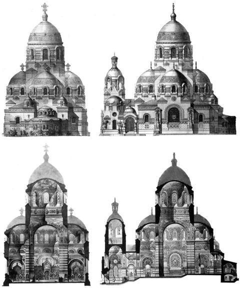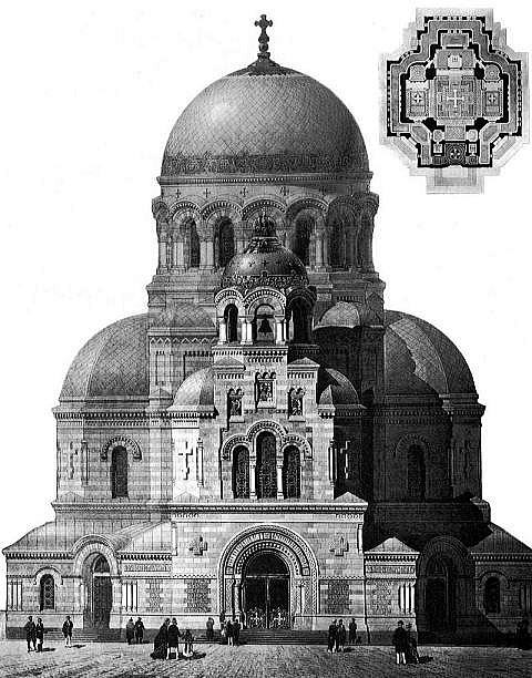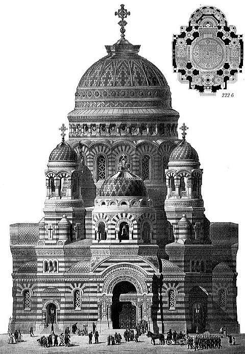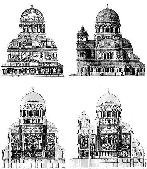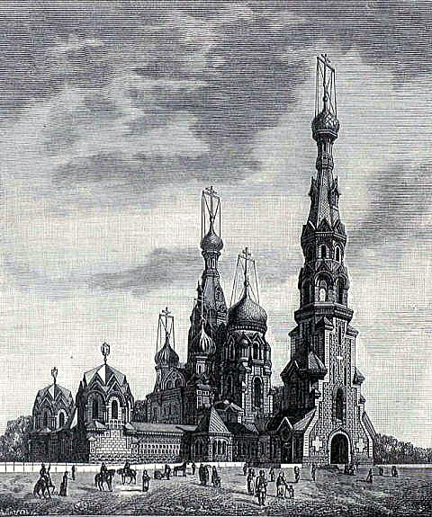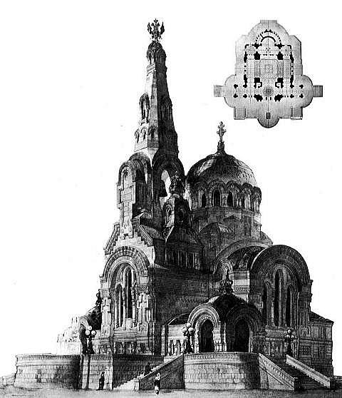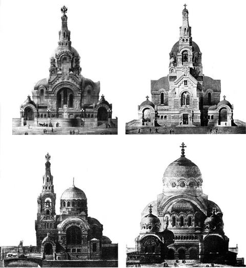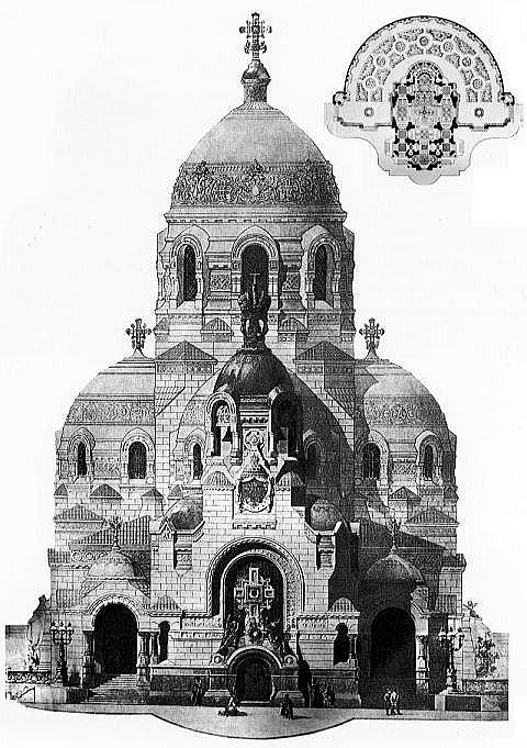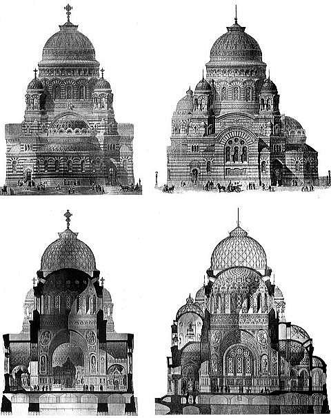 その一方で、教会は無数のトパーズ、青金石(ラピスラズリの原料)および他の半貴石で飾られていて豪奢な印象を与えているのも事実です。 イコノスタシスは、ヴィクトル・ヴァスネツォーフ(Viktor Vasnetsov)、ミハイル・ネステロフ(Mikhail Nesterov)、(ミハイル・ヴルーベリ)らを含む当時のロシア最高の芸術家たちによって設計されています。 主任設計士はアルフレッド・アレクサンドロヴィチ・パルランド(Alfred Alexandrovich Parland)である(彼の名前はロシアにおいてもほとんど知られていません)。 ![]() 建物の色があまりよく出ていませんが、地の上の救世主教会 Source: Wikimedia Commons 下の2枚の写真は、血の救世主教会の最も高い位置にある主塔とⅡ番目に高い位置にある副塔の拡大です。 ![]() サンクトペテルブルグにある地の上の救世主教会のキューポラ Source: Wikimedia Commons By Gzen92 - Own work, CC BY-SA 4.0, Link ![]() サンクトペテルブルグにある地の上の救世主教会のキューポラ Source: Wikimedia Commons 以下の2枚で一セットとなっている図面は、1882年に行われた血の上の救世主教会の設計競技(コンペ)で上位第一位から第四位の作品です。 ただし、実際に使われたのは以下の第一案ではなく、いわばそれぞれの案のいいとこ取りのように見えます(これは青山の私見)。 ![]() Antony Tomishkoによる血の上の救い主教会の設計案。 1882年の設計コンペ優勝作品 Source:Wikimedeia Commons ![]() ntony Tomishkoによる血の上の救い主教会の設計案。 1882年の設計コンペ優勝作品 Source:Wikimedeia Commons ![]() 血の上の救世主教会の設計案。 Ivan Bogomolov作品 1882年の設計コンペへの登録作品 Source:Wikimedeia Commons ![]() 血の上の救世主教会の設計案。 Ivan Bogomolov作品 1882年の設計コンペへの登録作品 Source:Wikimedeia Commons ![]() 血の上の救世主教会の設計案。 Ieronim Kitnerと, Alexander Huhn.の共同作品 1882年の設計コンペにおける次席作品 Source:Wikimedeia Commons ![]() 血の上の救世主教会の設計案。 Ieronim Kitnerと, Alexander Huhn.の共同作品 1882年の設計コンペにおける次席作品 Source:Wikimedeia Commons ![]() 血の上の救世主教会の設計案。 Victor Schroeterの作品 1882年の設計コンペにおける第四位の作品 Source:Wikimedeia Commons ![]() 血の上の救世主教会の設計案。 Victor Schroeterの作品 1882年の設計コンペにおける第四位の作品 Source:Wikimedeia Commons ![]() 血の上の救世主教会 Source:Wikimedeia Commons ![]() ロシア、サンクトペテルブルグの血の上の救世主教会大聖堂 Source:Wikimedeia Commons つづく |