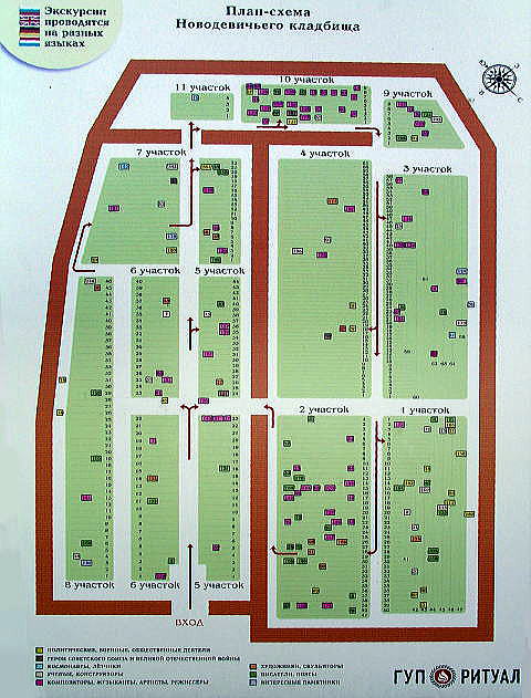 | ロシア短訪・総目次に戻る ・ノヴォデヴィチ女子修道院 概要・歴史 歴史2 建築・外装 内装 イコン 墓 ・ノヴォデヴィチ女子修道院併設 生神女就寝大聖堂 ◆モスクワ市の寺院 ![]() モスクワ市の紋章 墓地 他のモスクワの修道院と同様に、ノヴォデヴィチ修道院にも墓地が併設されています。 このノヴォデヴィチ墓地は、修道院の外側で、修道院の南側の外壁に隣接しています。1898年に造営が始まったこの墓地にはロシアにまつわる著名な人物が多数埋葬されています。 ◆ヴォデヴィチ女子修道院の墓 1898年に造営が始まったこのノヴォデヴィチ女子修道院には墓があり、ロシアにまつわる以下の有名な人物が多数埋葬されています。 これについては、ノヴォデヴィチ女子修道院の墓(ギャラリー)に多数の写真があります。 作家・詩人 ・アントン・チェーホフ ・ニコライ・ゴーゴリ ・イワン・ツルゲーネフ ・ヴェリミール・フレーブニコフ ・ウラジーミル・マヤコフスキー ・ミハイル・ブルガーコフ 音楽家 ・アレクサンドル・スクリャービン ・ドミートリイ・ショスタコーヴィチ ・セルゲイ・プロコフィエフ 政治家 ・ニキータ・フルシチョフ夫妻 ・アンドレイ・グロムイコ(「ミスター・ニエット」と呼ばれたソ連時代の外相) ・ボリス・エリツィン(ロシア連邦初代大統領) ・ヴャチェスラフ・モロトフ (スターリン時代にソ連の外交を指揮した政治家) ・ニコライ・ブルガーニン (日ソ共同宣言に署名した戦後のソ連首相) ・アナスタス・ミコヤン 思想家 ・ピョートル・クロポトキン 演出家 ・コンスタンチン・スタニスラフスキー(モスクワ芸術座結成メンバーの一人) 宇宙飛行士 ・パーヴェル・ベリャーエフ 技術者 ・セルゲイ・イリューシン アンドレーイ・トゥーポレフ その他 ・ナジェージダ・アリルーエワ(ヨシフ・スターリンの2番目の妻) ・セルゲイ・エイゼンシュテイン(モンタージュを編み出した映画監督) ・ライサ・ゴルバチョワ(ミハイル・ゴルバチョフ元ソビエト連邦書記長夫人) ・ガリーナ・ウラノワ(ソ連時代のバレリーナ) ・エフゲニー・フョードロフ ・ゾーヤ・コスモデミヤンスカヤ(独ソ戦でドイツ軍に処刑されたパルチザン女性) ◆ノヴォデヴィチ修道院の写真ギャラリー ![]() ノヴォデヴィチ修道院の墓地の入口 Source:Wikimedia Commons Автор: Brücke-Osteuropa - собственная работа, Общественное достояние, Ссылка 以下は墓地の見取り図です。墓地は修道院の敷地の外にあります。 ノヴォデヴィチ墓地のレイアウト(平面図) Source:Wikimedia Commons Автор: Moreorless - собственная работа, CC BY-SA 4.0, Ссылка ![]() ノヴォデヴィチ墓地の概要計画 Source:Wikimedia Commons ![]() ノヴォデヴィチ墓地。写真2012年4月11日 Source:Wikimedia Commons Автор: Владилен Медков - собственная работа, CC0 1.0, Ссылка ![]() スモレンスクの大聖堂の入り口にデニス・ダヴィドフと彼の孫ピーターの墓石 Source:Wikimedia Commons ![]() 墓地の壁遺骨安置 Source:Wikimedia Commons Автор: Ghirlandajo - собственная работа, CC BY 3.0, Ссылка ![]() モスクワのノヴォデヴィチ墓地、monumenの建設前のボリス・エリツィンの墓 Source:Wikimedia Commons ![]() 位于新?女公墓的奥斯特洛夫斯基墓 オストロフスキーのノヴォデヴィチ墓地の墓に位置 Source:Wikimedia Commons Автор: BreakdownDiode - собственная работа, CC BY-SA 4.0, Ссылка ![]() ノヴォデヴィチ女子修道院の墓地にある墓アレクセイ・ドミトリミルティン Source:Wikimedia Commons Автор: Andreykor - собственная работа, CC BY-SA 3.0, Ссылка ![]() ノヴォデヴィチ女子修道院の墓地にあるミハイルDukhovskoiの墓 Source:Wikimedia Commons Автор: Andreykor - собственная работа, CC BY-SA 3.0, Ссылка ![]() ノヴォデヴィチ女子修道院の墓地にあるニコライミルティンの墓 Source:Wikimedia Commons ![]() ノヴォデヴィチ女子修道院の墓地にあるアレキサンダーG. Koloshinの墓 Source:Wikimedia Commons ![]() ノヴォデヴィチ墓地 Source:Wikimedia Commons El Pantera - 投稿者自身による作品, CC 表示-継承 2.5, リンクによる ![]() 0088 - Moskau 2015 - Neues Jungfrauenkloster Source:Wikimedia Commons つづく |