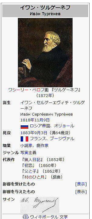 | ロシア短訪・総目次に戻る ◆ロシアの文豪 19世紀はロシア文学の黄金時代 プーシキン 写真ギャラリー ゴーゴリ 写真ギャラリー ツルゲーネフ 写真ギャラリー ドフトエフスキー 写真ギャラリー ト ルストイ 写真ギャラリー チェーホフ 写真ギャラリー ![]() ◆イワン・セルゲーエヴィチ・ツルゲーネフ Ивaн Серге?евич Тургенев ( 1818年11月9日 - 1883年9月3日) ![]() ワシーリー・ペロフ画 『ツルゲーネフ』(1872年) Source:Wikimedia Creative Commons